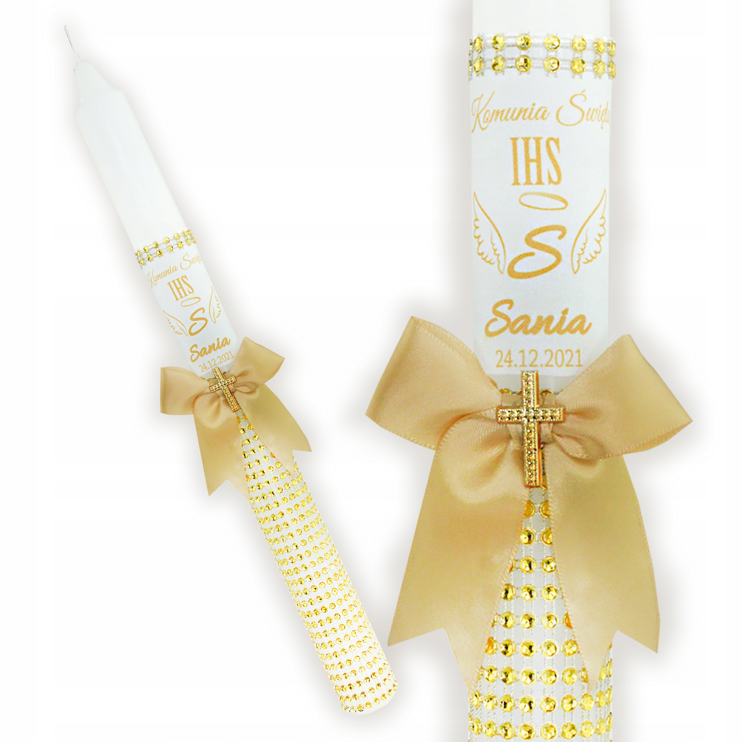 - це свічка, прикрашена золотим матеріалом, що імітує циркони, з атласним бантом ручної роботи, прикрашеним ніжним золотим хрестом.