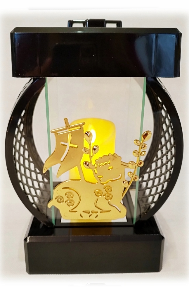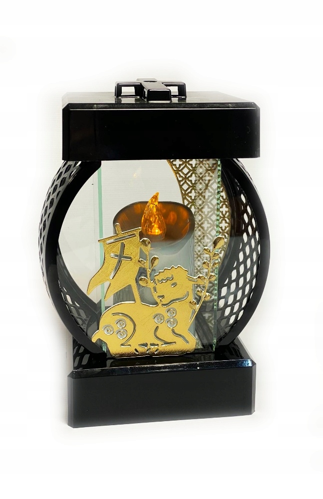 Красивий сучасний ліхтар з чорного пластику та скла. На лобовому склі є аплікація золотого ягняти. Знизу є дзеркало, яке додатково відбиває світло.