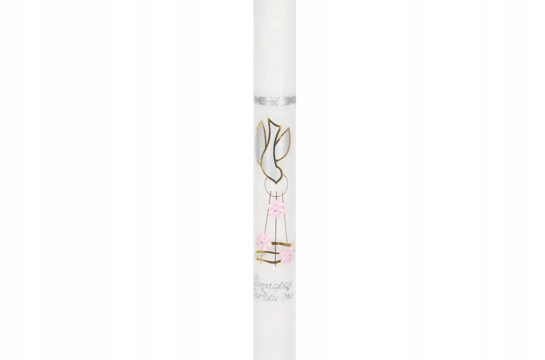 Свічка використовується під час церемонії хрещення, де її батьки чи хрещені батьки віддають її священику, який запалює його. Біла свічка з рожевими прикрасами з написом "сувенір хрещення"