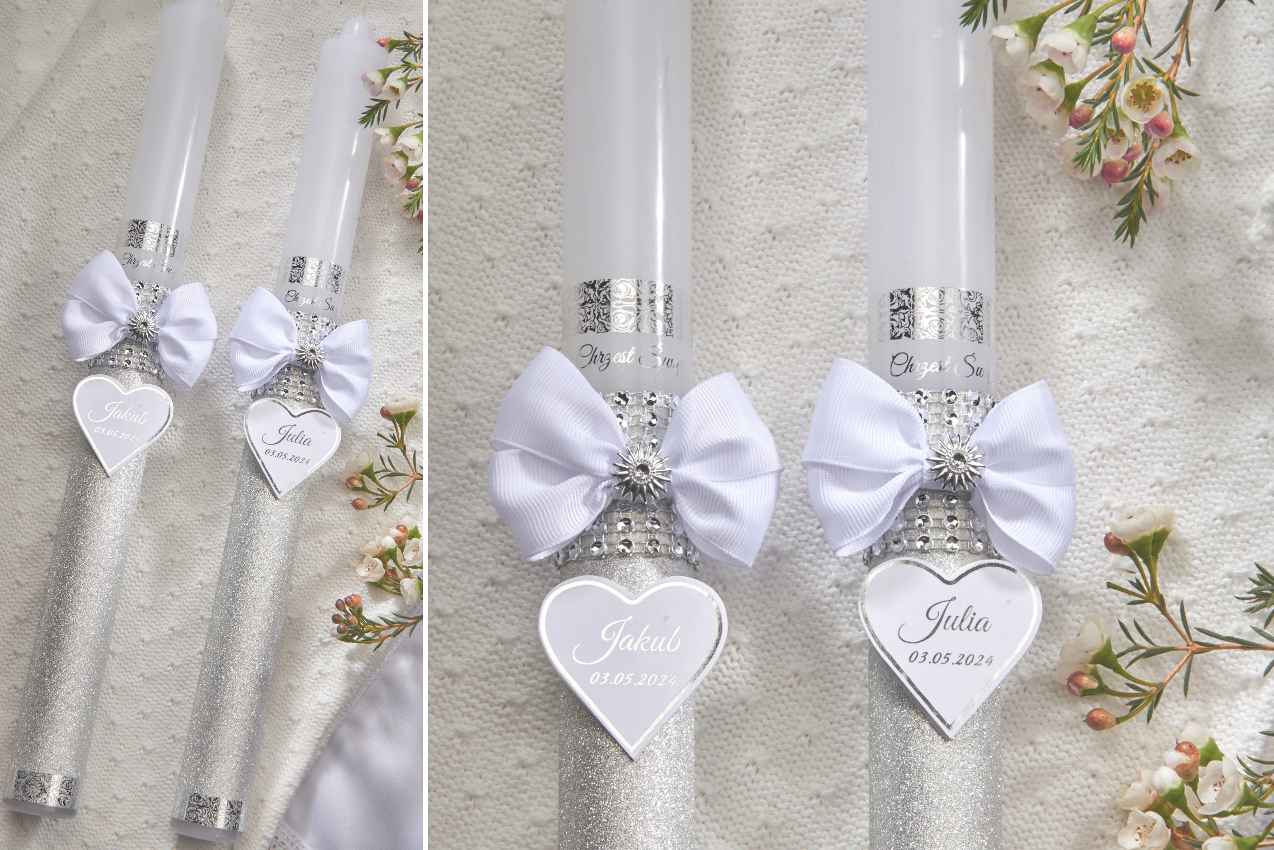 Свічка має сердечко з ім'ям і датою, написаними на серці та написом "Святе Хрещення", яке виконано методом гарячого тиснення (гарно мерехтливий сріблястий принт)