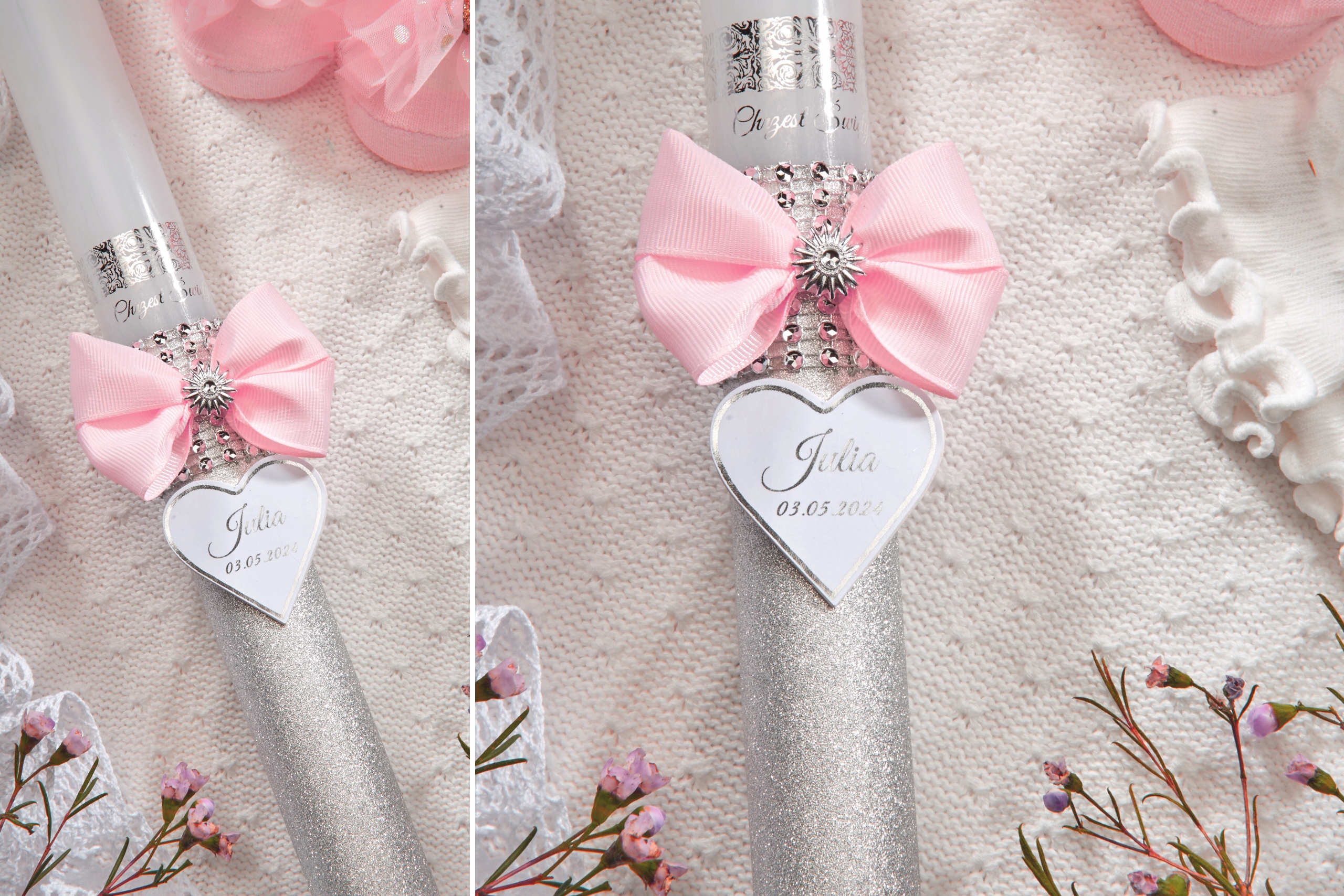 Свічка має сердечко з ім'ям і датою, написаними на серці та написом «Святе Хрещення», яке виконано методом гарячого тиснення (гарно мерехтливий сріблястий принт)