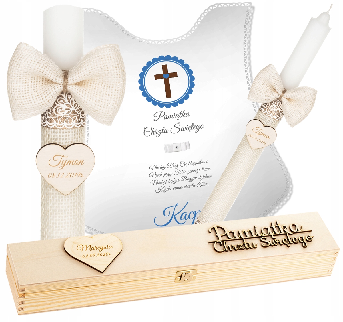 - декоративна дерев'яна коробка з додатковим гравіюванням з написом «Сувенір Святого Хрещення» та сердечком з ім'ям дитини та датою хрещення.