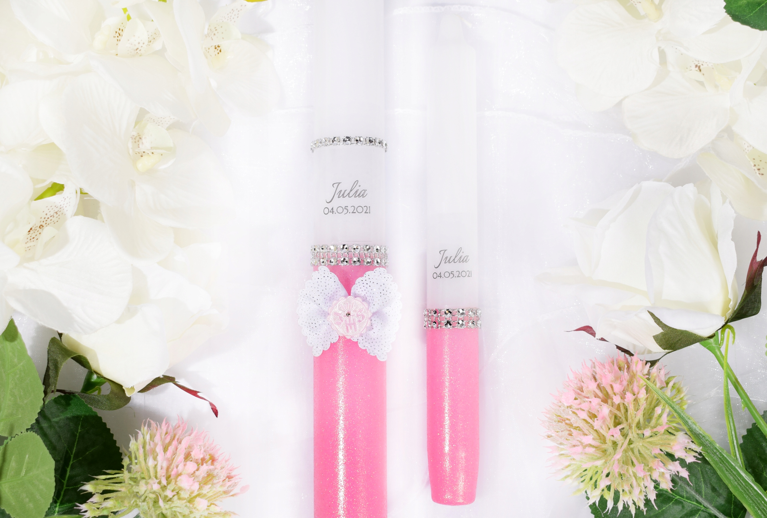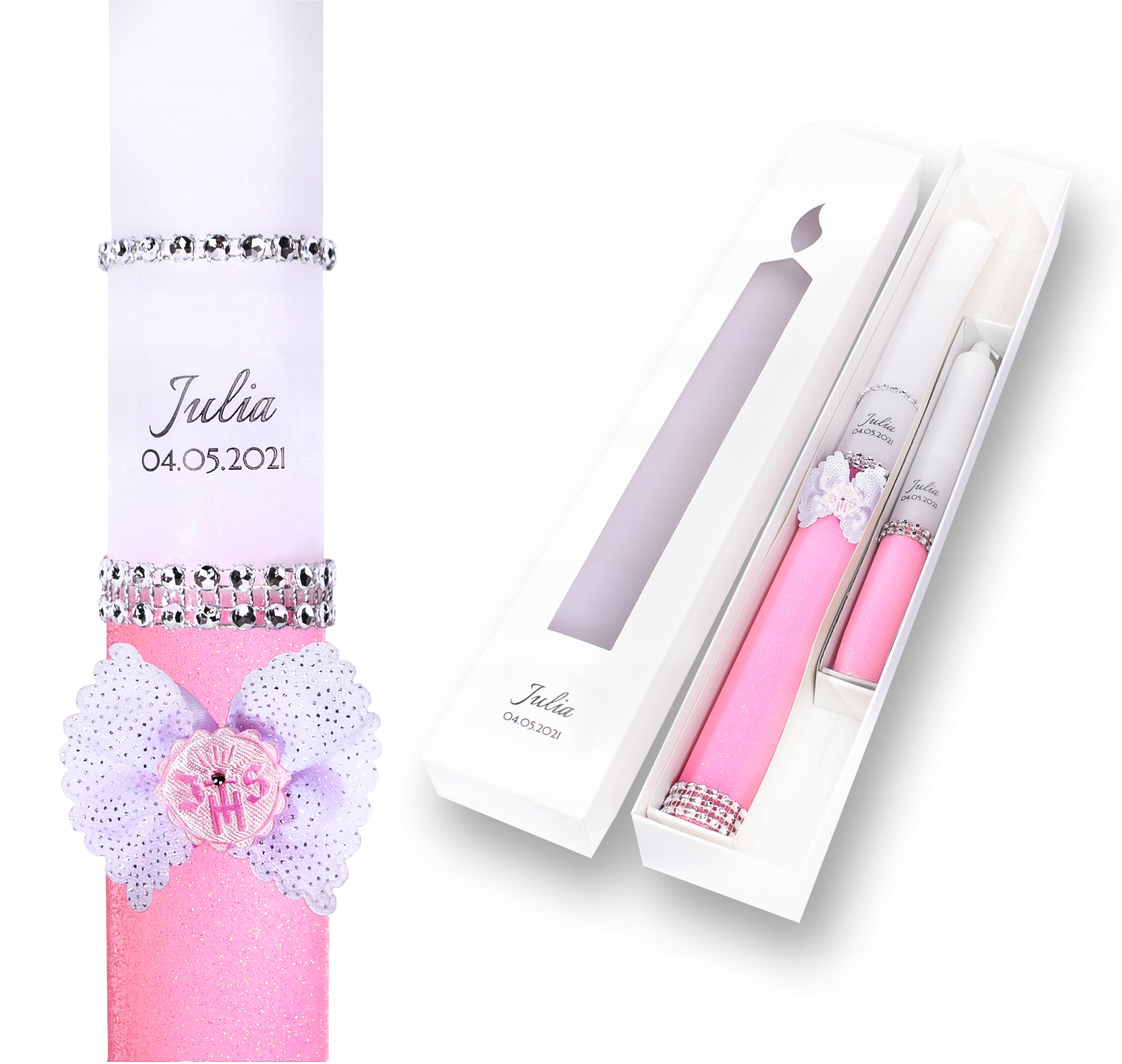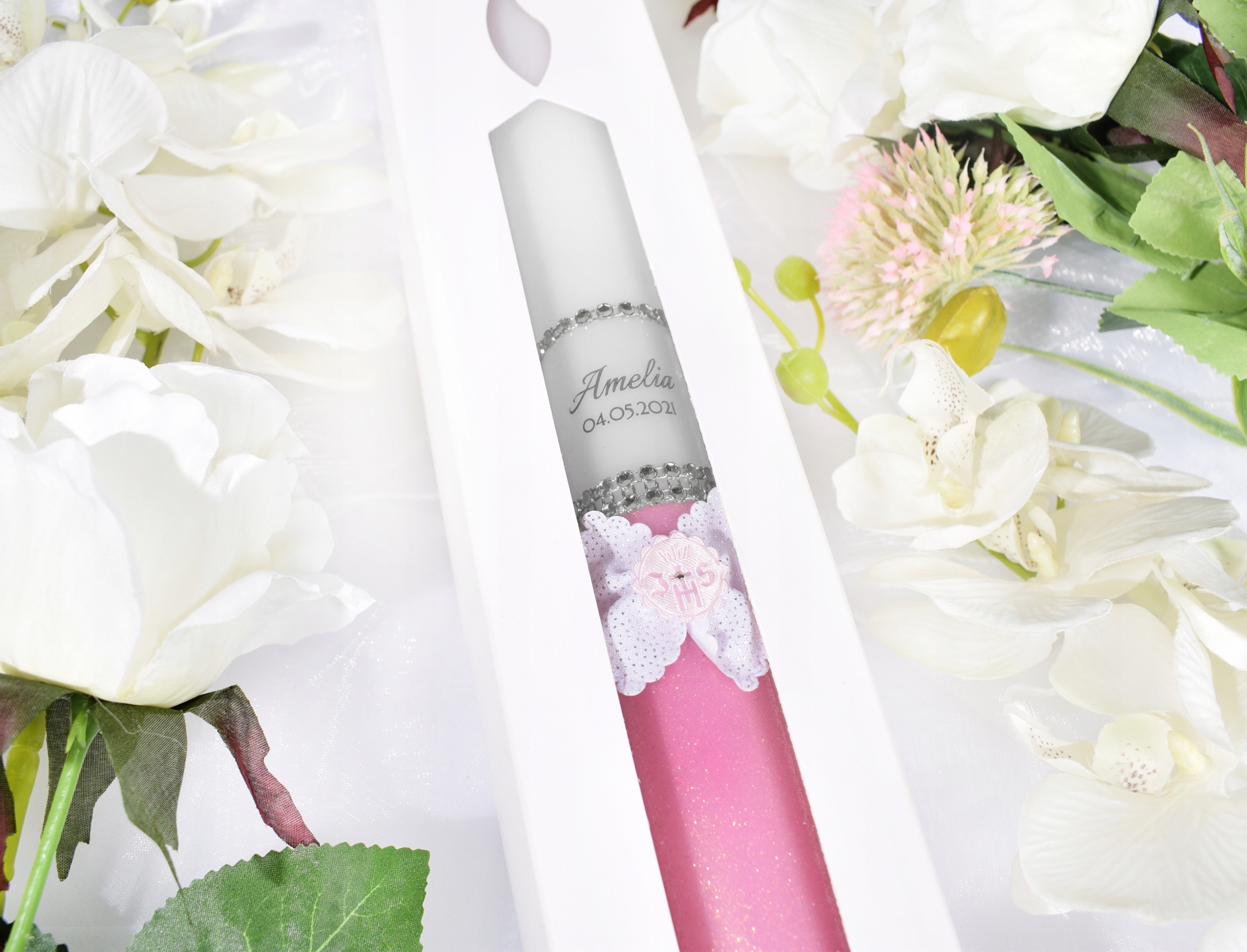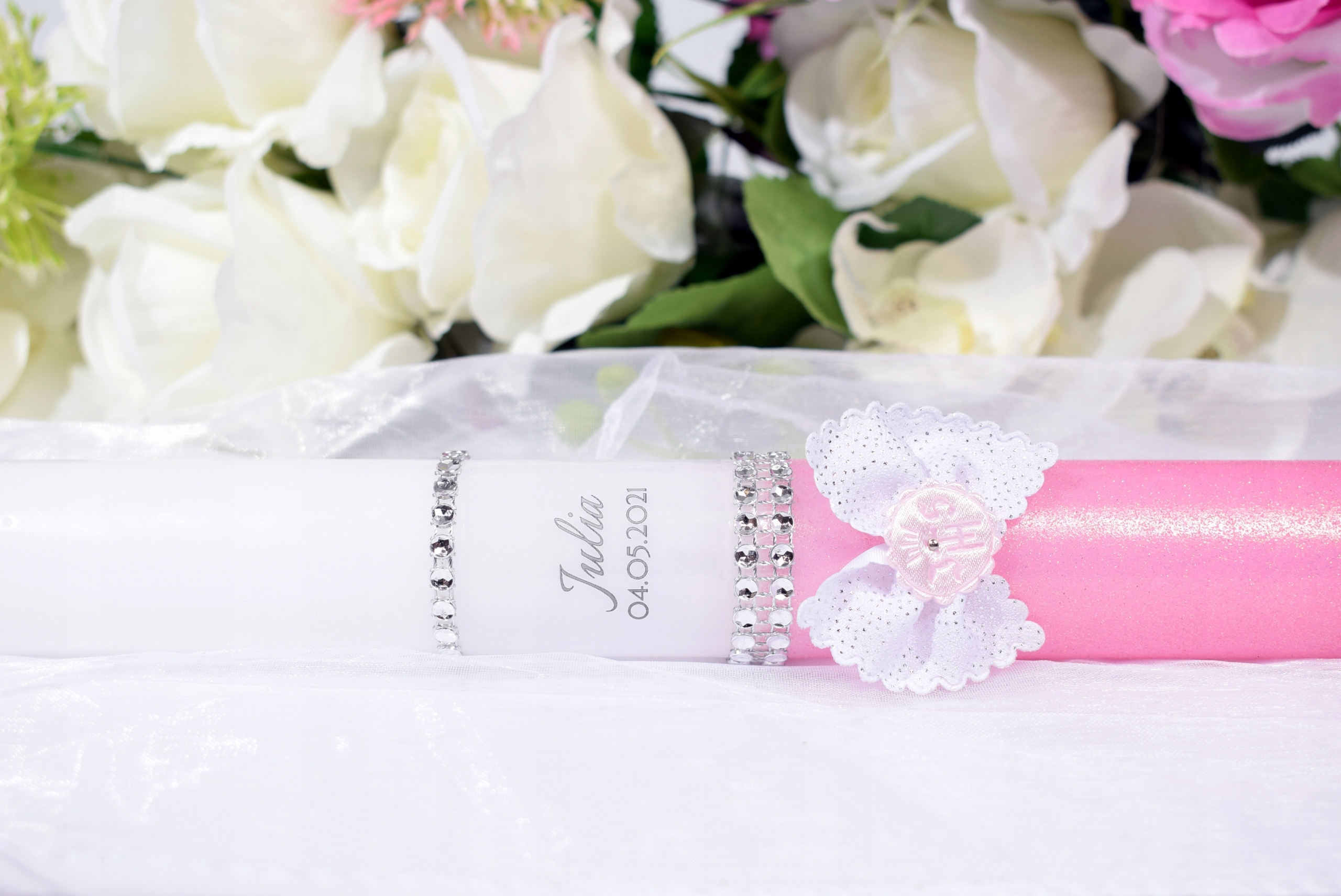 Свічка настільна, як і свічка для хрещення, виготовлена з парафінової структури рожевого кольору. і прикрашений зі смаком блискітками.