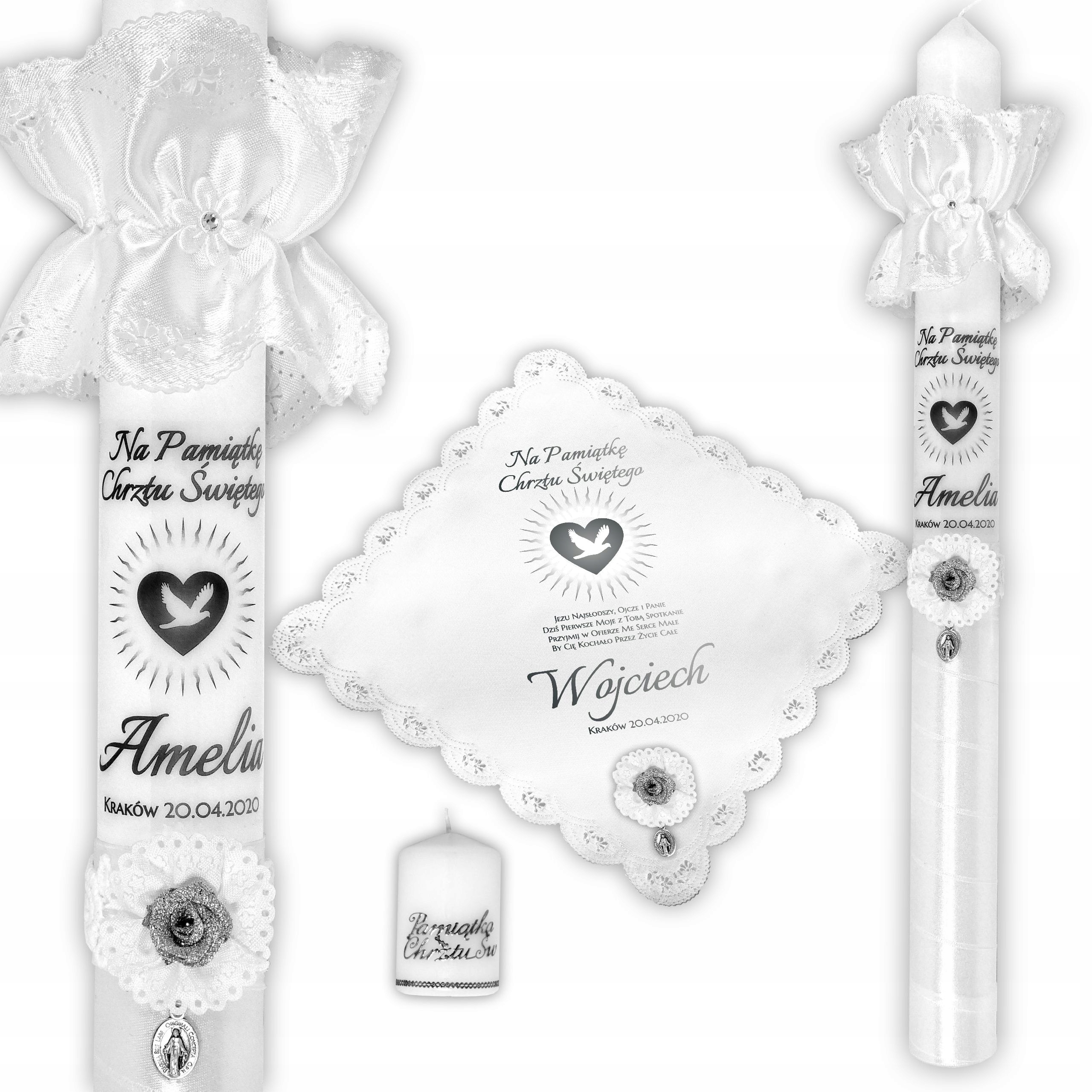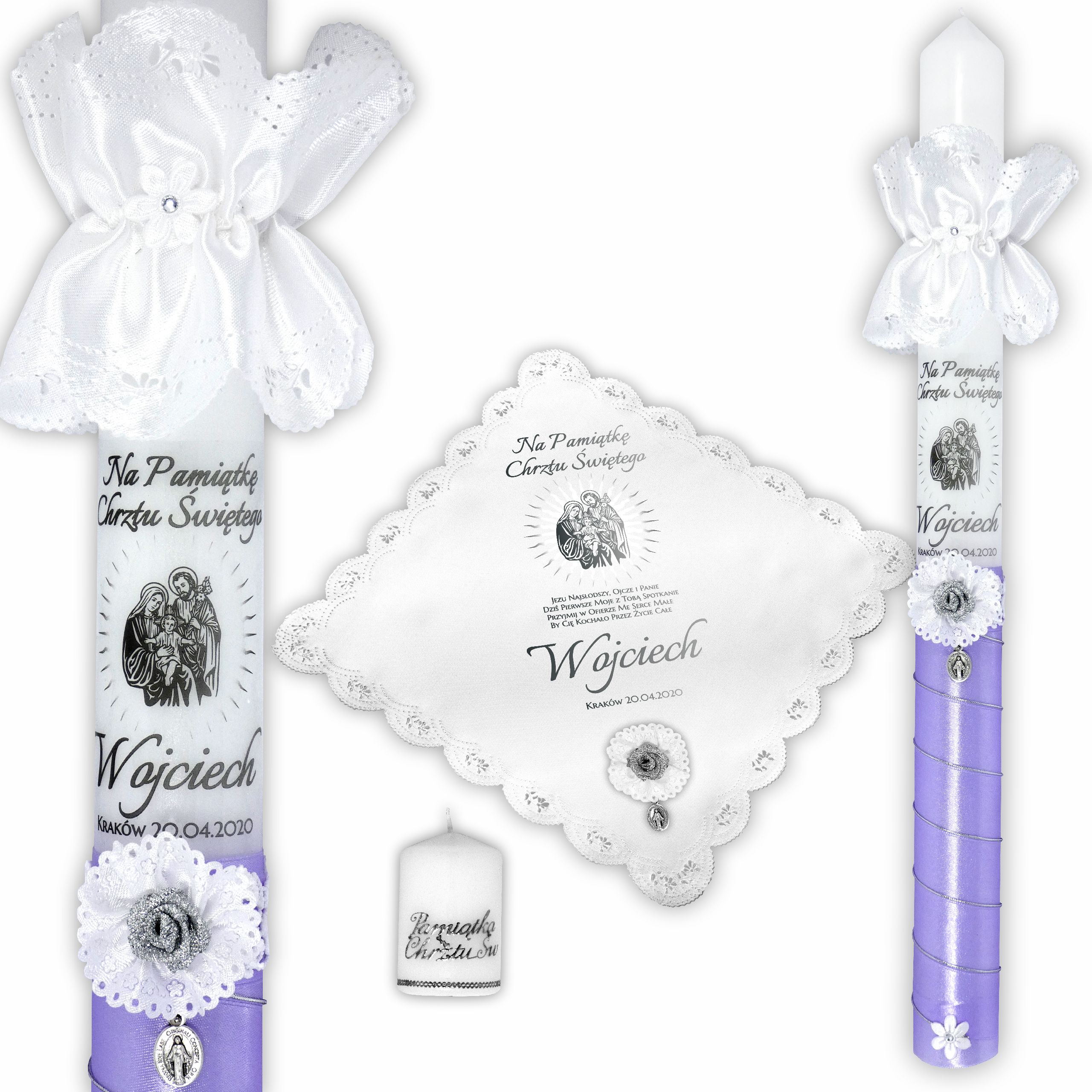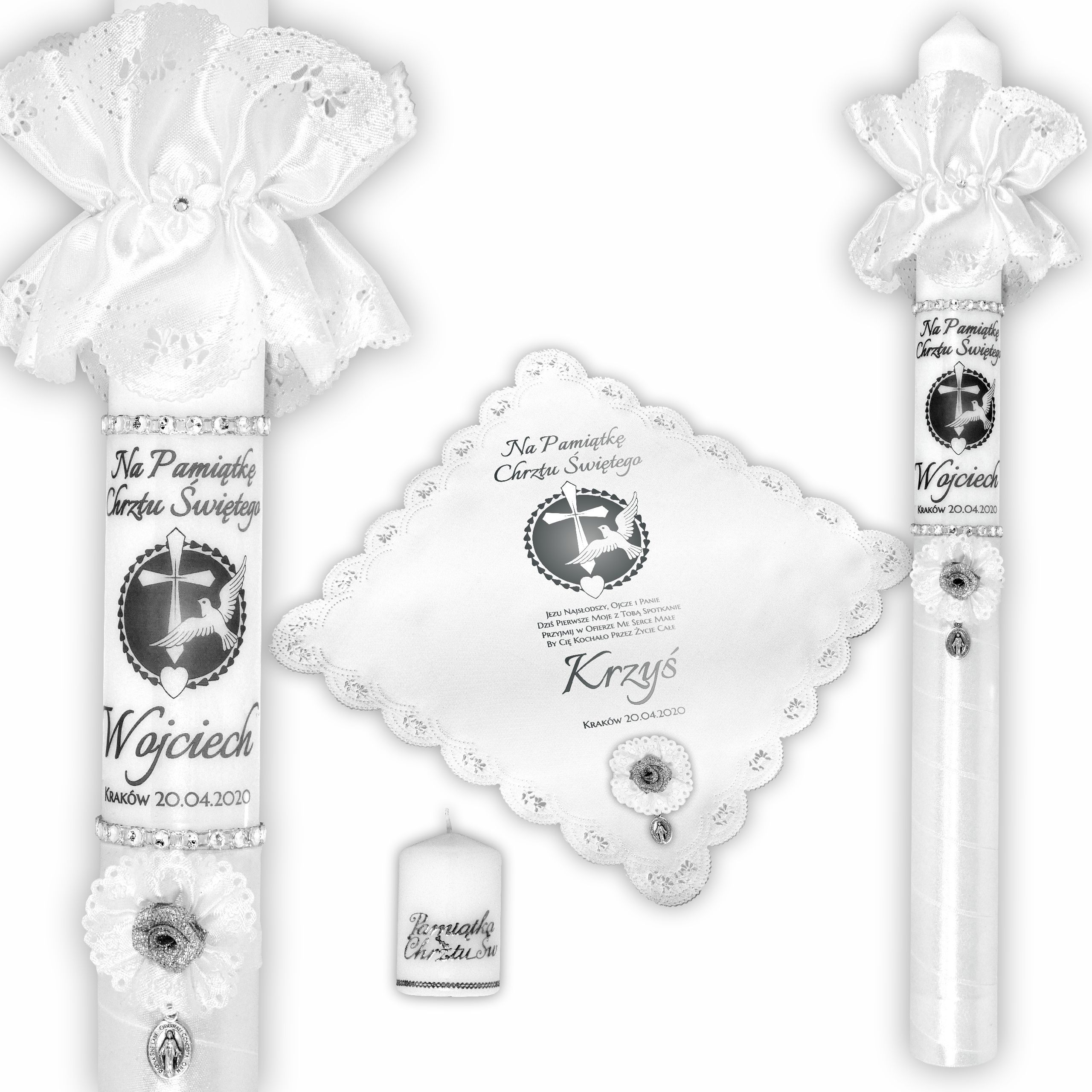 Дуже ніжний і універсальний набір для хлопчиків і дівчаток. Вишуканості свічки додає поєднання білої стрічки та атласу зі сріблястою блискучою трояндою та сріблястими написами. Все доповнюється ідеально підібраним срібним медальйоном.