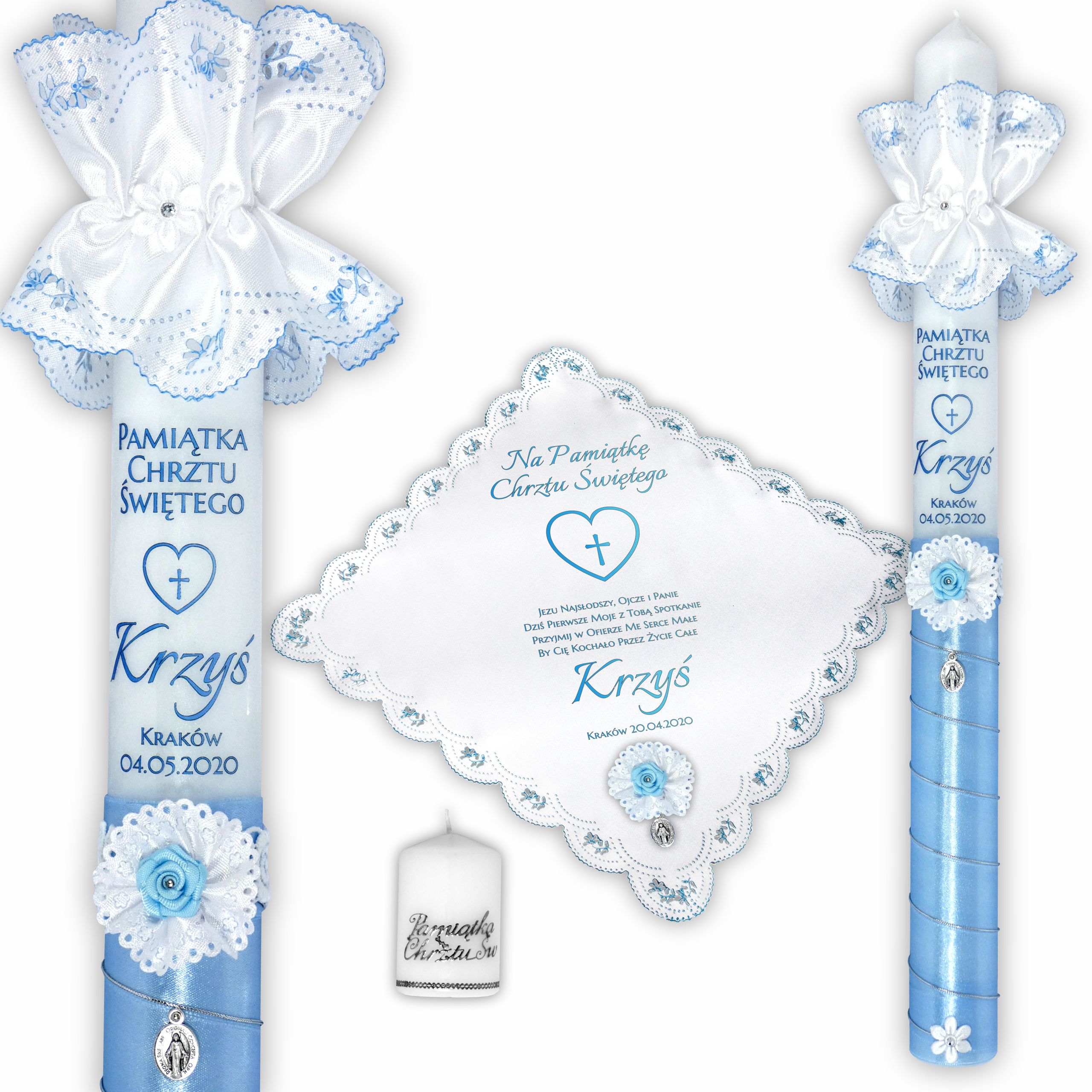 В набір входить ручна декорована свічка атласною стрічкою відповідного кольору (стрічка оброблена рожевим, блакитним кольором) і білий ) і атласний халат з найякіснішого матеріалу. Крім того, до кожного комплекту, придбаного в якості подарунка, додається маленька свічка, яку можна поставити на стіл під час прийому після церемонії хрещення.