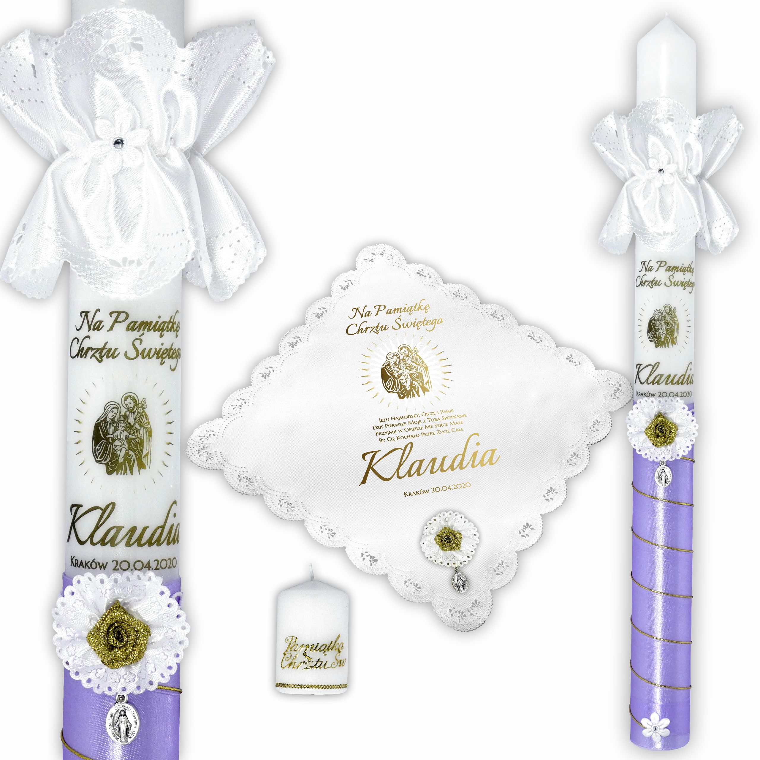 Свічка, прикрашена фіолетовим атласом із золотим акцентом, прикрашена білою квіткою внизу. Головний мотив – золотий образ Пресвятої родини. Все це доповнено золотою блискучою трояндою.