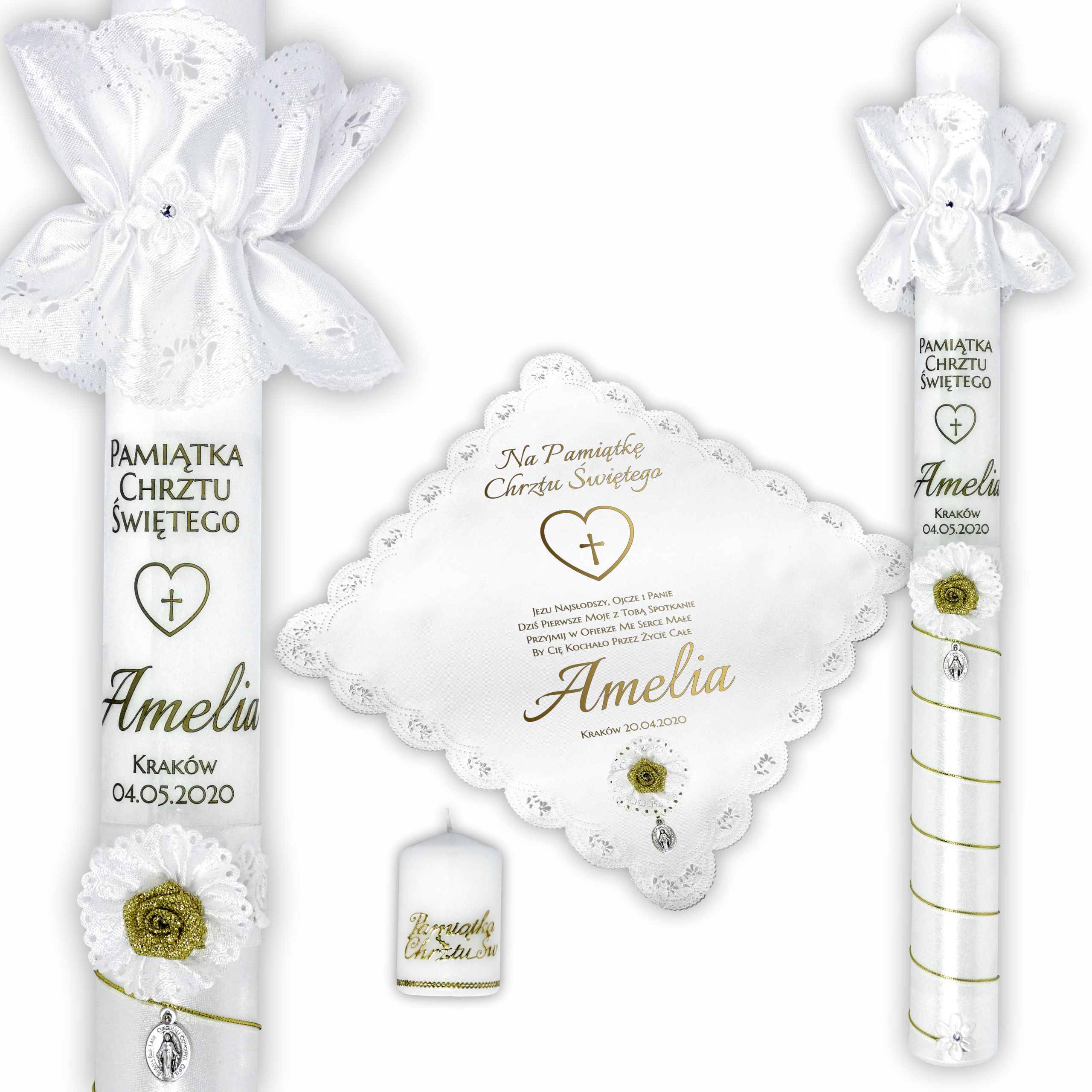 Свічка для хлопчиків і дівчаток, прикрашена білим атласом із золотим акцентом, оброблена білою квіткою внизу. Набір виділяється розеткою з красивою золотою трояндою, золотими написами з сердечком і перком.
