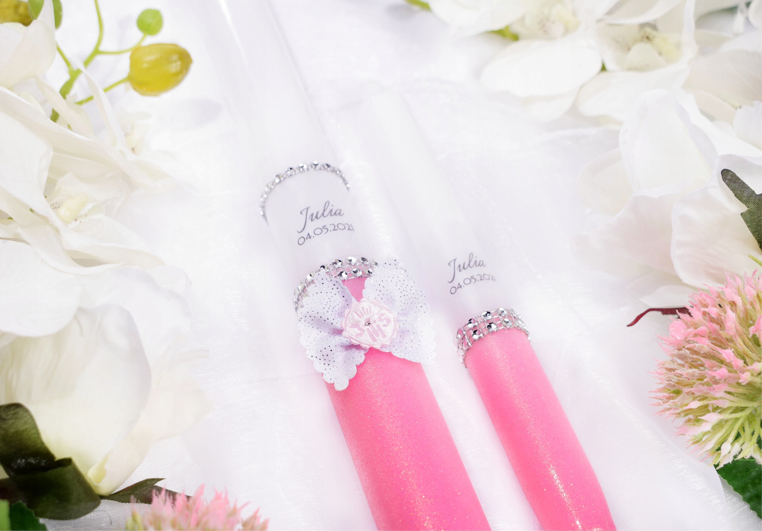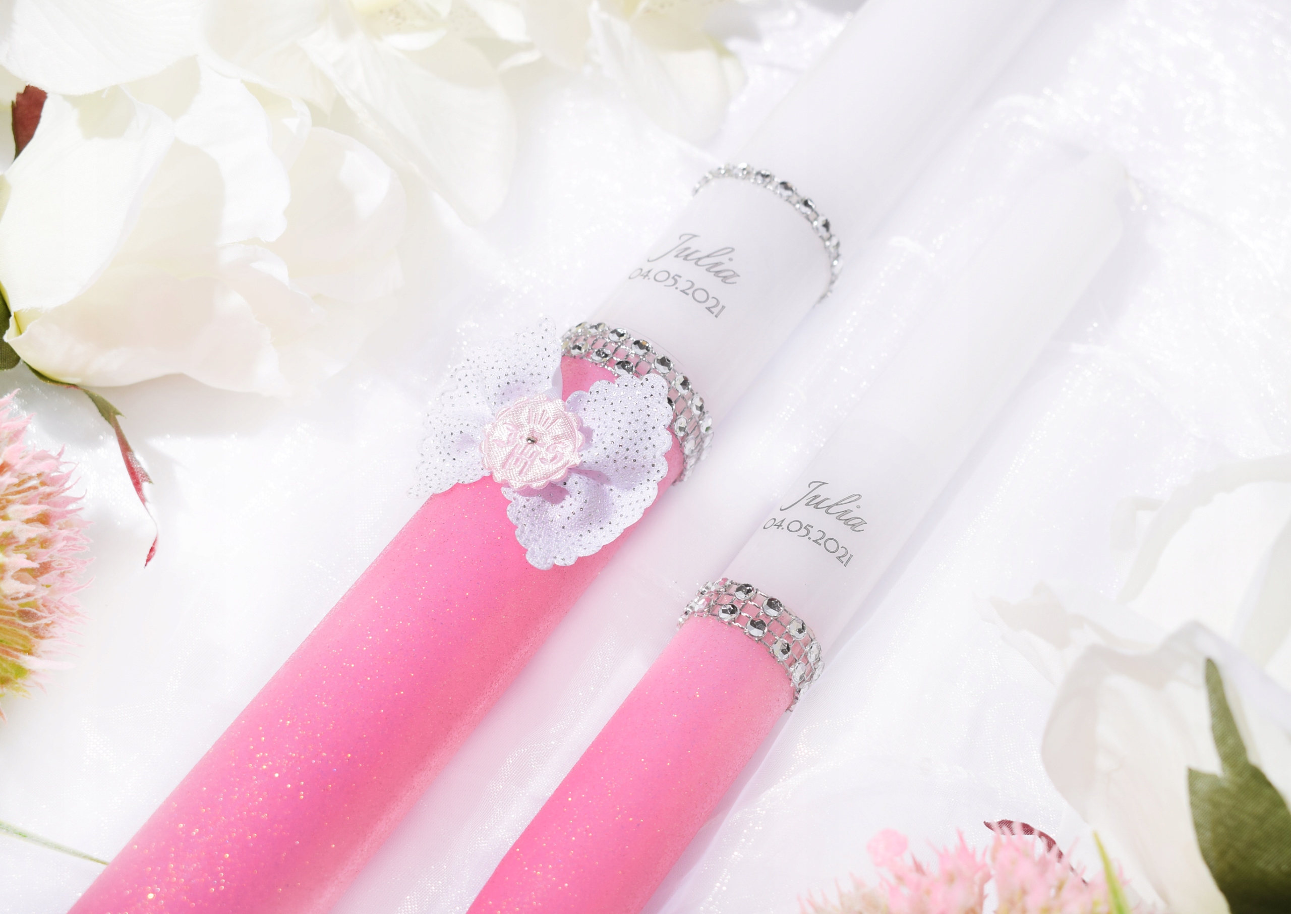 Свічка настільна, як і свічка для хрещення, виготовлена з парафінової структури рожевого кольору. і прикрашений зі смаком блискітками.