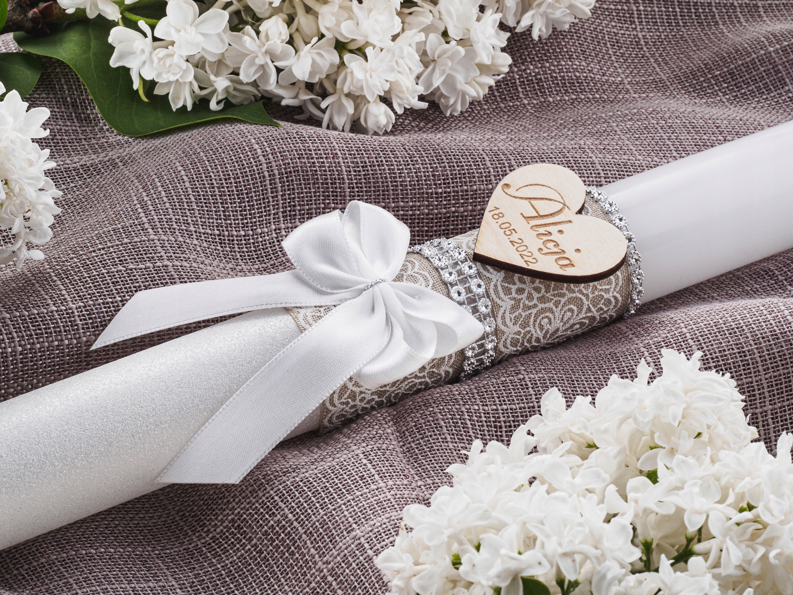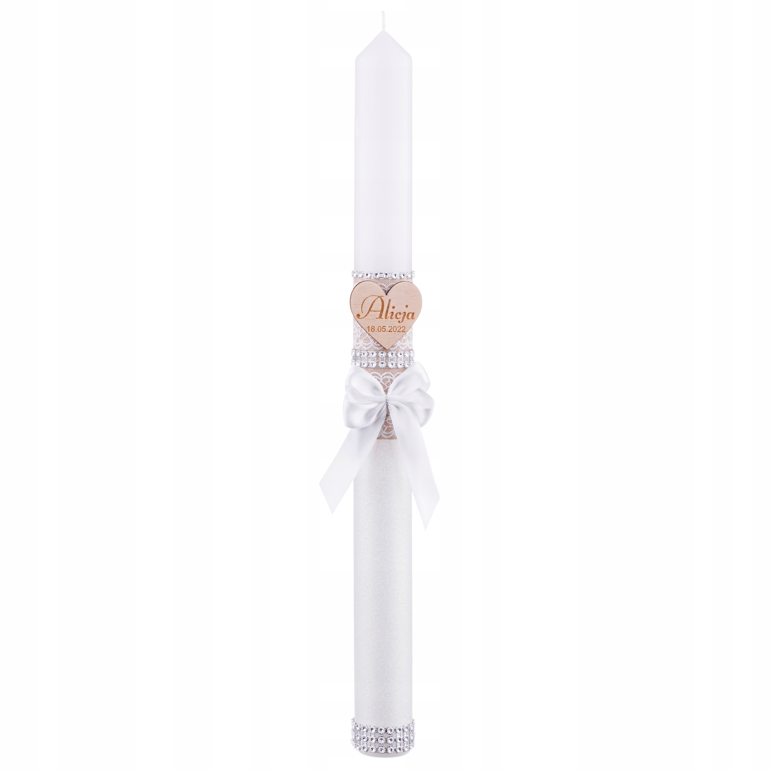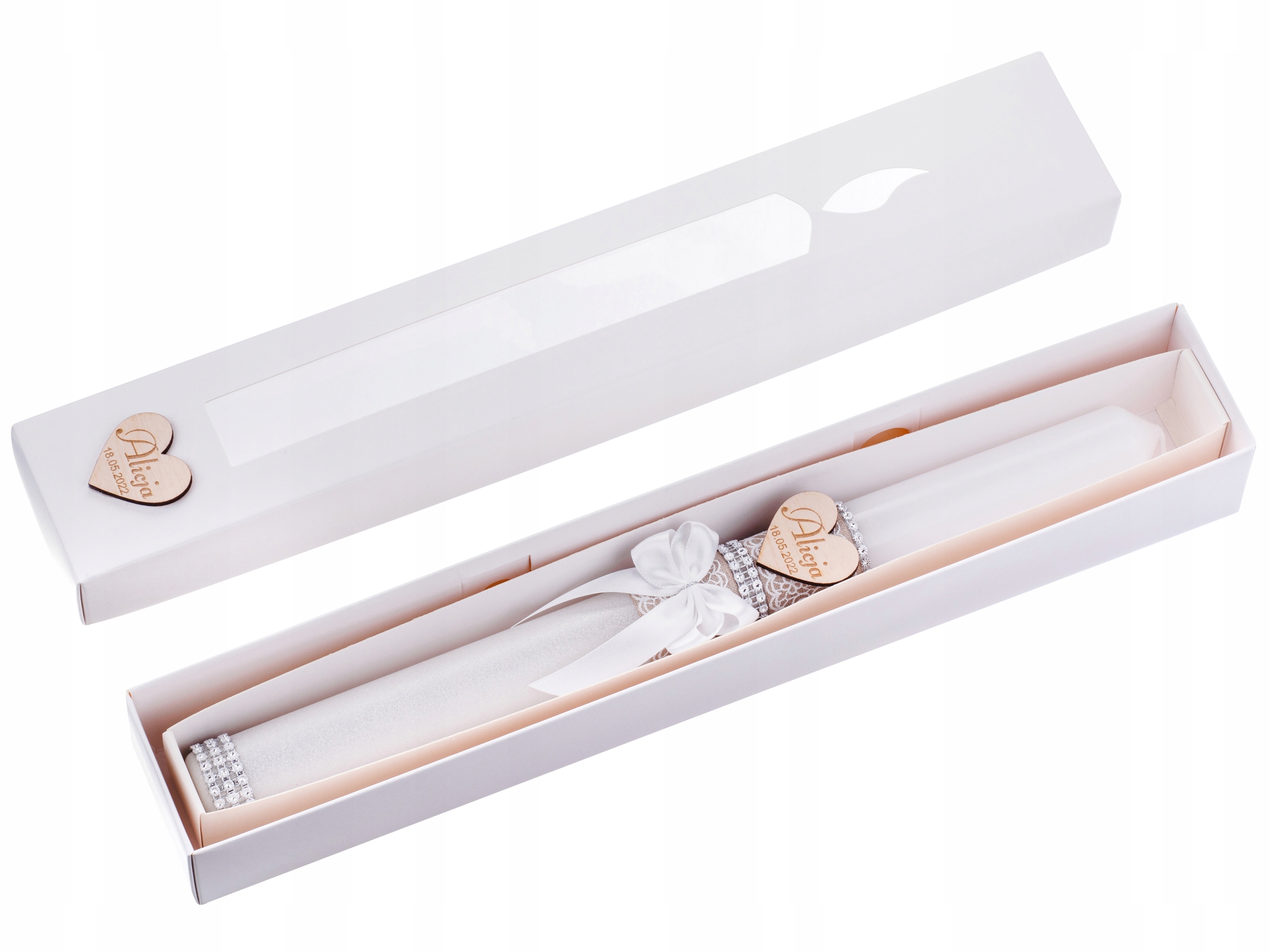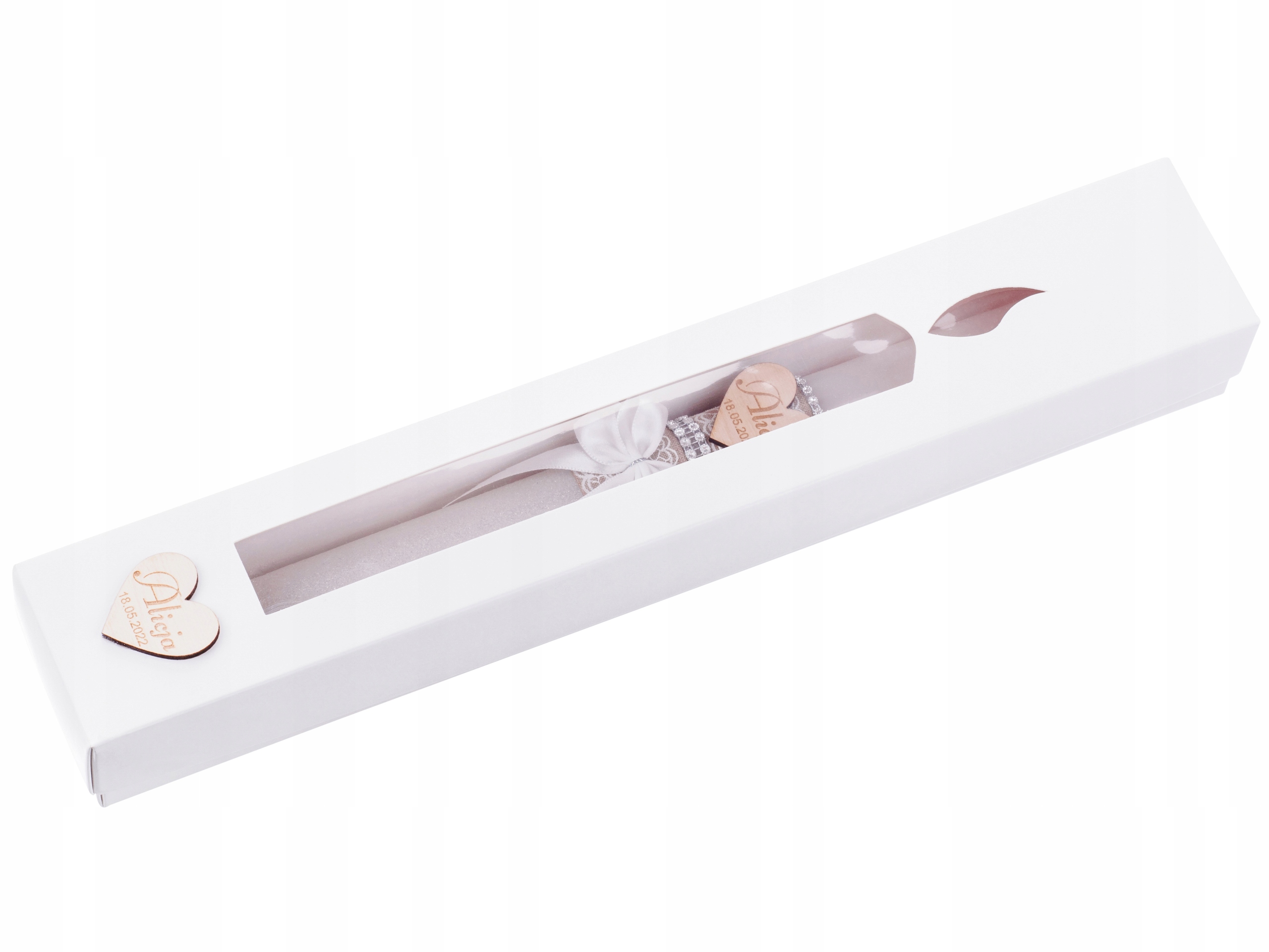 Свічка упакована в елегантну коробку. Подібно до свічки, до комплекту входить дерев’яне серце, на якому ми можемо вигравірувати ім’я дитини та дату свята.
