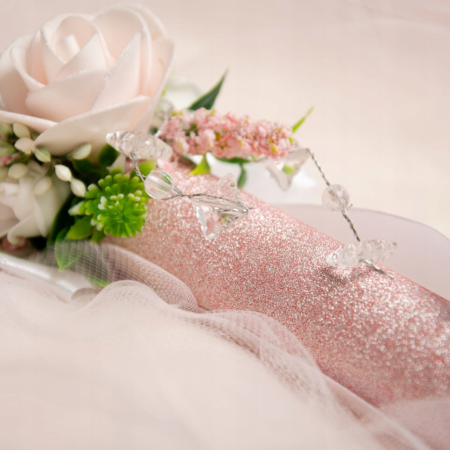 Красива свічка для Першого Святого Причастя, декорована вручну. Підготовлено з найкращим почуттям стилю. Виготовлений з компонентів найвищої якості. Свічка, оформлена в біло-рожевому кольорі, яка чудово підійде як сувенір на Перше Святе Причастя для дівчинки. Красива квіткова аплікація - троянда, прикрашена рослинним мотивом - додає їй шарму.