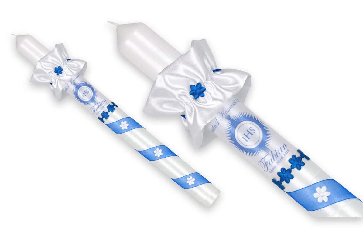 це свічка з білим атласом і синіми перлами. Маріанський колір аплікації робить свічку присвяченою хлопцям, але в деяких регіонах Польщі також дівчатам.