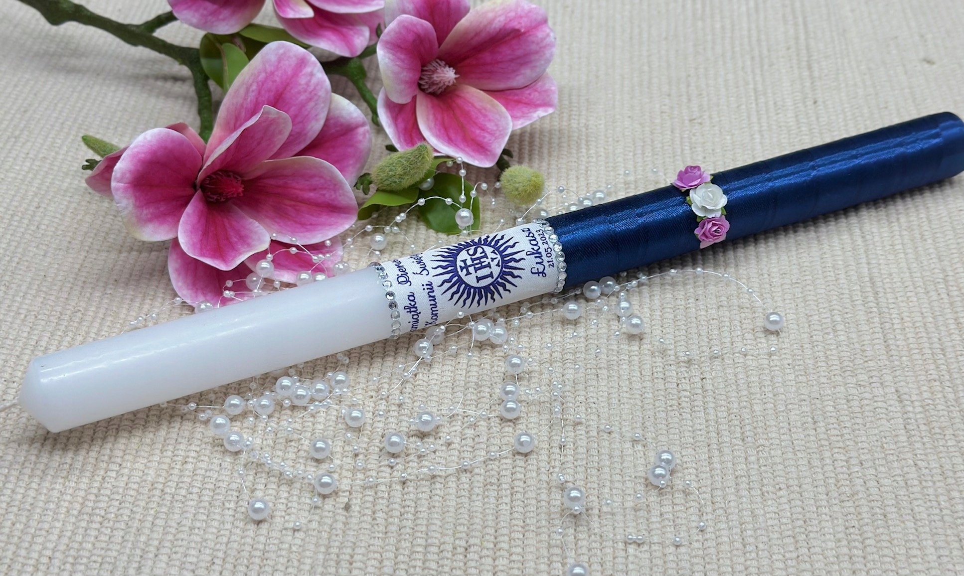 Свічка в стилі красивої синьої стрічки. Прикрашений перлами та квітами.