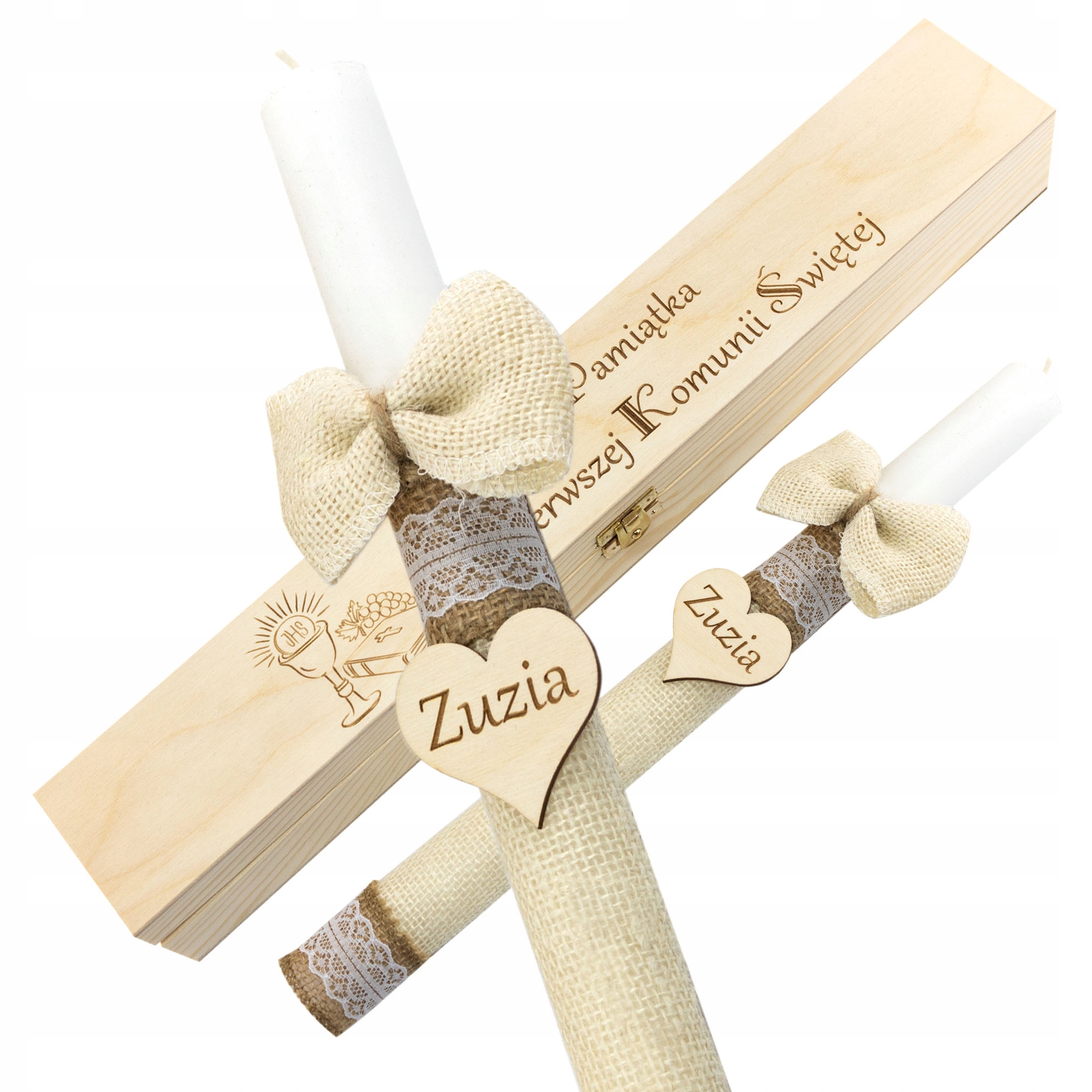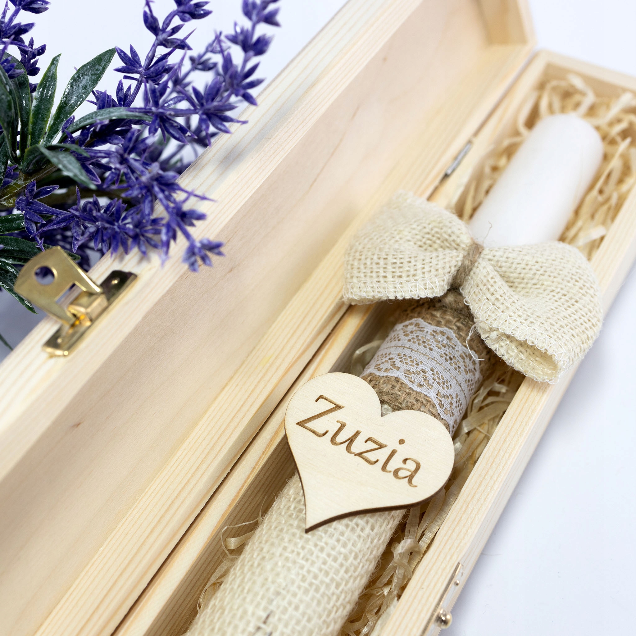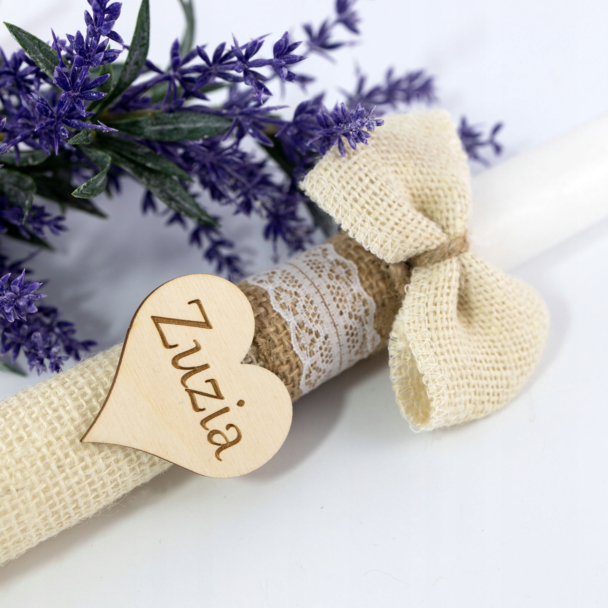 Свічка для причастя в сільському стилі, загорнута в джут з мереживними стрічками, красивим бантом і дерев’яним серцем із вигравіруваним іменем і датою, упакована в вигравіровану дерев’яну коробку.