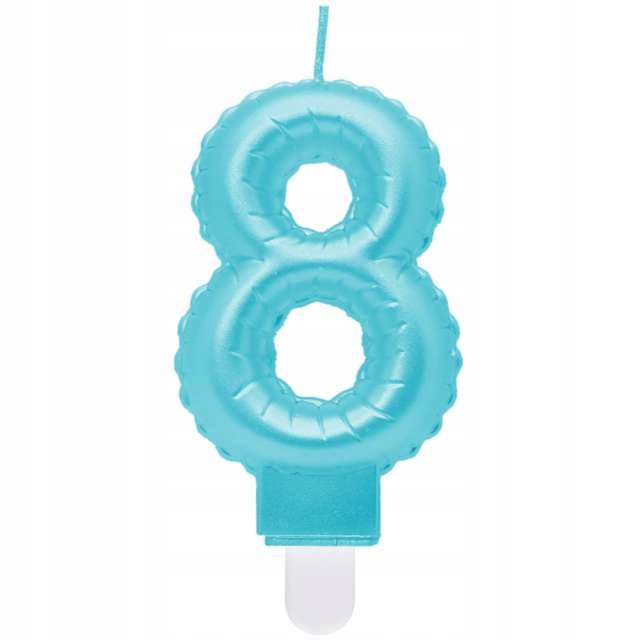 Ніжно-блакитна свічка у формі цифри «8», перламутрова структура якої робить її ще більш унікальною. Ідеальна пропозиція для тих, хто шукає оригінальний дизайн, який ідеально підійде як прикраса торта, підкреслюючи важливість події. І внутрішнє, і зовнішнє коло свічки мають виступи. Додатково в середній частині є ніжні вирізи. Свічка на маленькій пластиковій основі.