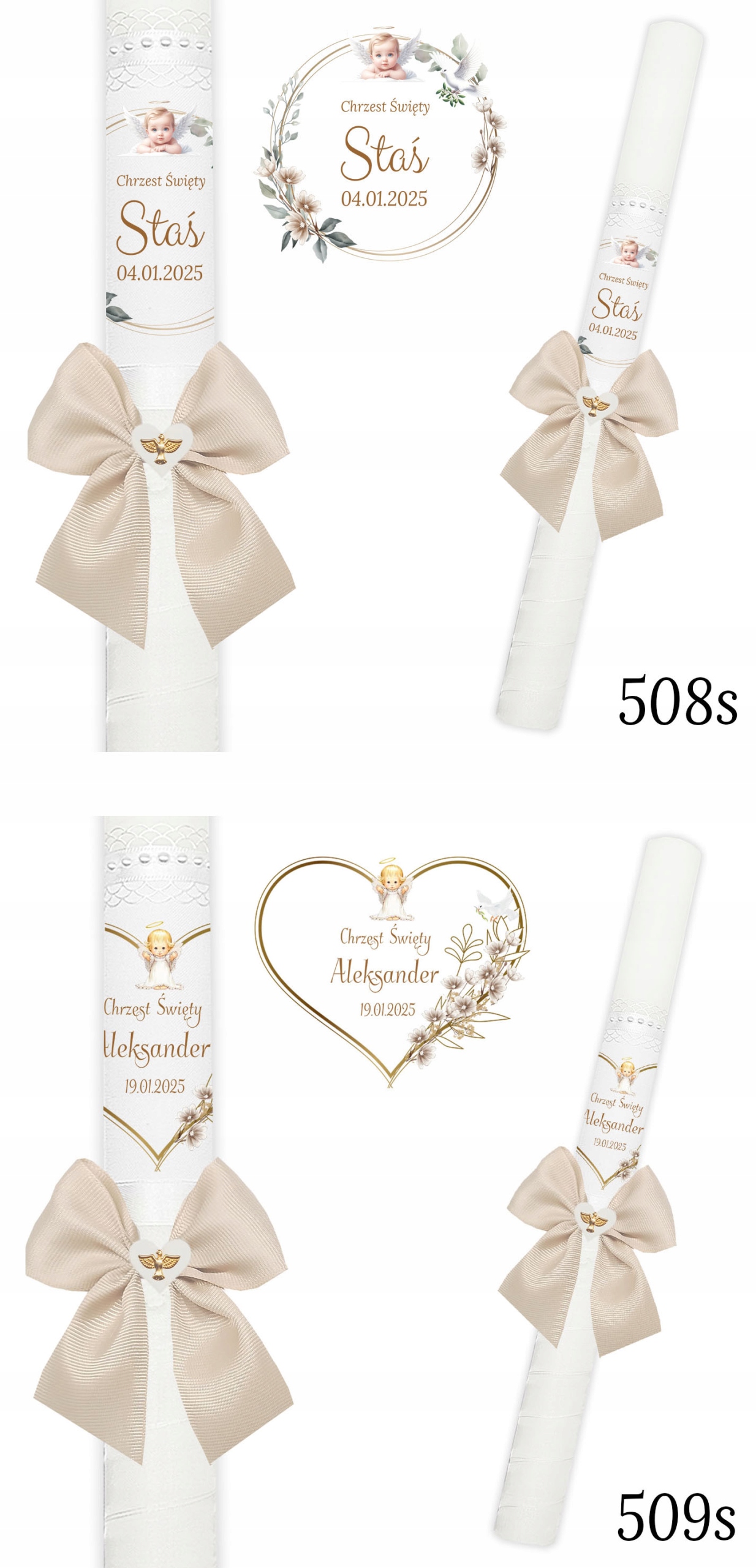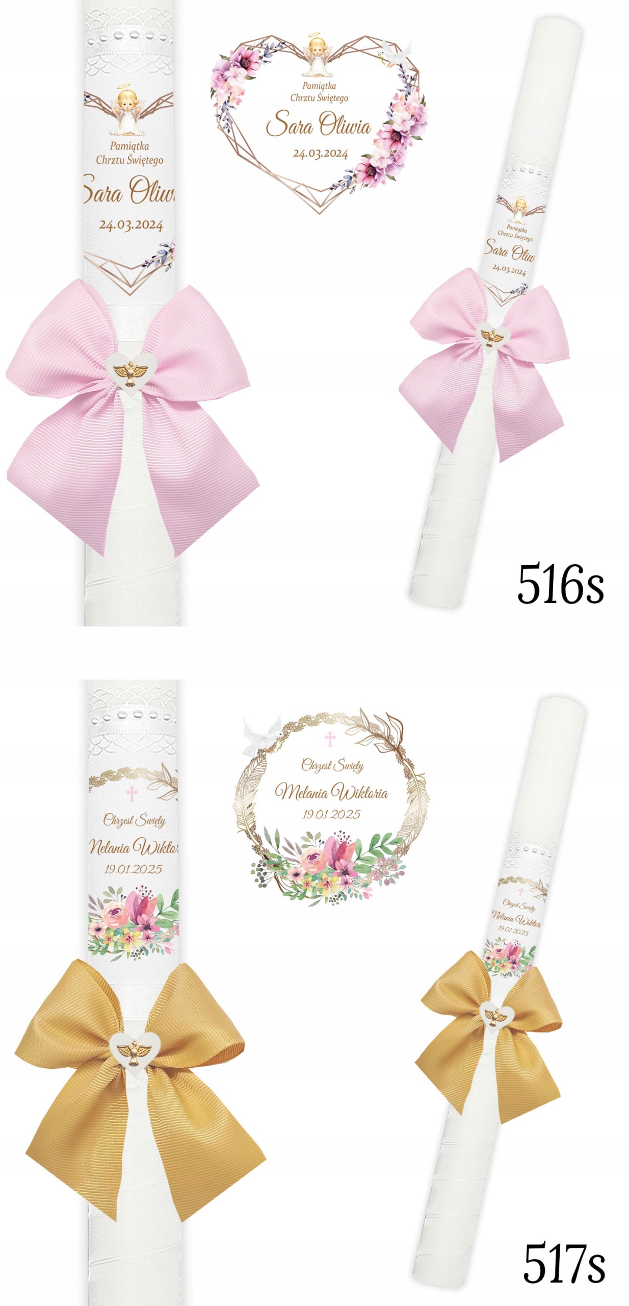 Святе хрещення - це урочиста церемонія, яка офіційно знайомить дитину з церквою і символізує його вступ до громади віруючих. Хрещення - це також важлива подія для сім'ї та близьких людей, які разом відзначають цю церемонію та висловлюють бажання змусити дитину проходити через віру. Це таїнство - це унікальна подія, яка запам'ятовується на все життя і є сувенірною роками. 4 Свічка була виготовлена прикрашеною білою шифоновою стрічкою, яка надає їй тонкощі та витонченості. Верхня частина свічки прикрашена атласним мереживом і ніжними білими відтінками, його витонченим стилем. Він доповнює лук дерев’яним серцем та металевою, золотою емблемою Святого Духа, який представляє сентиментальний і чарівний акцент.