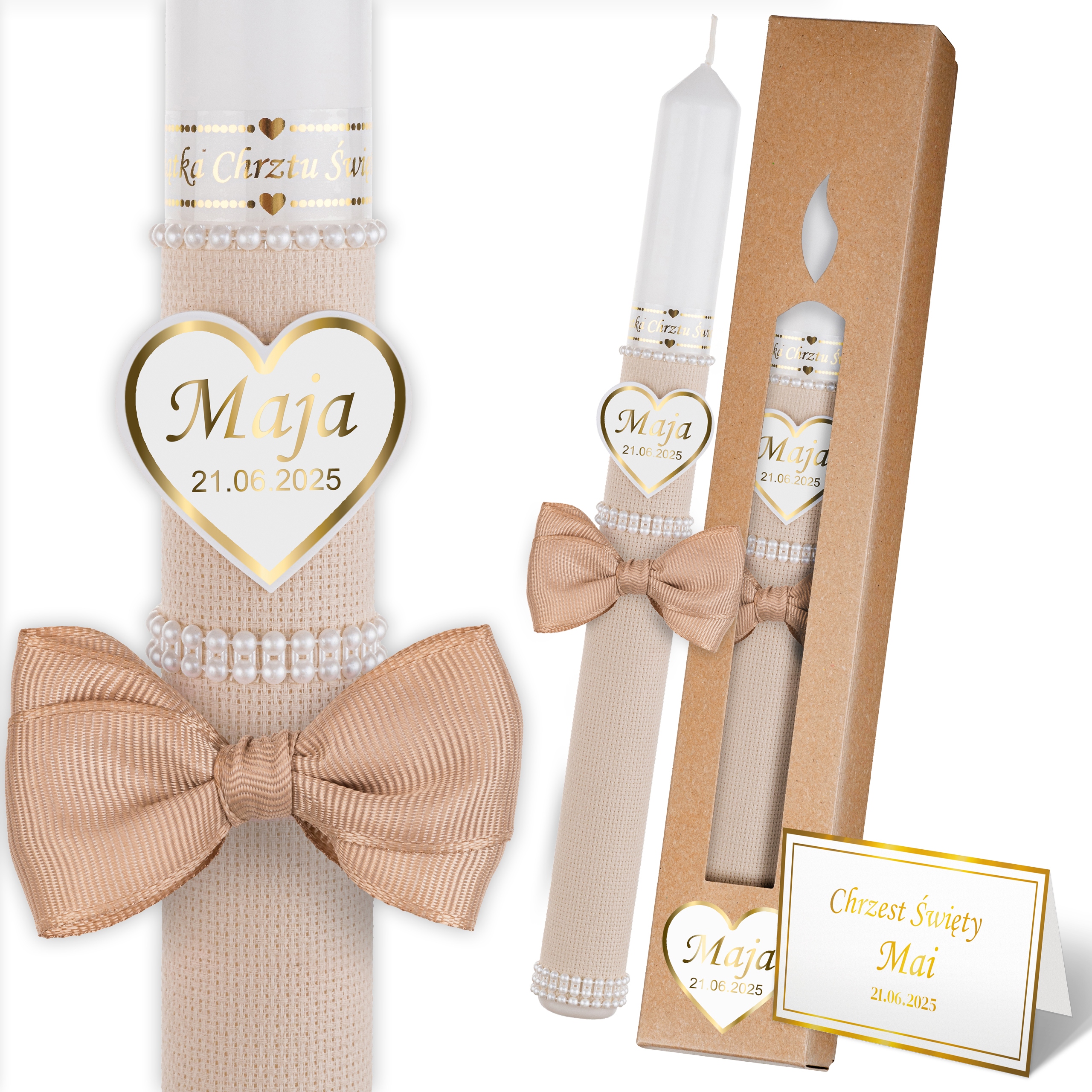 - Елегантна свічка з іменем та датою на делікатному Золотих серцях та написі "сувенір хрещення"