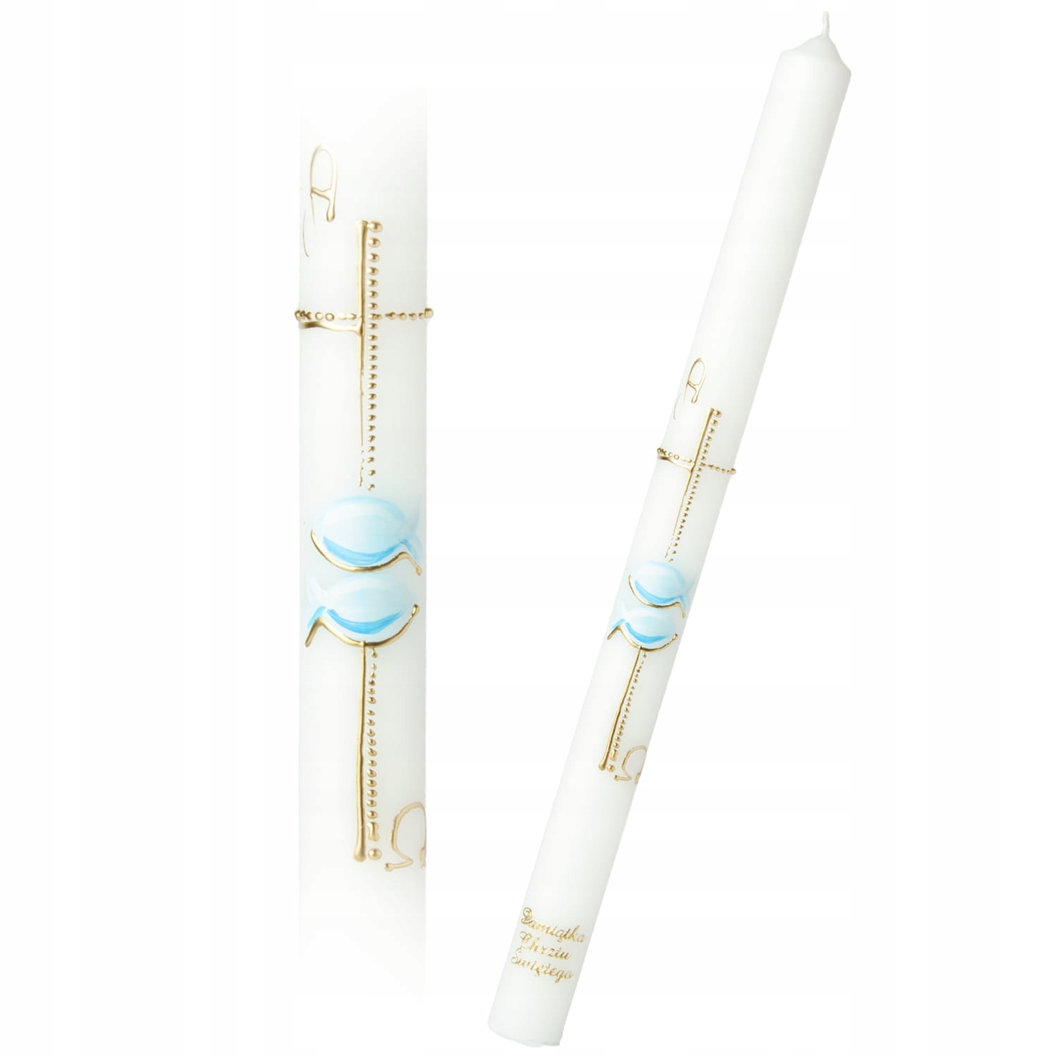 Хрестильна свічка білого кольору, декорована вручну, з християнським мотивом розмальованої риби. Він має делікатні акценти у відтінках синього та золотого. Синій колір робить свічку ідеальною для церемонії хрещення хлопчика.