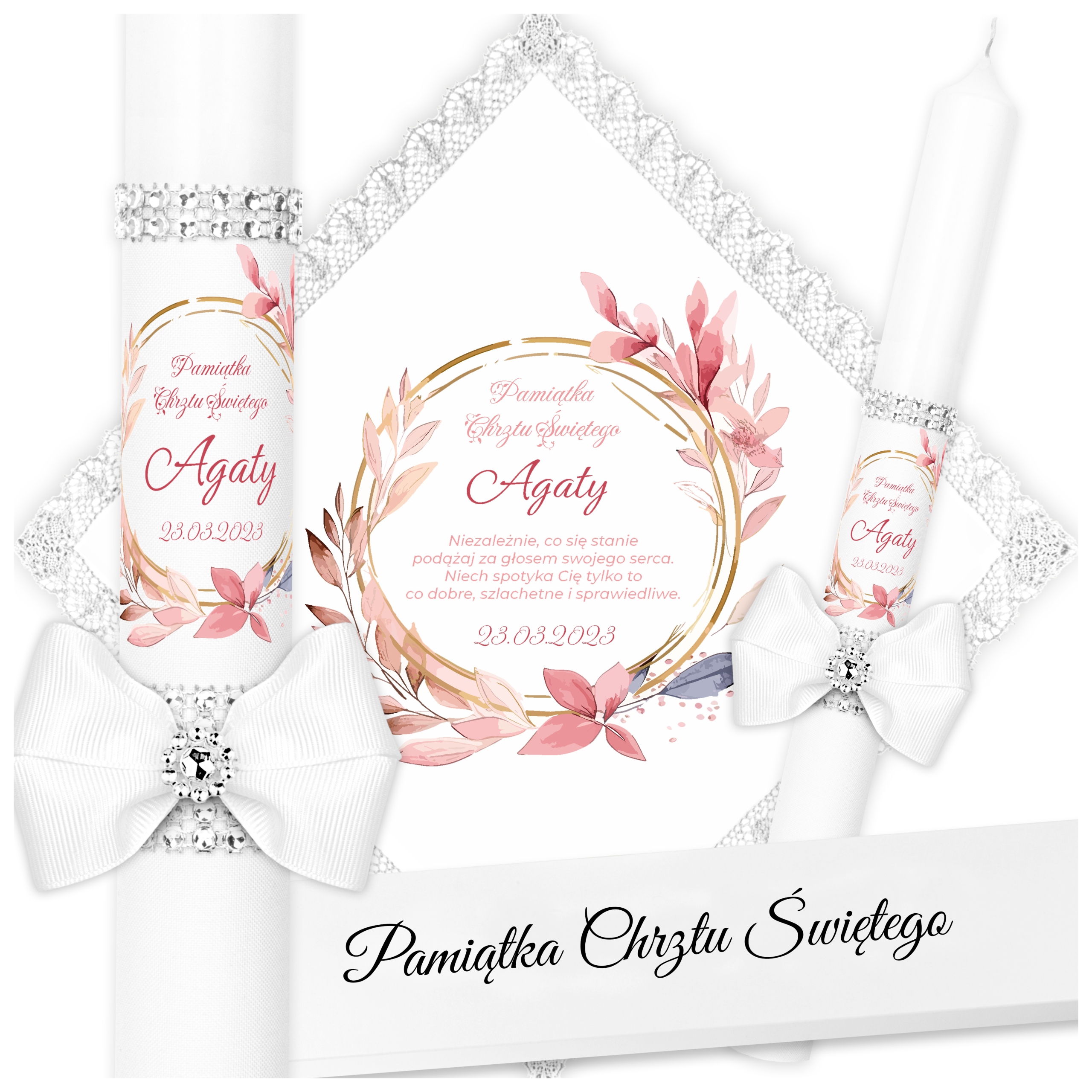 - обмотка атласним матеріалом з декоративним елементом, ім'я дитини та дата хрещення.