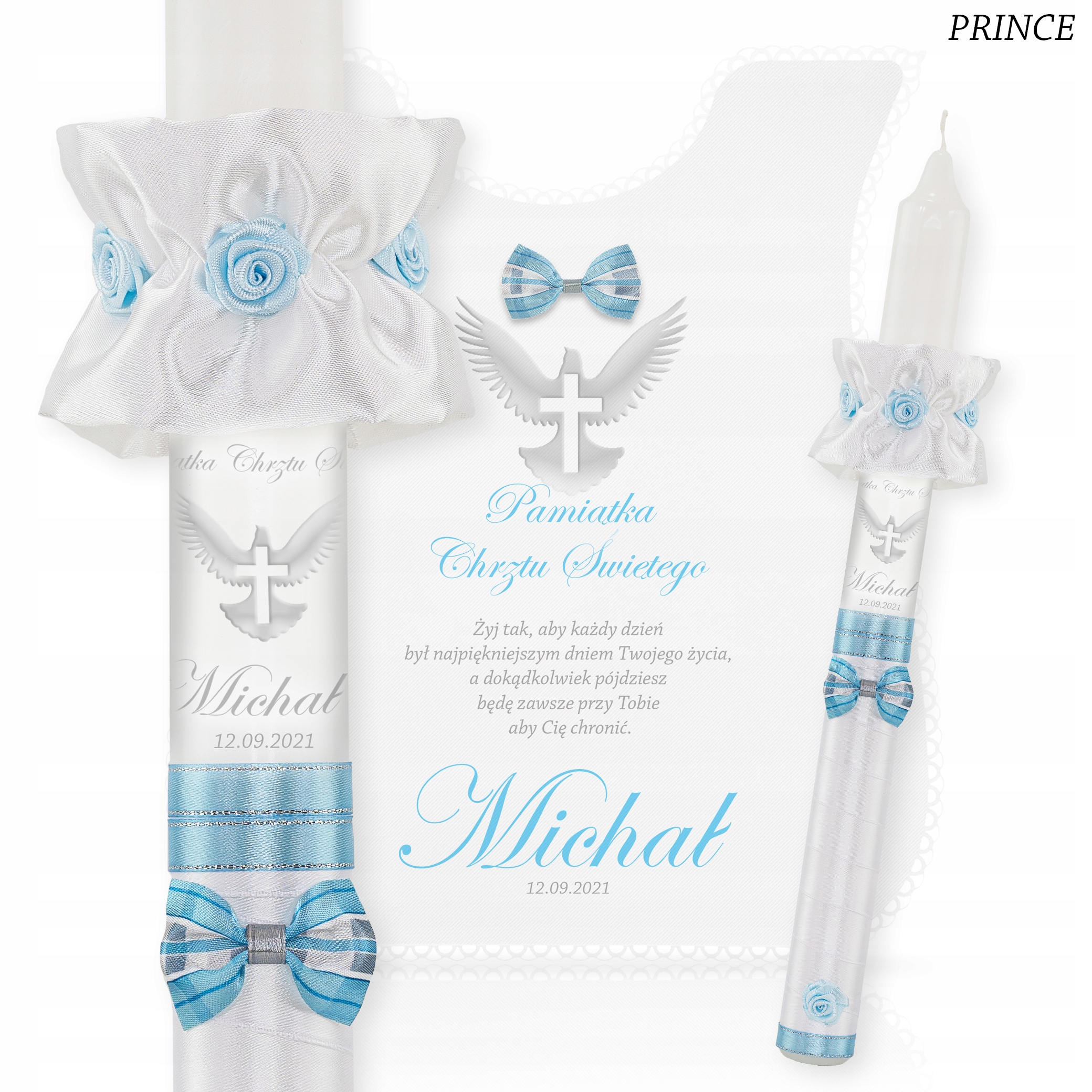 СВІЧКА ТА КОВПАЧОК ДЛЯ ХРЕЩЕННЯ ІМ'Я ДАТА + коробка + капельник