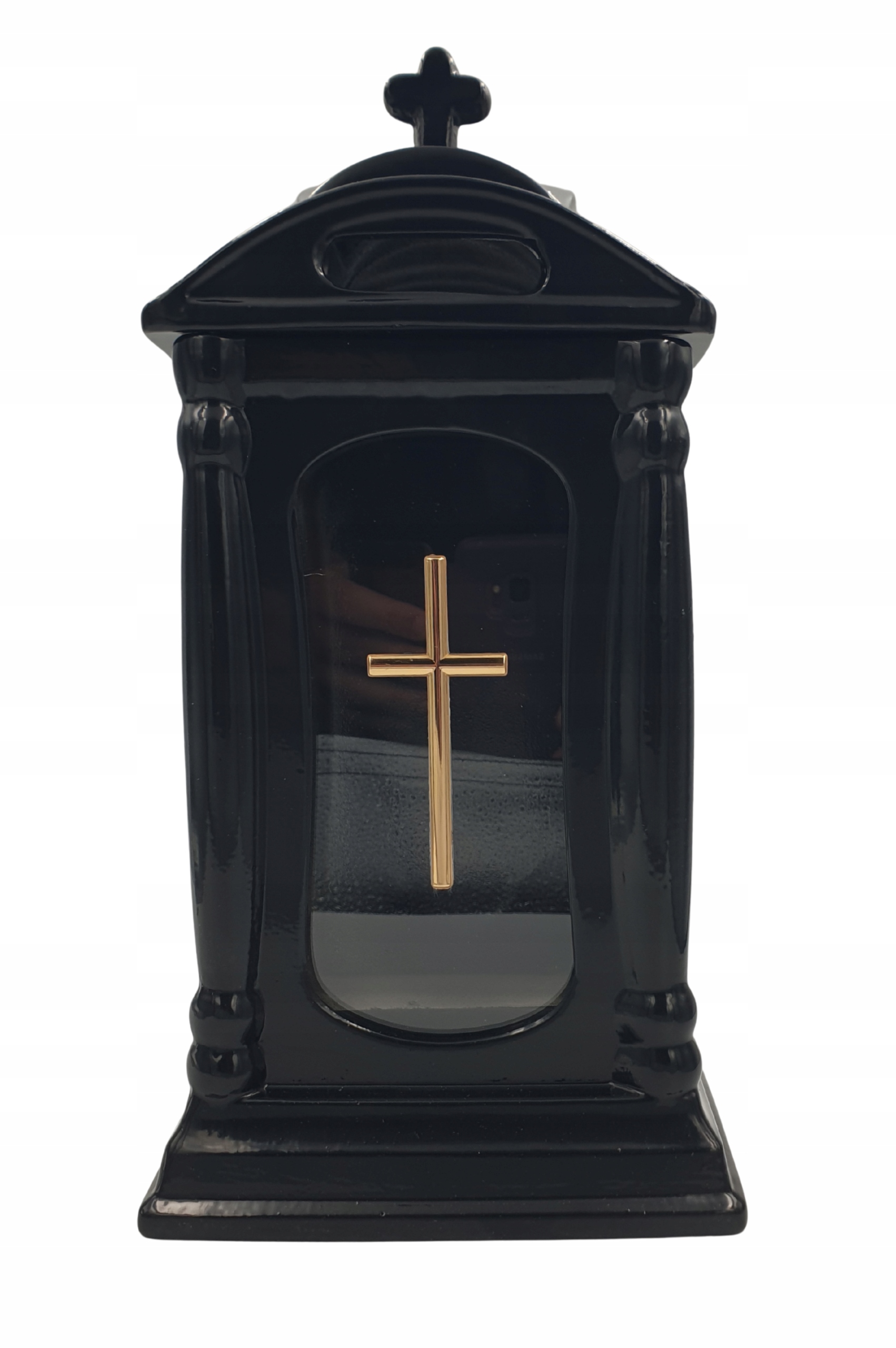 Керамічна каплиця Чорна могила з хрестом — вишуканий і символічний спосіб вшанувати пам'ять близьких. Виготовлена з білої кераміки, вкрита блискучою глазур'ю, яка надає їй тонкого блиску і захищає від пошкоджень, виглядає надзвичайно гідно і вишукано. Спереду та з боків є скляні віконця, які захищають полум’я свічки від вітру та водночас забезпечують гарне розсіювання світла. Золотий хрест, розміщений на передній частині свічки, додає їй духовного виміру та підкреслює її символічне значення.