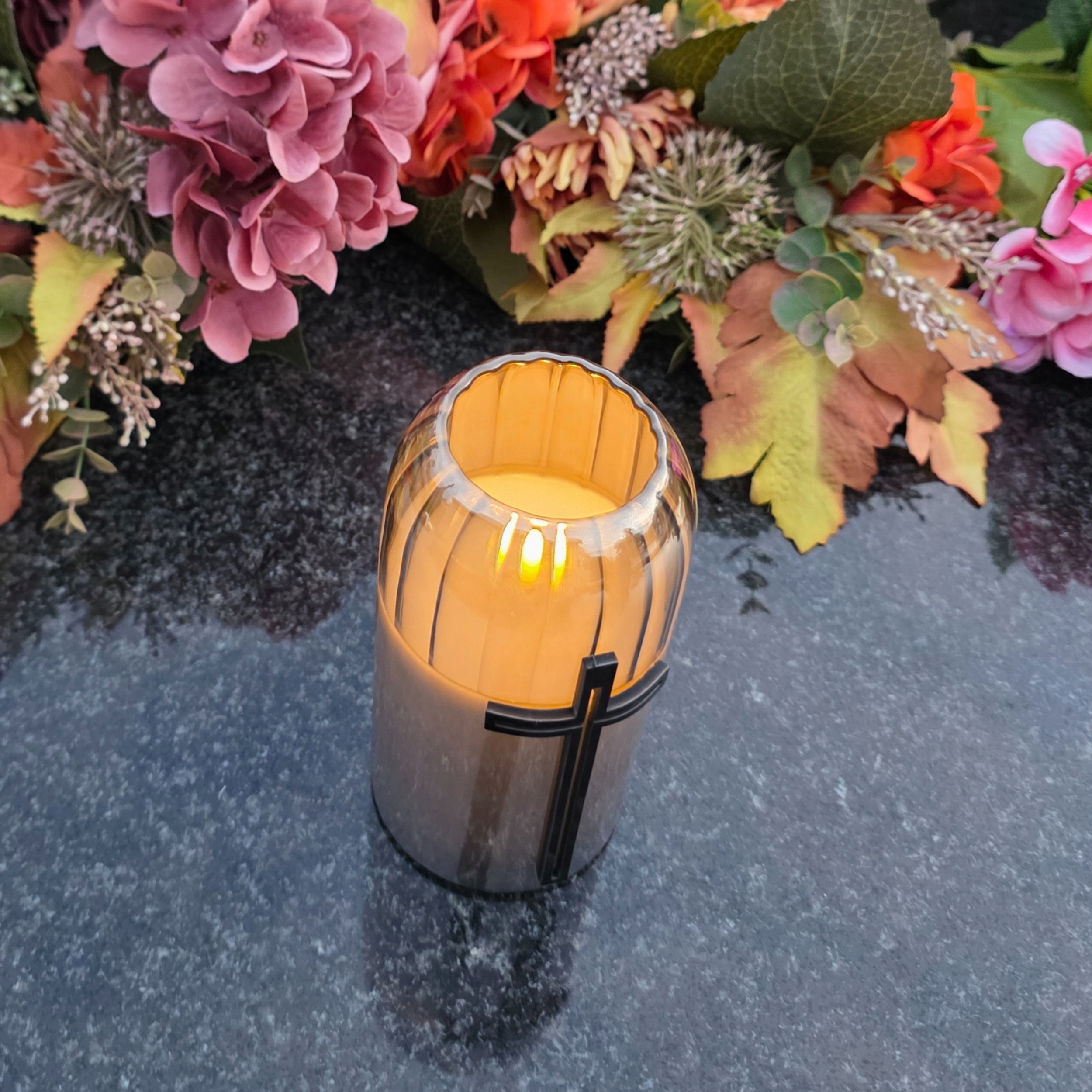 Ця елегантна світлодіодна свічка поєднує класику з сучасністю, створюючи унікальну прикрасу надгробка. Оздоблений сріблястим металіком, з поверхнею з восковим ефектом і світлодіодним діодом, що імітує справжнє полум'я, він виглядає надзвичайно реалістично - як традиційна свічка, але без вогню та диму.