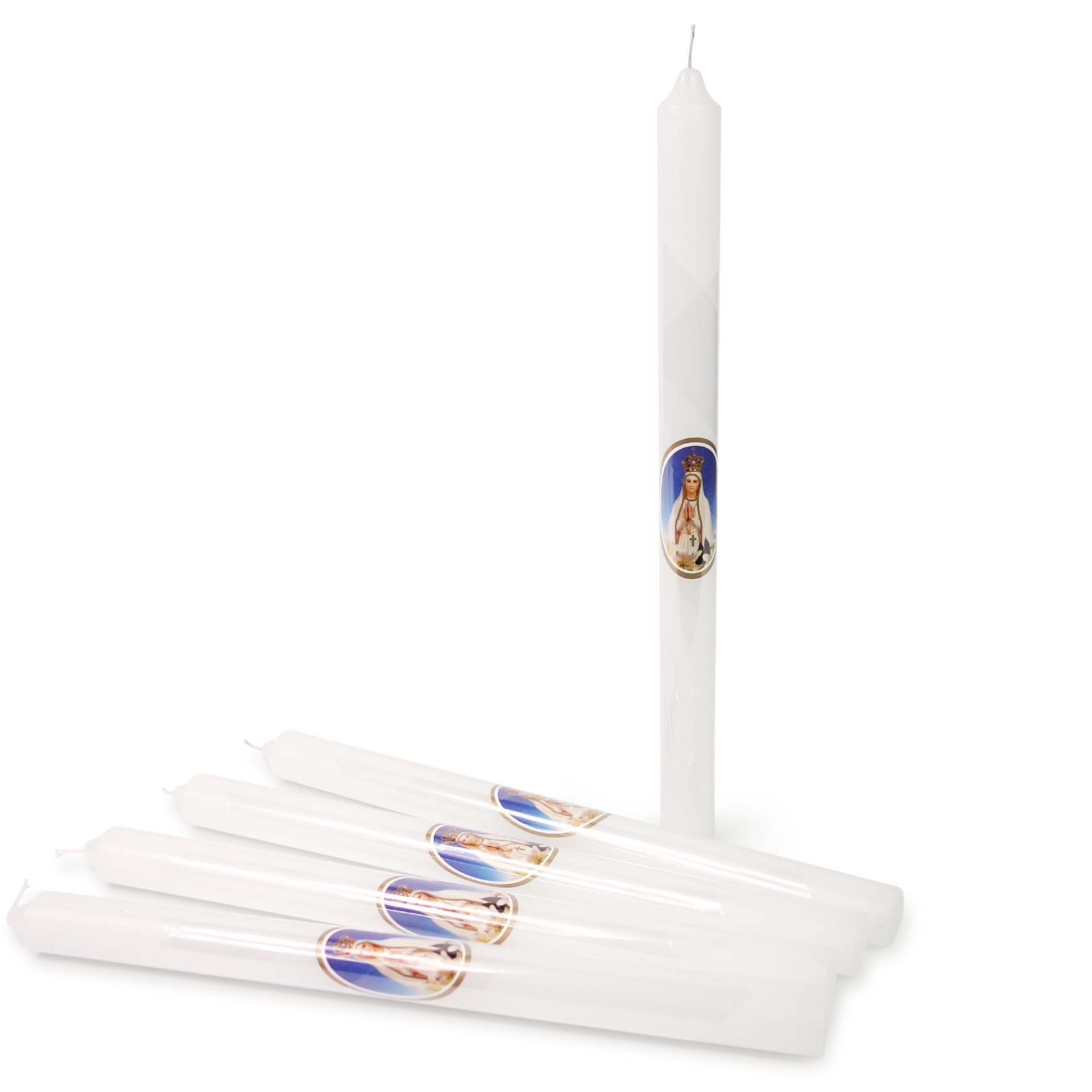 Пропонуємо витончену маріанську свічку з білого парафіну, прикрашену наклейкою із зображенням Матері Божої Фатімської. Свічка ідеально підійде для вечірньої переклички або процесії з ліхтариками, створюючи атмосферу молитви та зосередженості.
