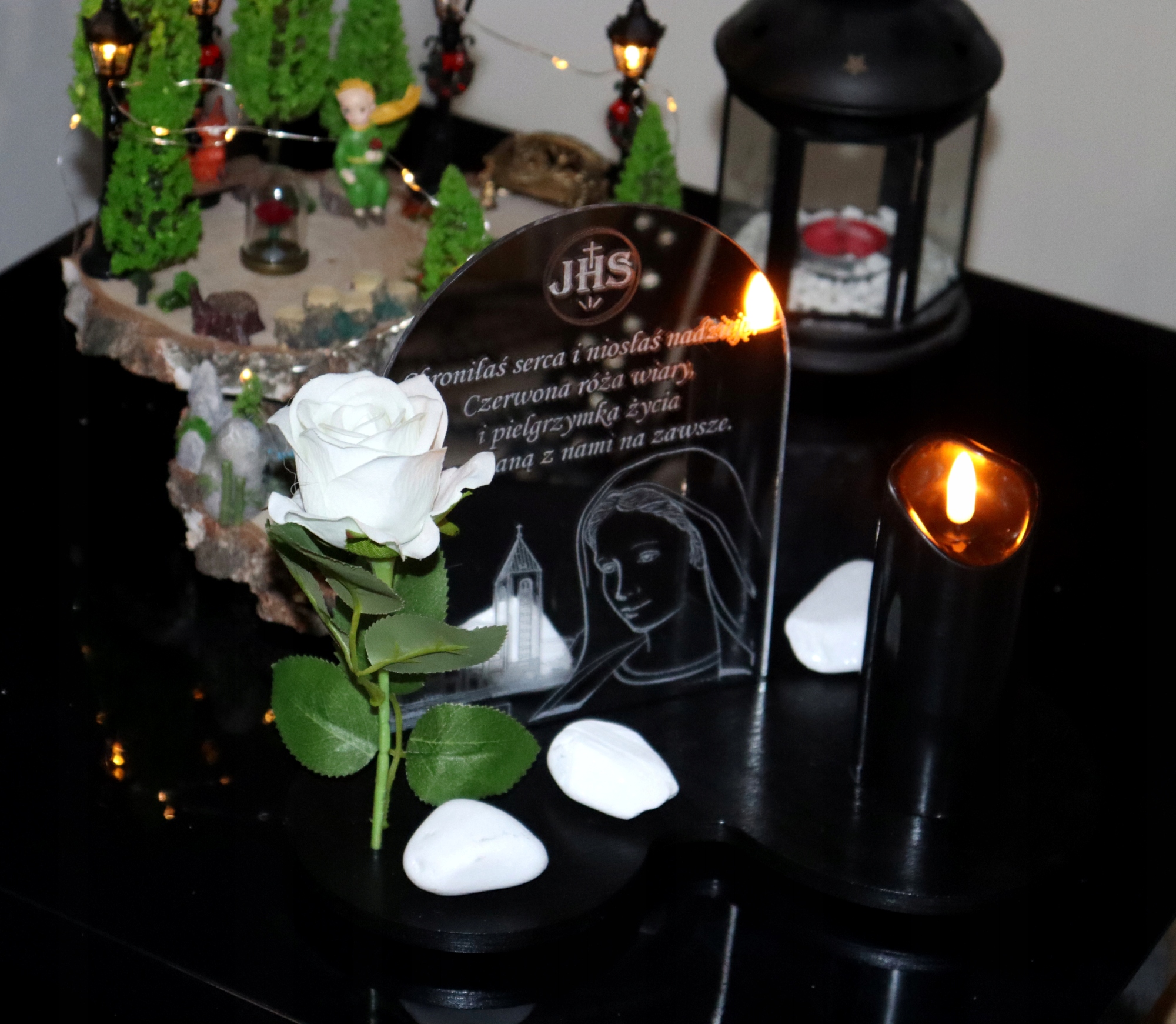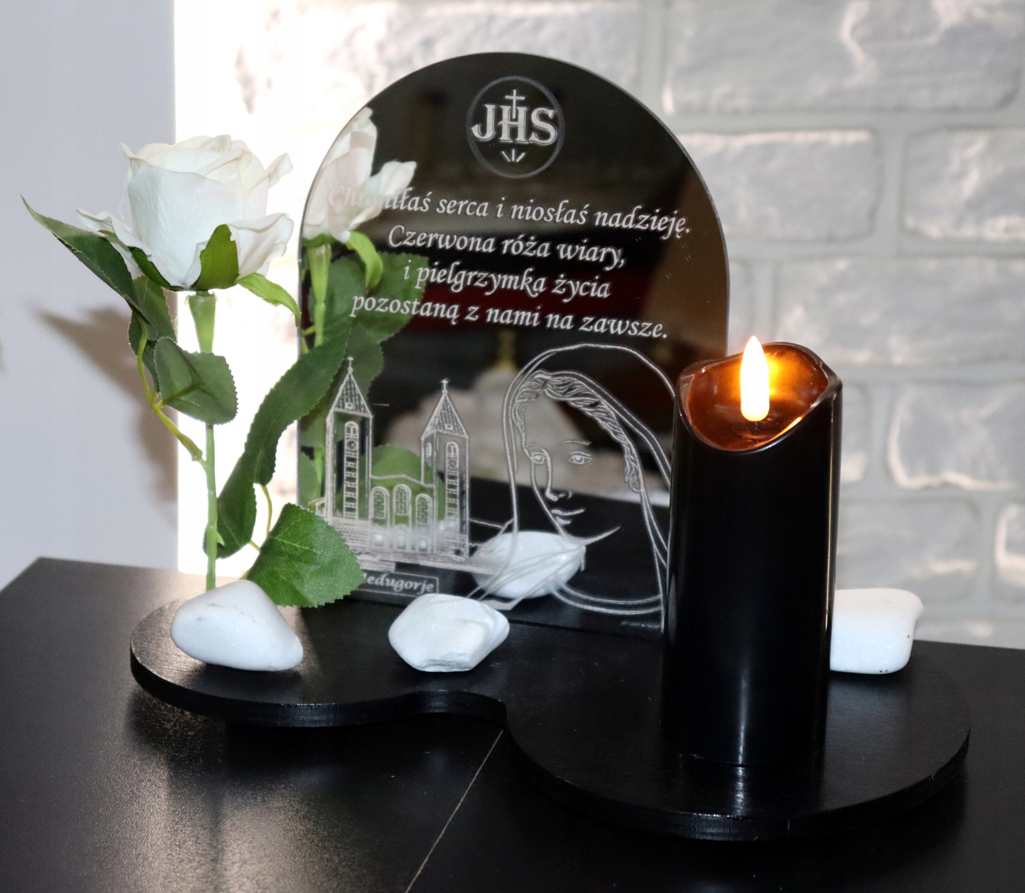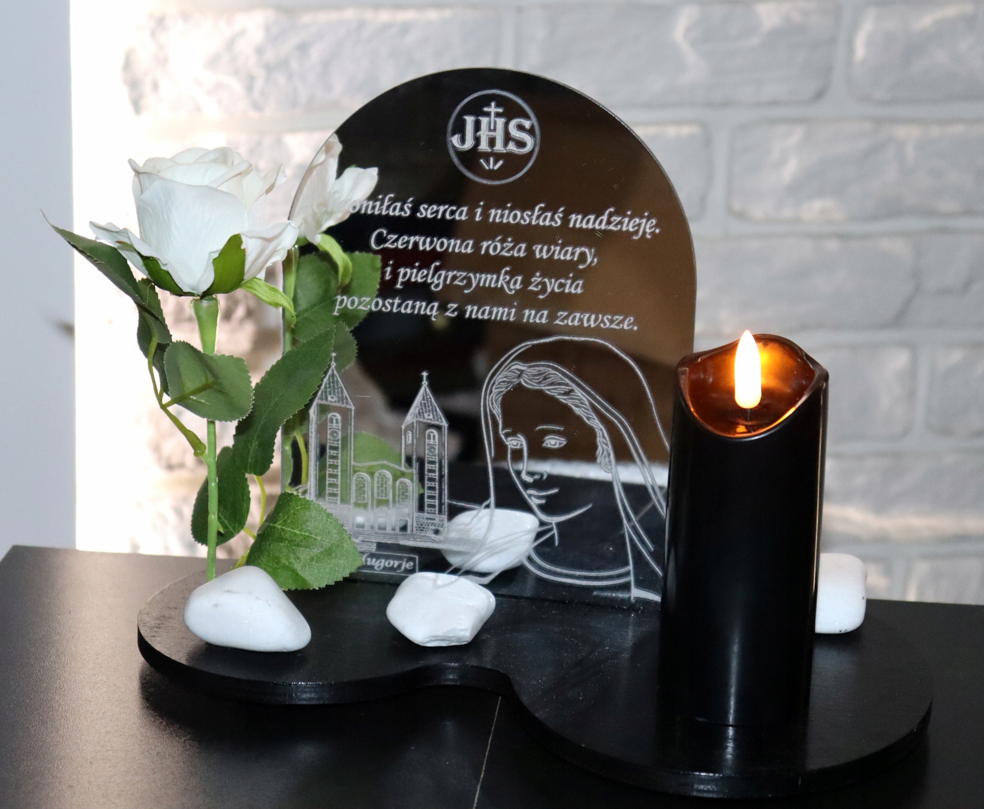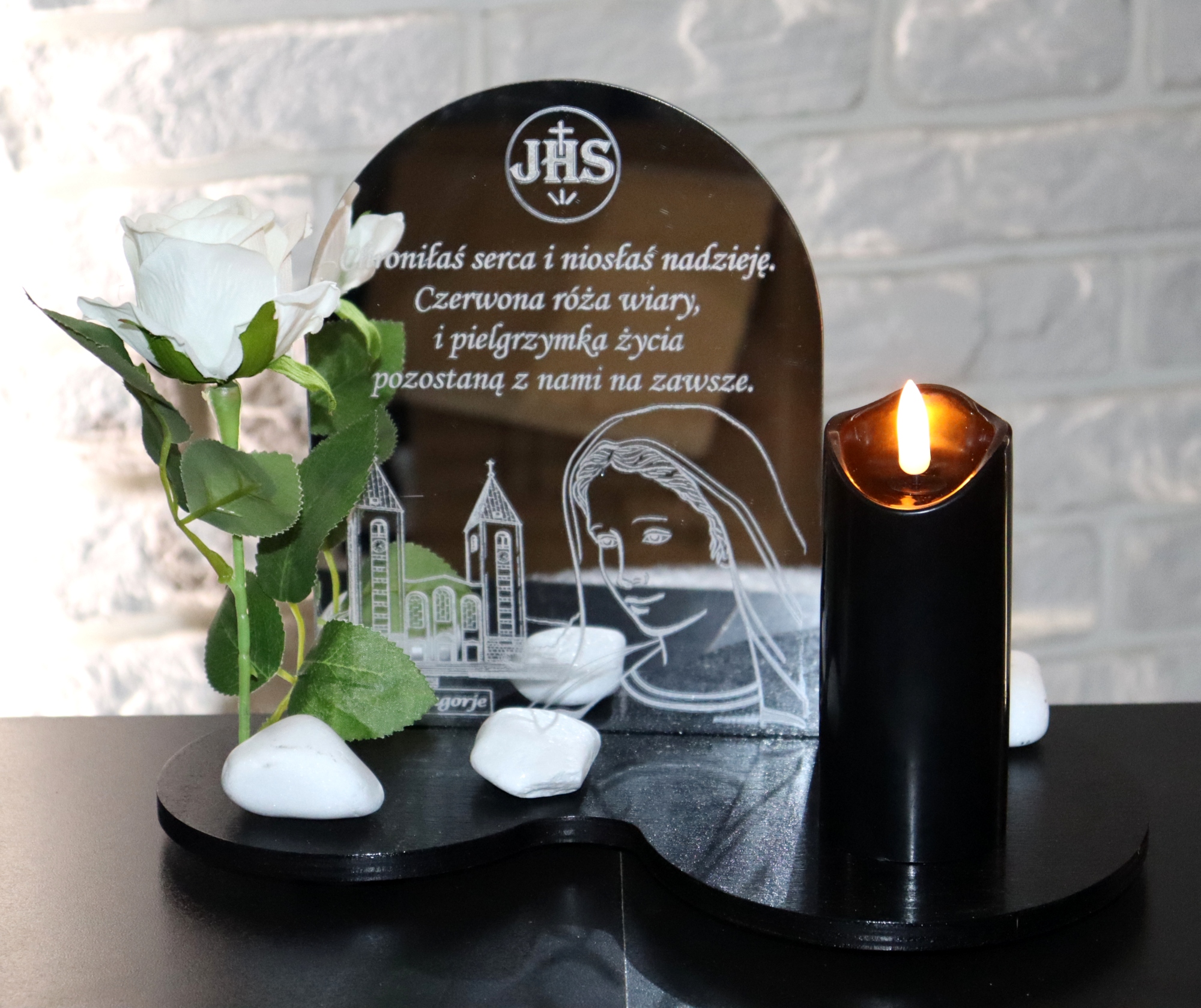 Прикраса доповнюється дзеркальна пластина з оргскла, на якій ми можемо вигравірувати будь-який вміст, що додає неповторного характеру всьому.