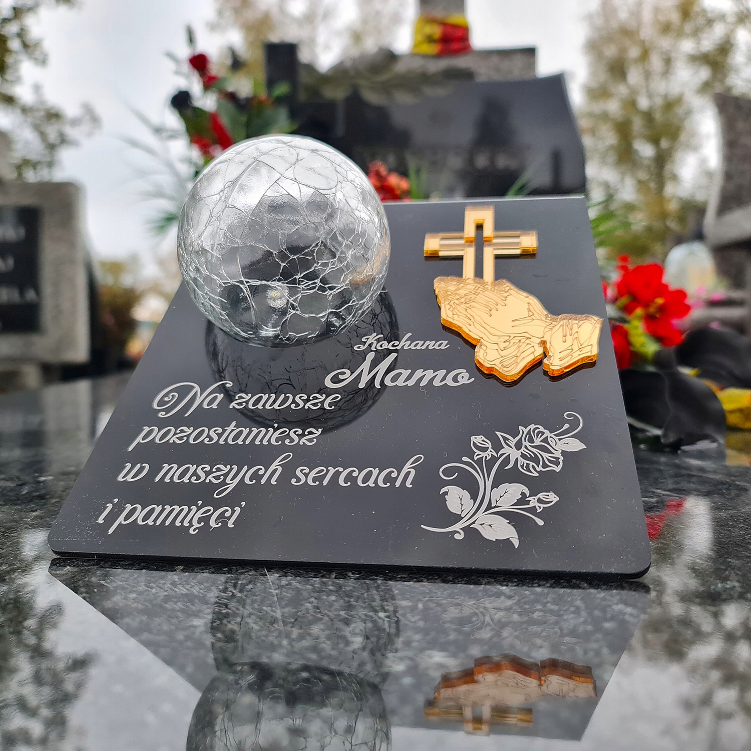 Елегантна світлодіодна надгробна свічка на сонячних батареях, яка світиться в двох режимах: білому та кольоровому RGB, з вигравіруваною основою з акрилового скла, прикрашеної золотим мотивом.