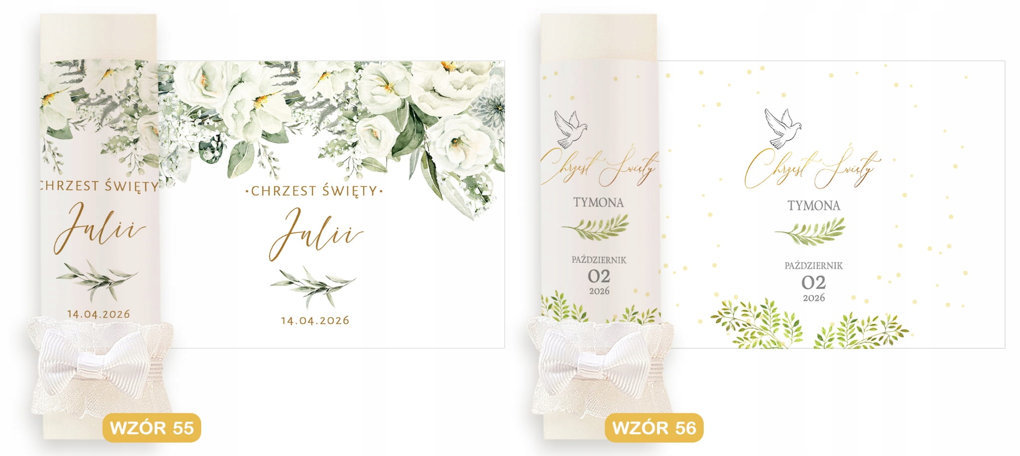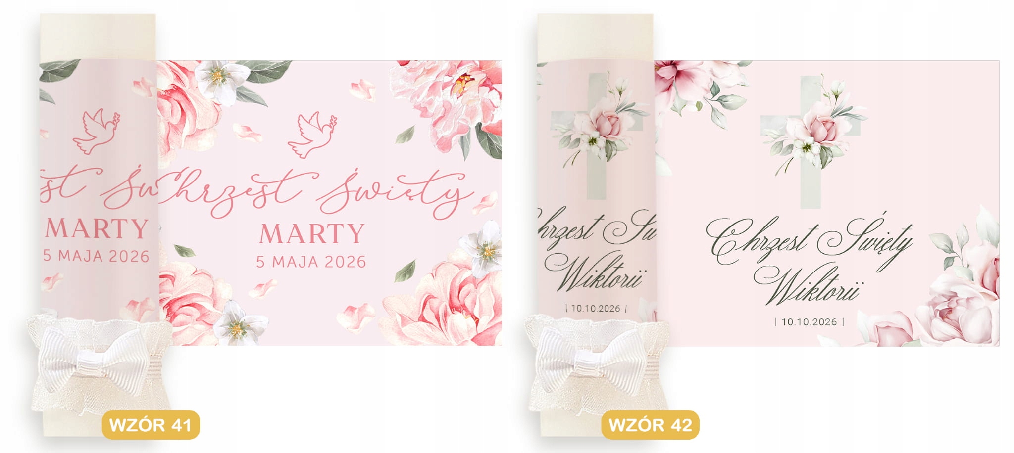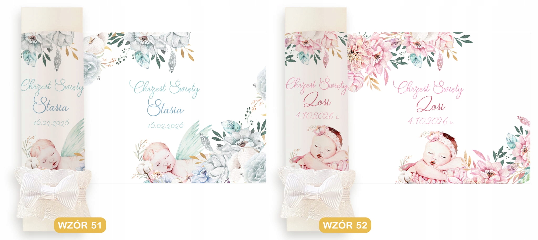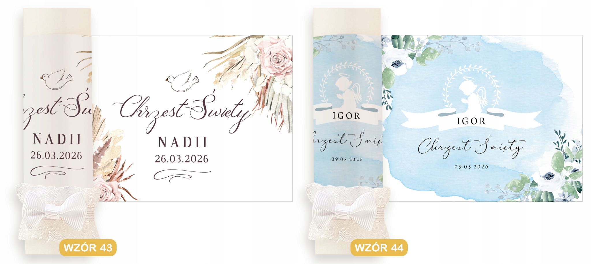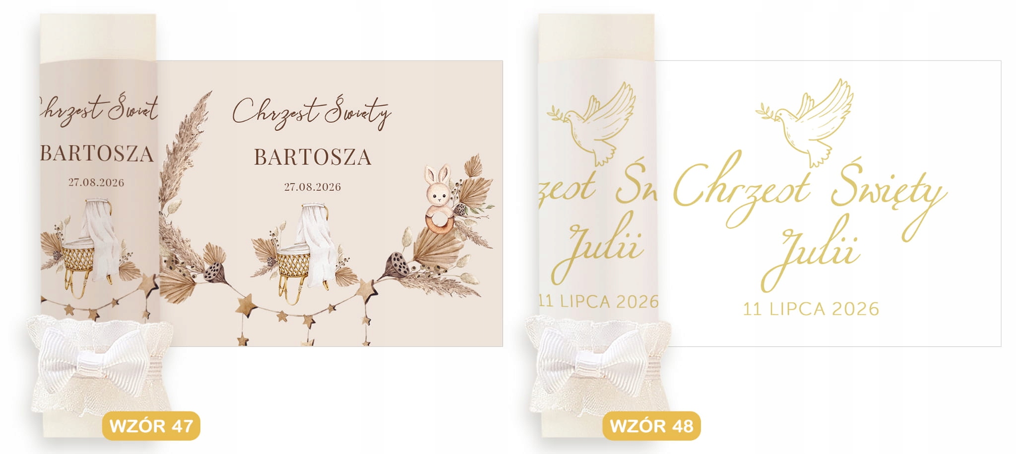 Свічка має етикетку з красивою графікою з нашої багатої колекції візерунків. Мотиви колекції підходять як для хрещення хлопчика, так і для дівчинки.