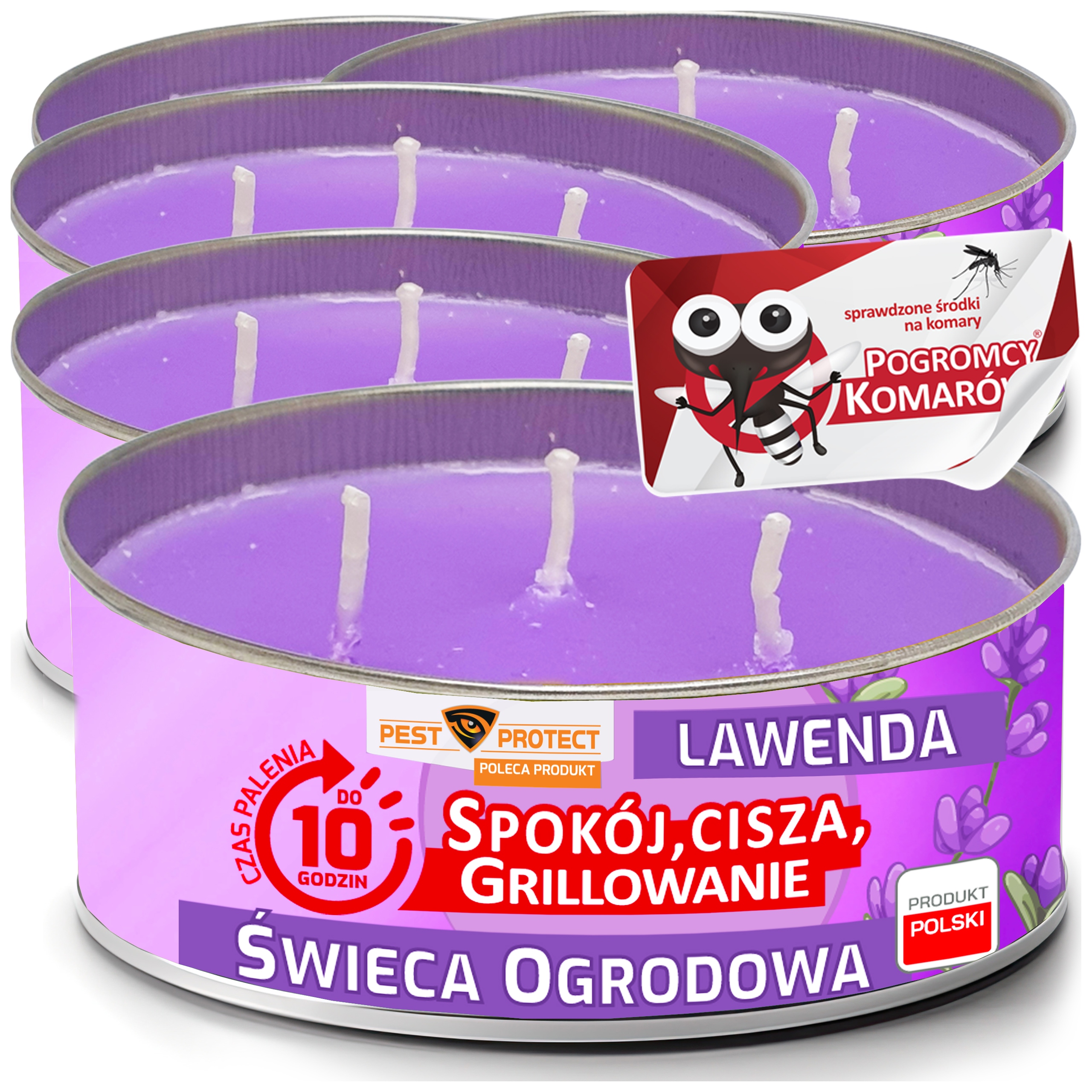 Ефективна та високоякісна садова свічка з вмістом масла лаванди + комари . Використання потрійного гніту в свічці впливає на інтенсивне вивільнення лавандової олії розчиненого в парафіні. Виробництво свічок використовувалося лише чистого парафіну .