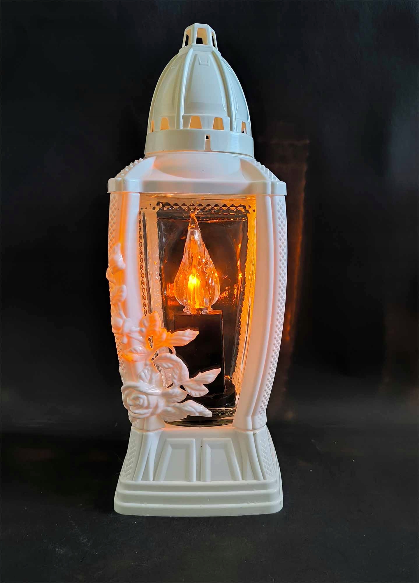 Каплиця для могили з густого і безбарвного скла. Білий кожух свічки був виготовлений з пластику і закінчився блиском. Свічка важка, міцна і добре зроблена.