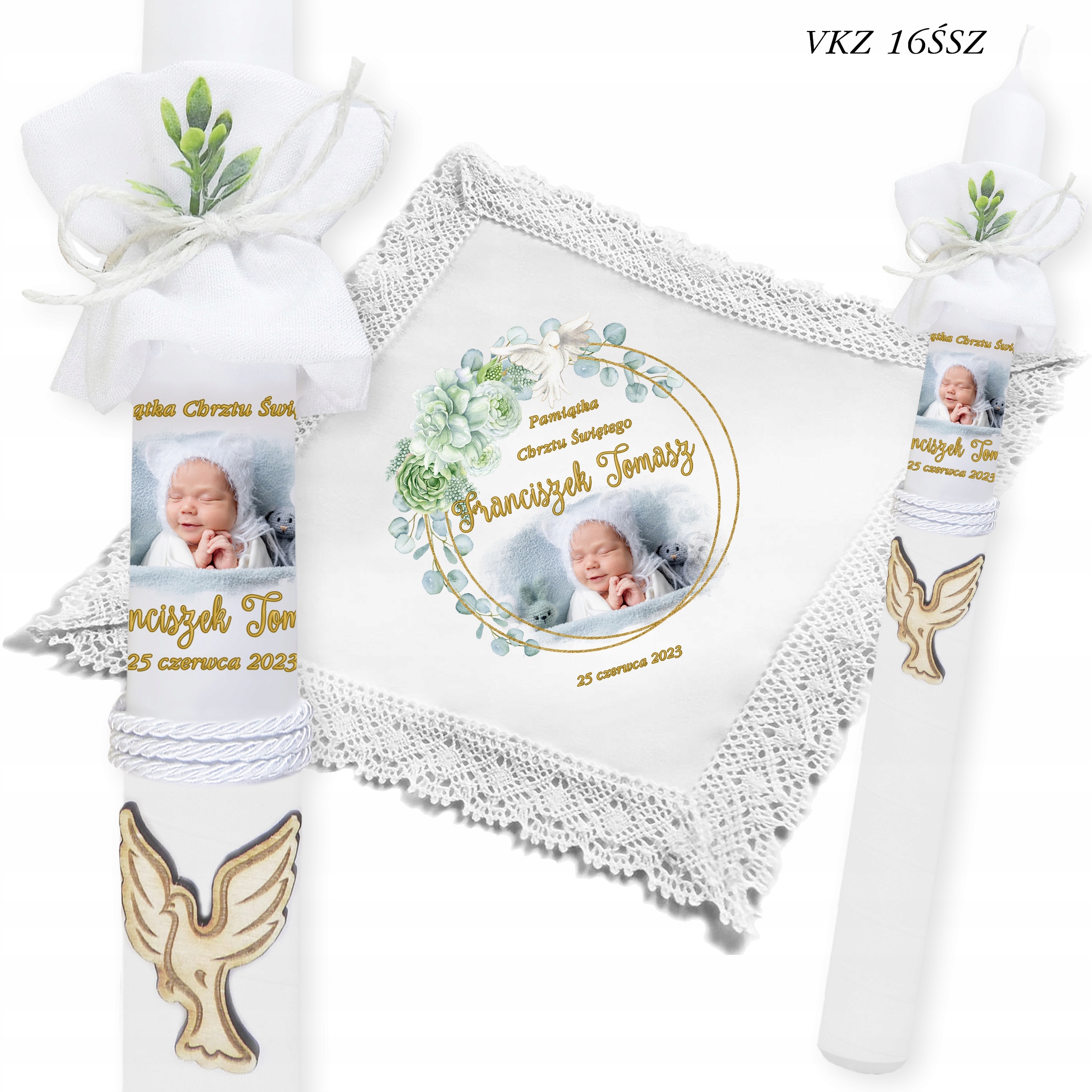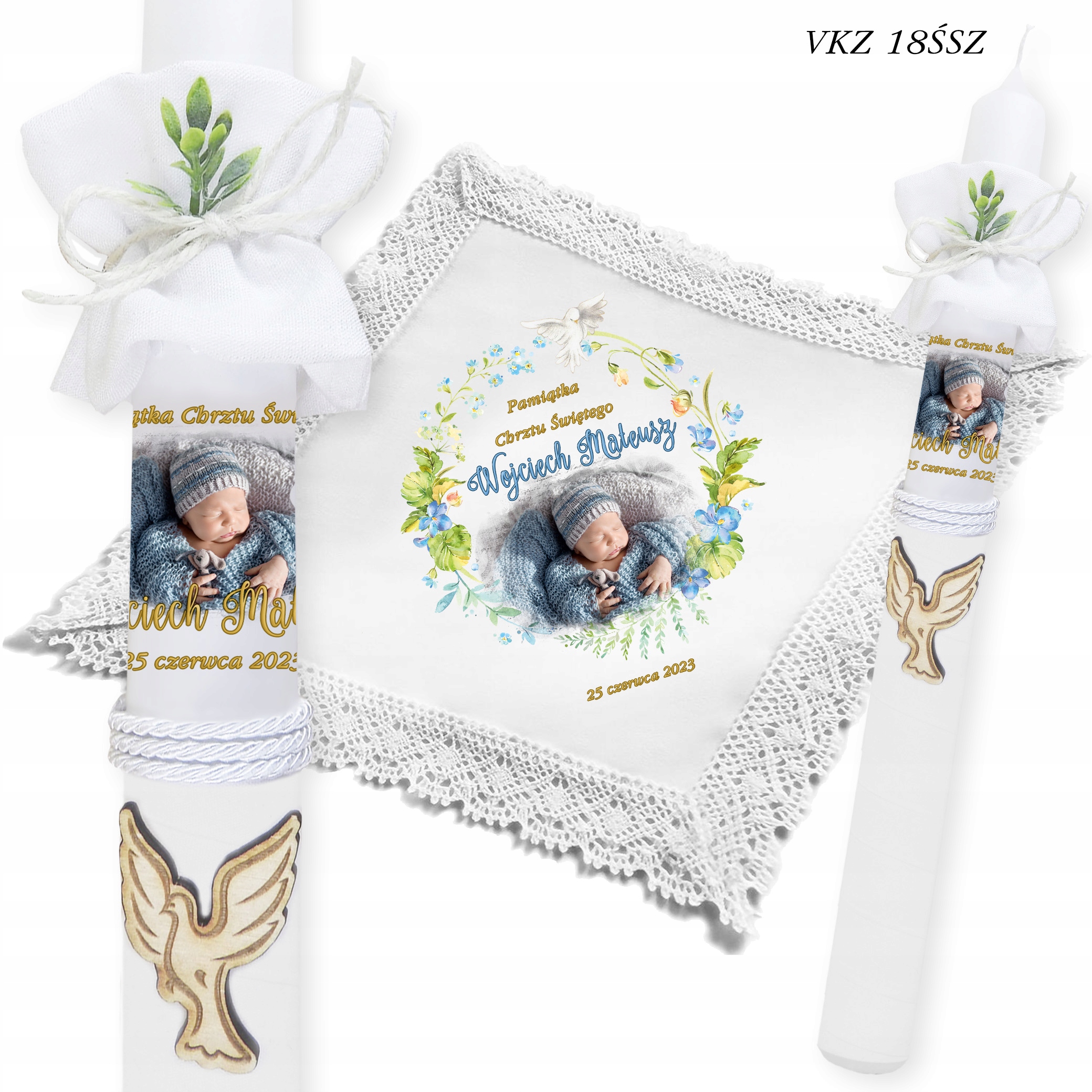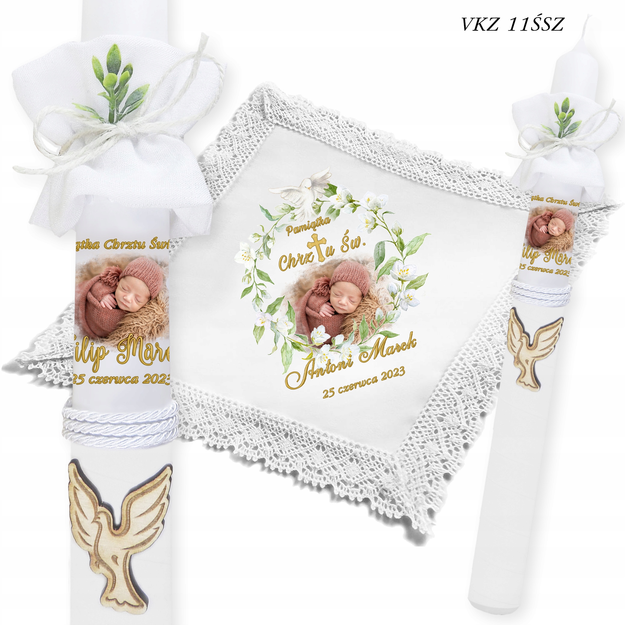- ✅ Свічка з фото дитини + імена + дата хрещення.