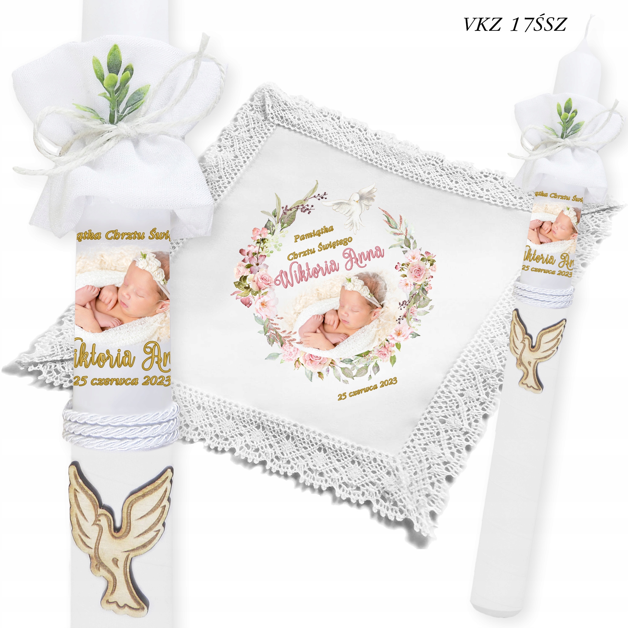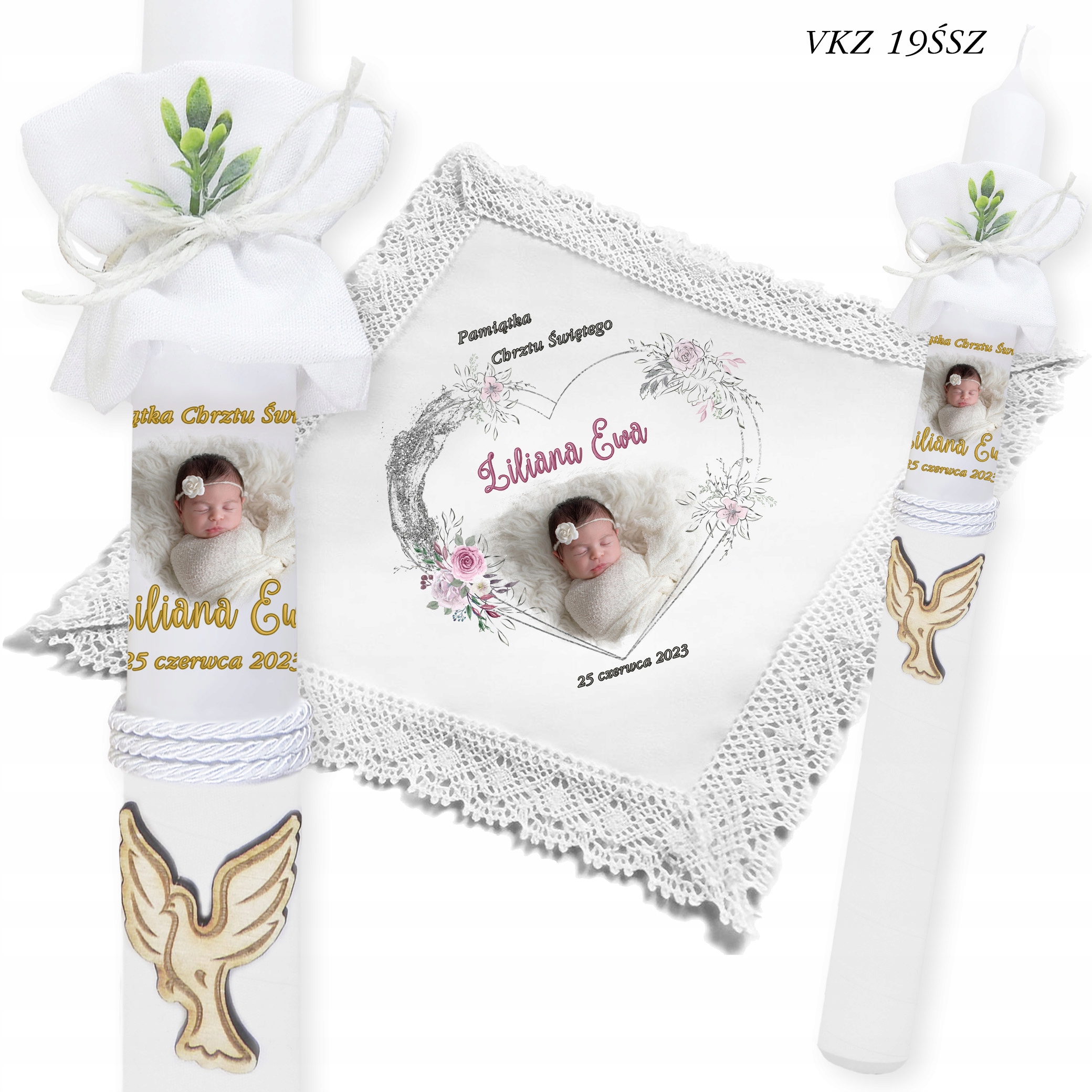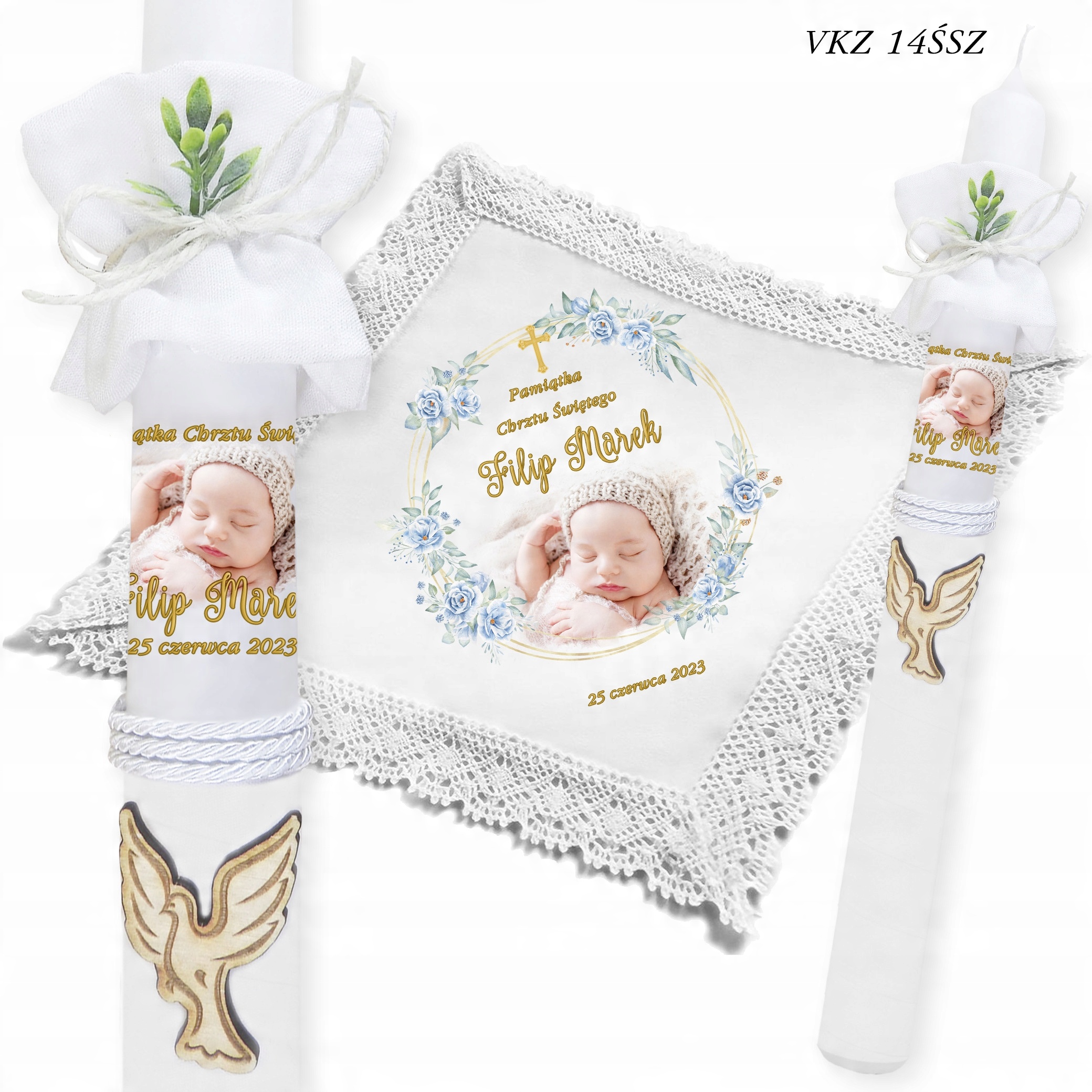 - ✅ Свічка з фото дитини + імена + дата хрещення.