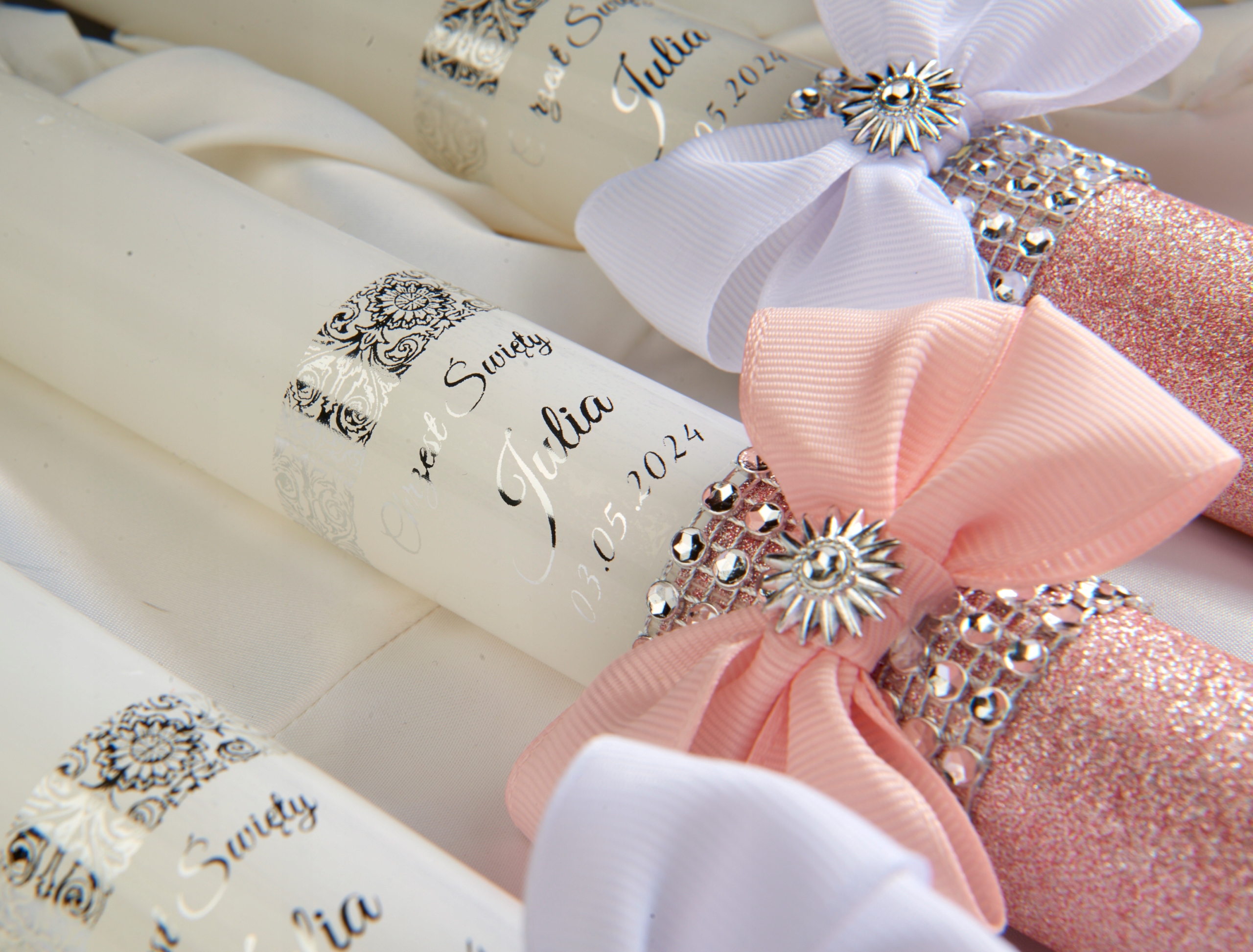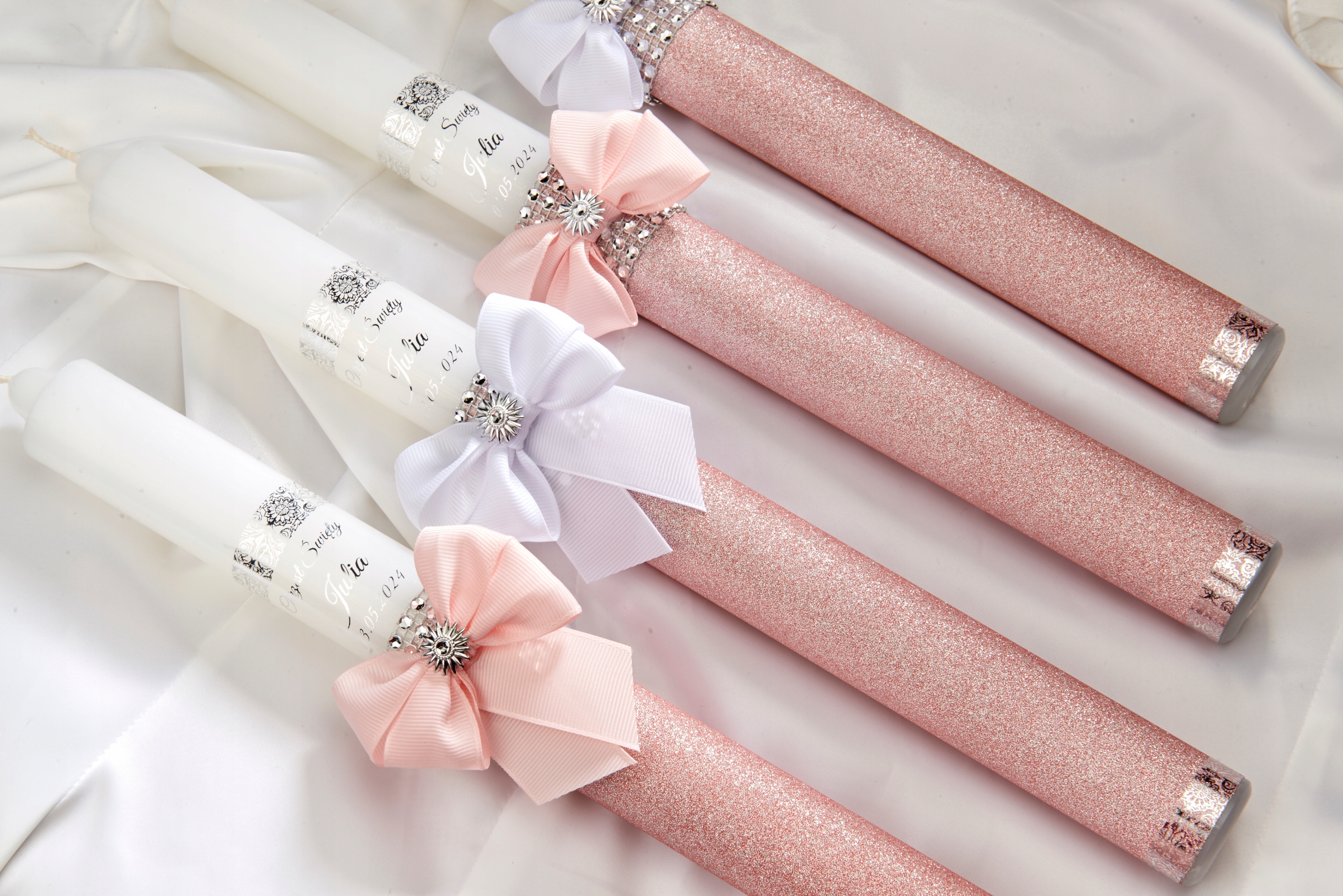 Свічка хрещення загорнута в пару, мерехтруючим порошковим рожевим кольором. Він прикрашений цирконовими смугами, які надають всій свічці елегантного гламурового характеру. Елегантний лук з прикрасою ювелірних виробів чудово доповнює ціле.