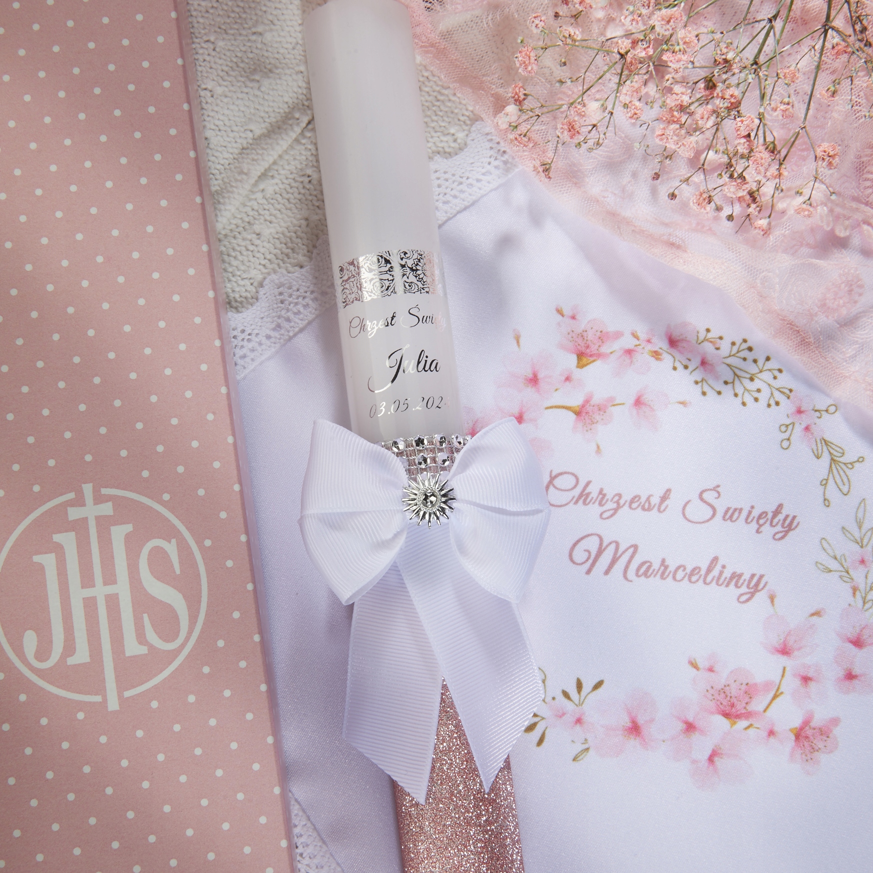 Гламурний набір містить свічку, білий халат із назвою та датою хрещення та коробкою для свічок. Ціле було зроблено з незвичною турботою та турботою про кожну деталь.