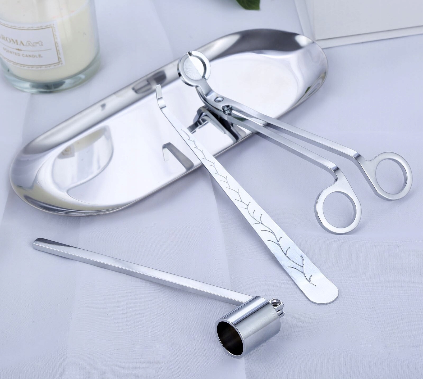 ➦ Класичний дизайн аксесуарів, простий у використанні з красивим блискучим сріблястим покриттям. Повний набір для догляду за свічками.