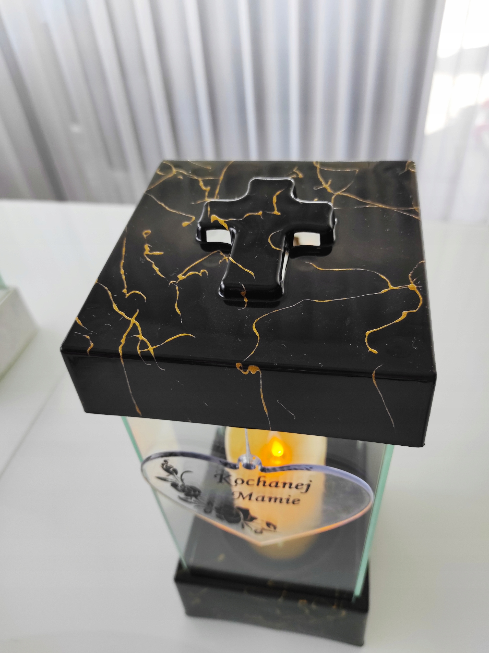 Красива свічка з чорного скла, прикрашена ручним розписом золотою ниткою та кулоном у формі серця з написом "Дорога мама". На задній стінці є дзеркало, яке відбиває світло свічки.