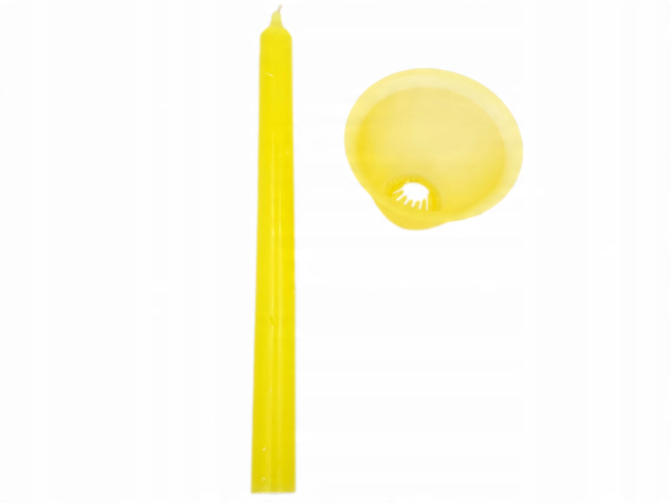 Свічка жовтого кольору довжиною 26 см, діаметром 2 см. Свічка постачається з жовтим чохлом, який захищає полум’я від вітру, а також діє як капелюшок.