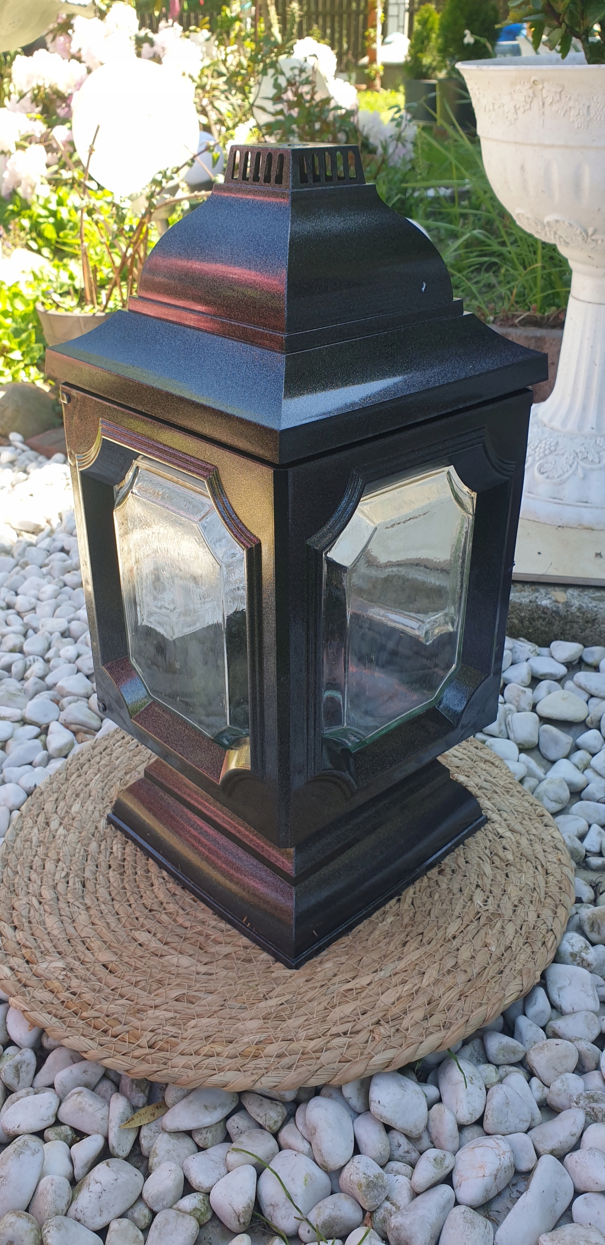 Вона виготовлена з безбарвного скла та підставка та захист від вітру з твердого пластику.