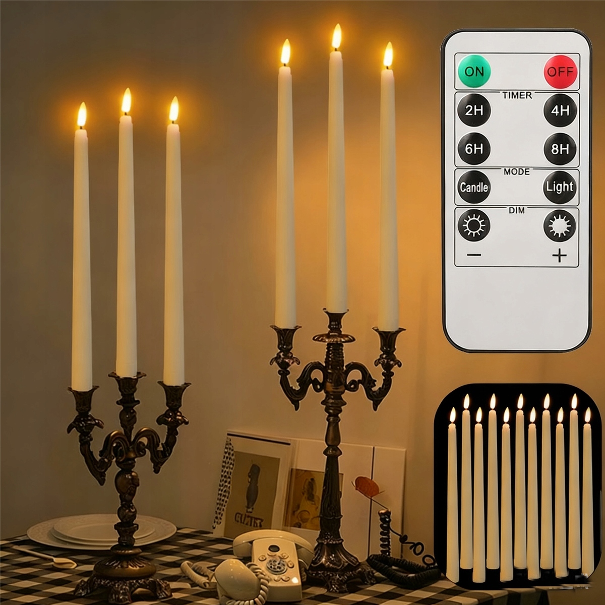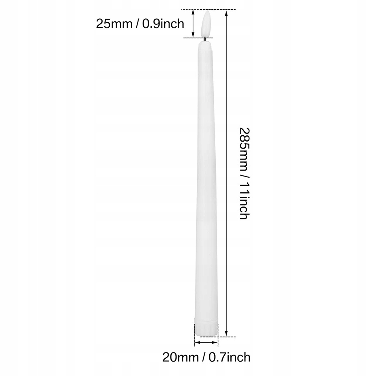 Імітований 3D-чорний гніт забезпечує реалістичний вигляд. Діаметр 20 мм x висота 285 мм, підходить для різних конічних підсвічників і люстр. Ідеальна заміна традиційних конічних свічок. Набір із 6 безполум’яних конічних свічок із високоякісного пластику кольору слонової кістки, які повільно мерехтять і виглядають красиво та реалістично.