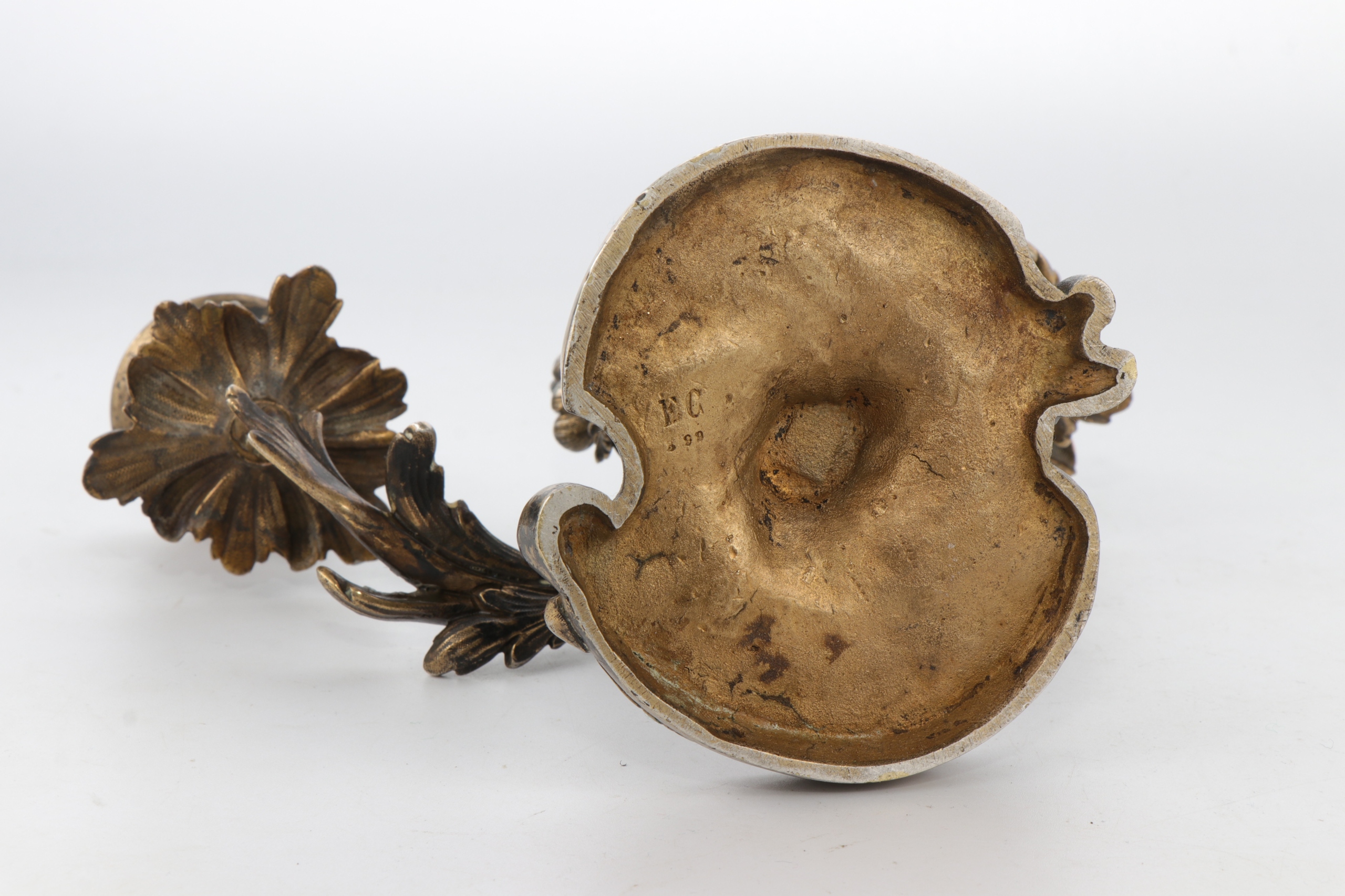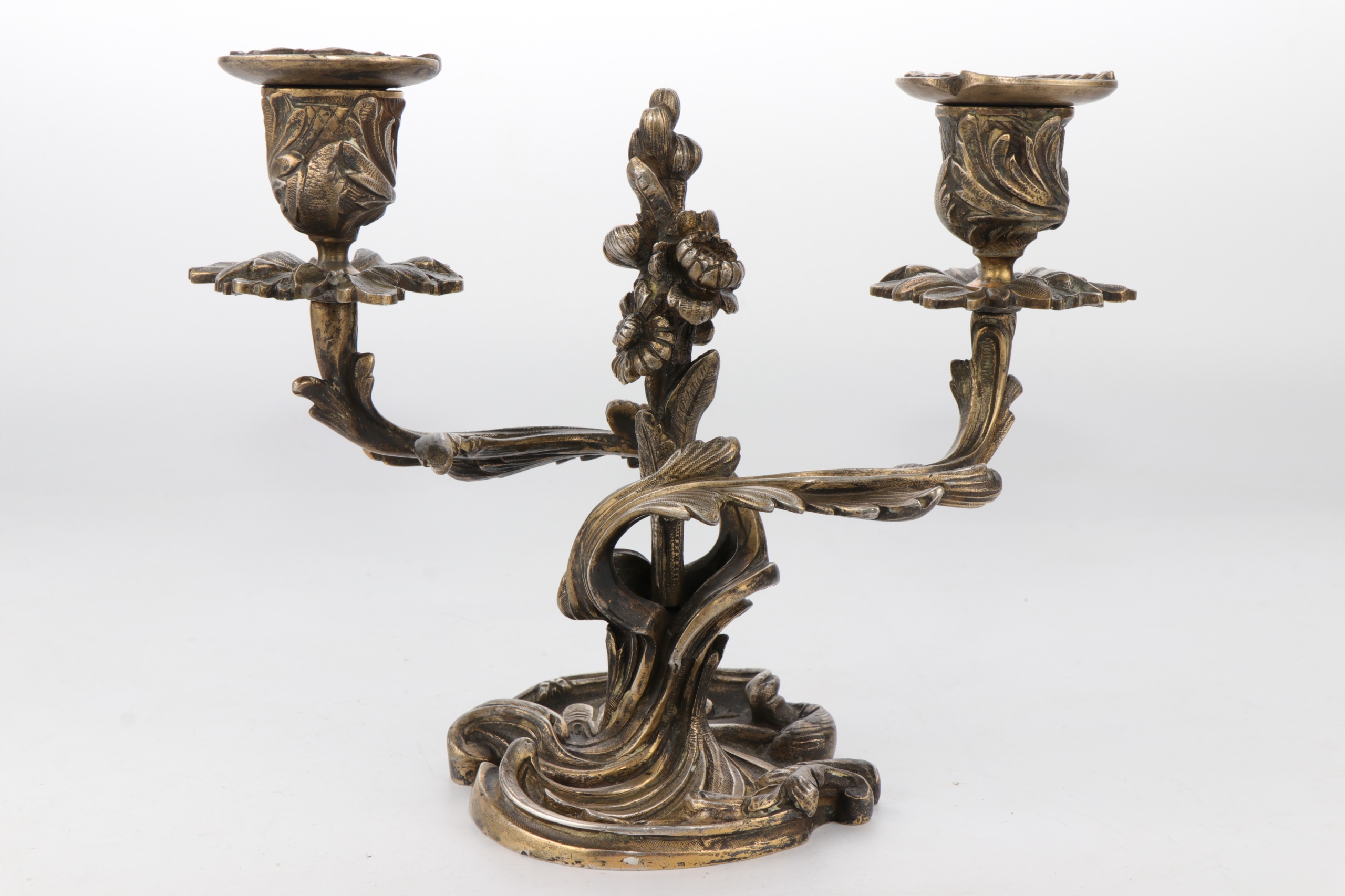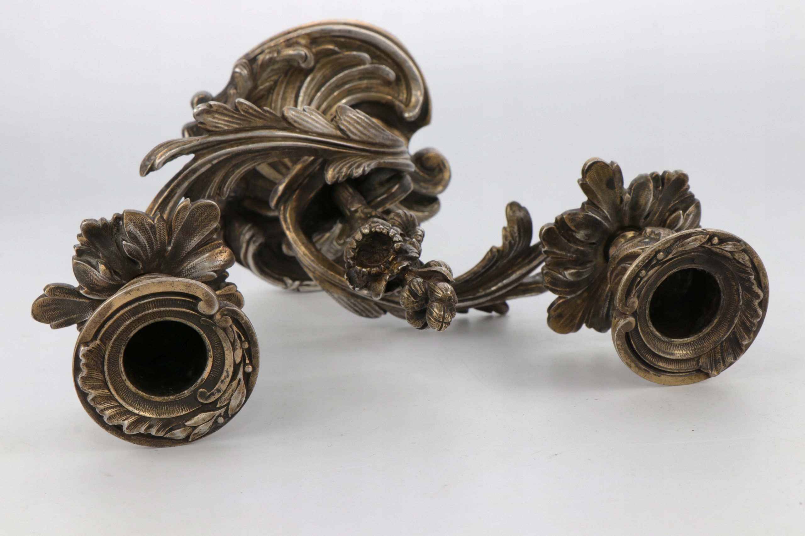 Цікавий двораменний свічник з декором рококо. Підсвічник із посрібленої бронзи, підпис EC 399. Бронза дуже ретельно оброблена, поверхня з численним різьбленням.