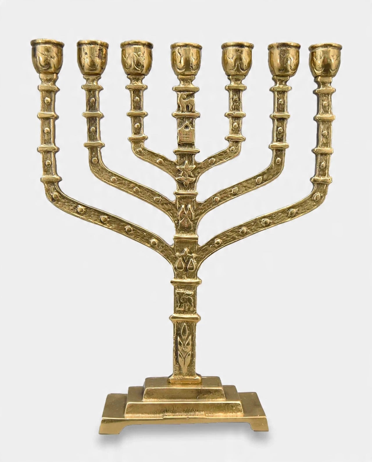 Унікальний латунний семираменний канделябр, прикрашений символічними невеликими барельєфами. Гарно зроблено, дуже акуратно, з увагою до найменших деталей. Багато прикрашений, він має багато красивих деталей. Він справляє чудове естетичне враження та має позачасовий стиль. Підходить для багатьох інтер'єрів. Він дозволяє отримати атмосферне освітлення. Використовується для церемоніальних цілей у єврейській культурі.