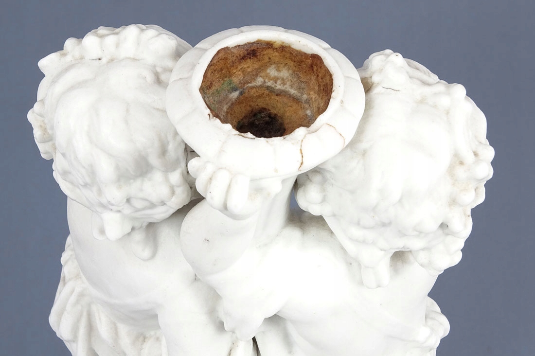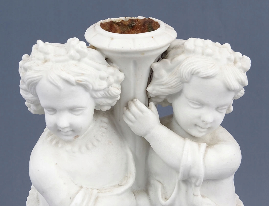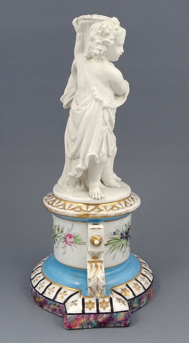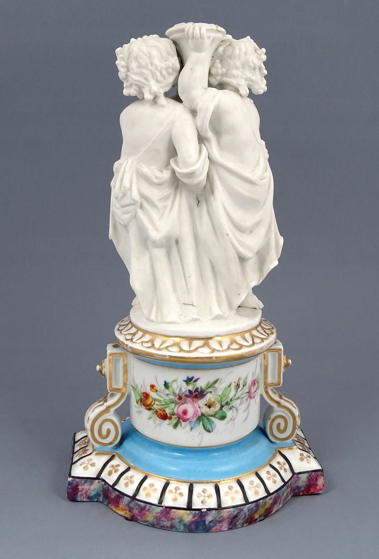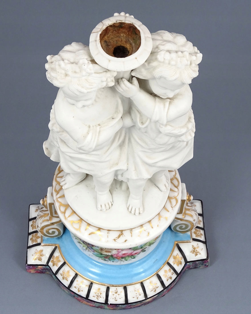 розміщений на круговому порцеляні, прикрашеному барвистими квітами, з двома ручками з боків, з пофарбованим квітковим букетом з спереду і ззаду, на білому циліндричному валу. На круглої основи з позолотою, фігура з двох духів, виготовлених з Бісквіта, і стовпчик між ними з пробілом для свічки. > Розміри: 34 х 19 х 15,5 см. Фіксована Бісквітова Коламітка, незначні потертості позолоти та живопису.