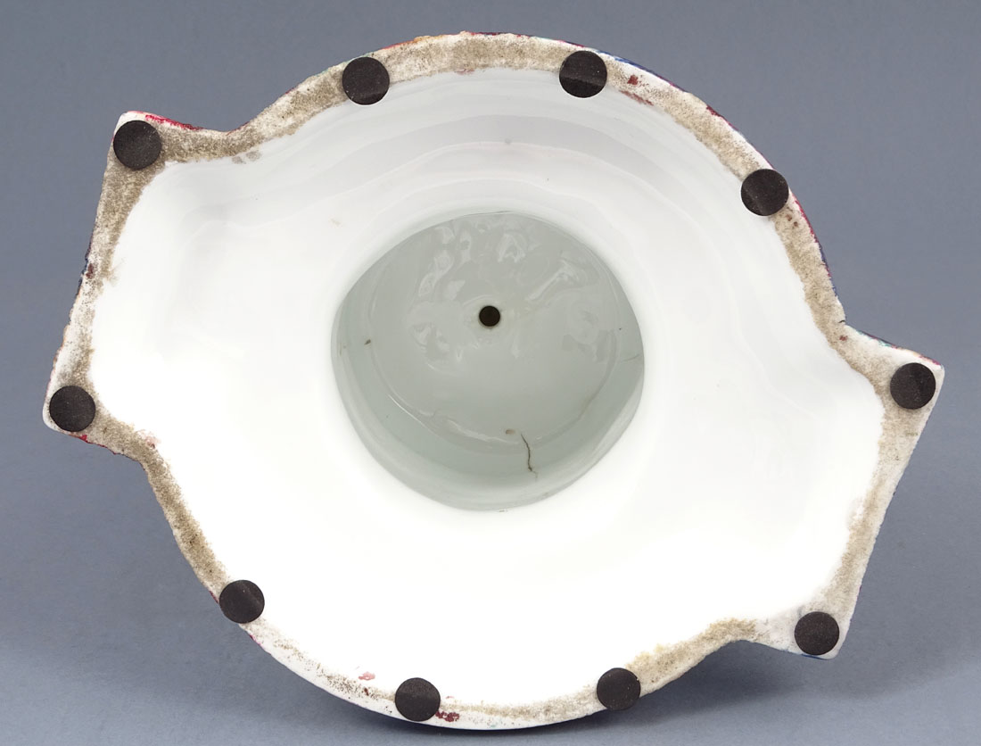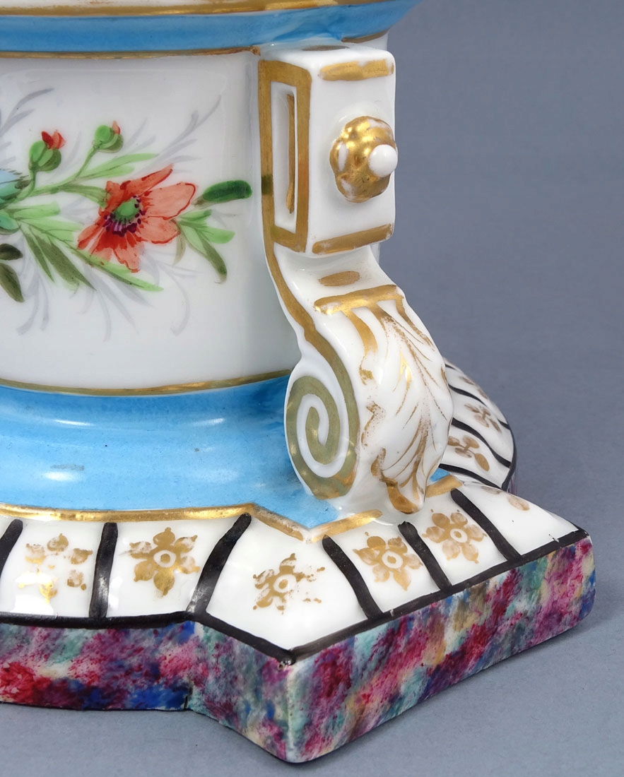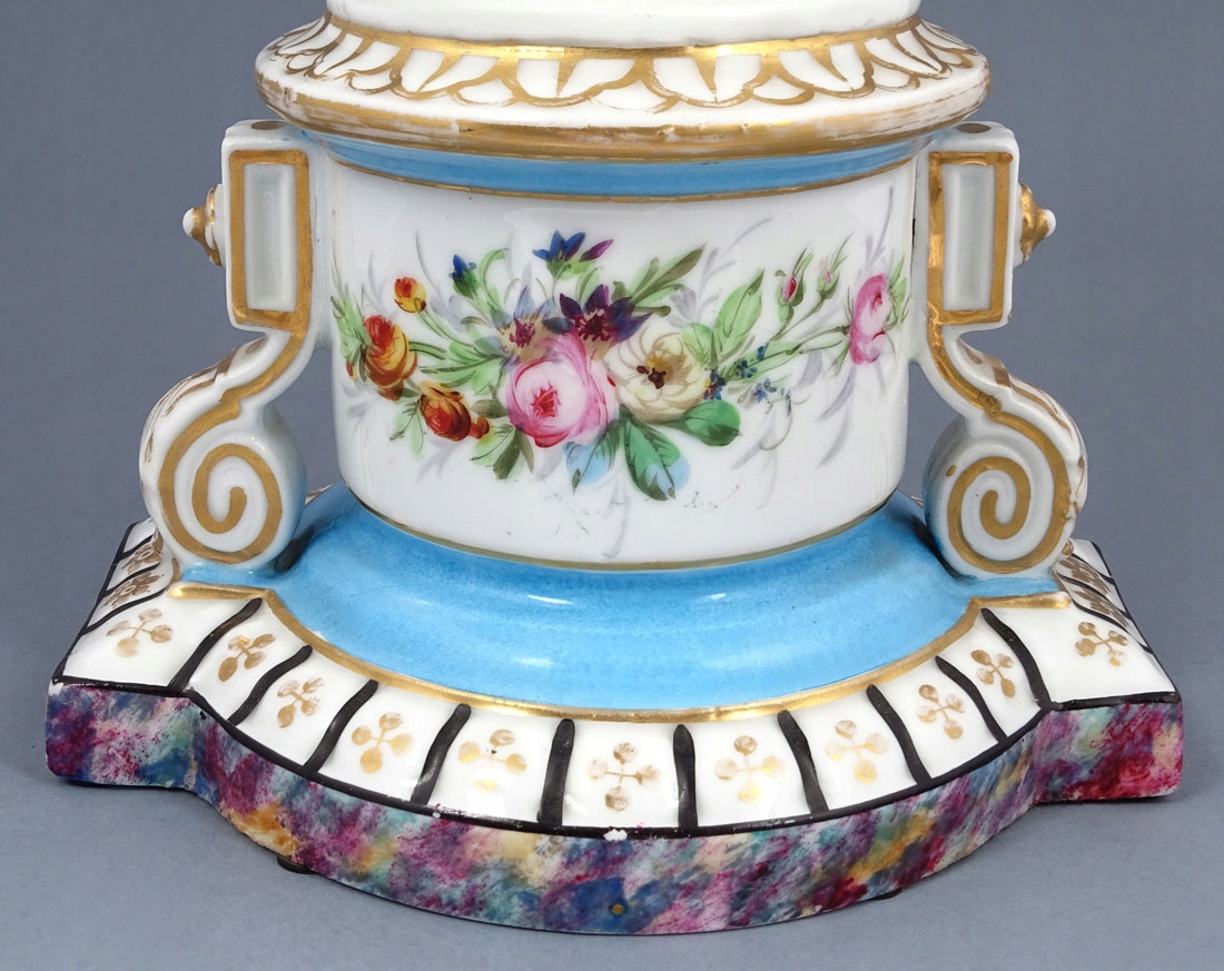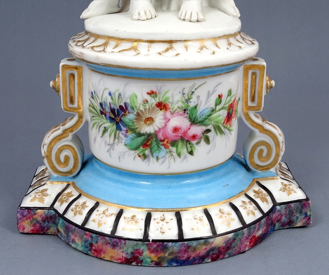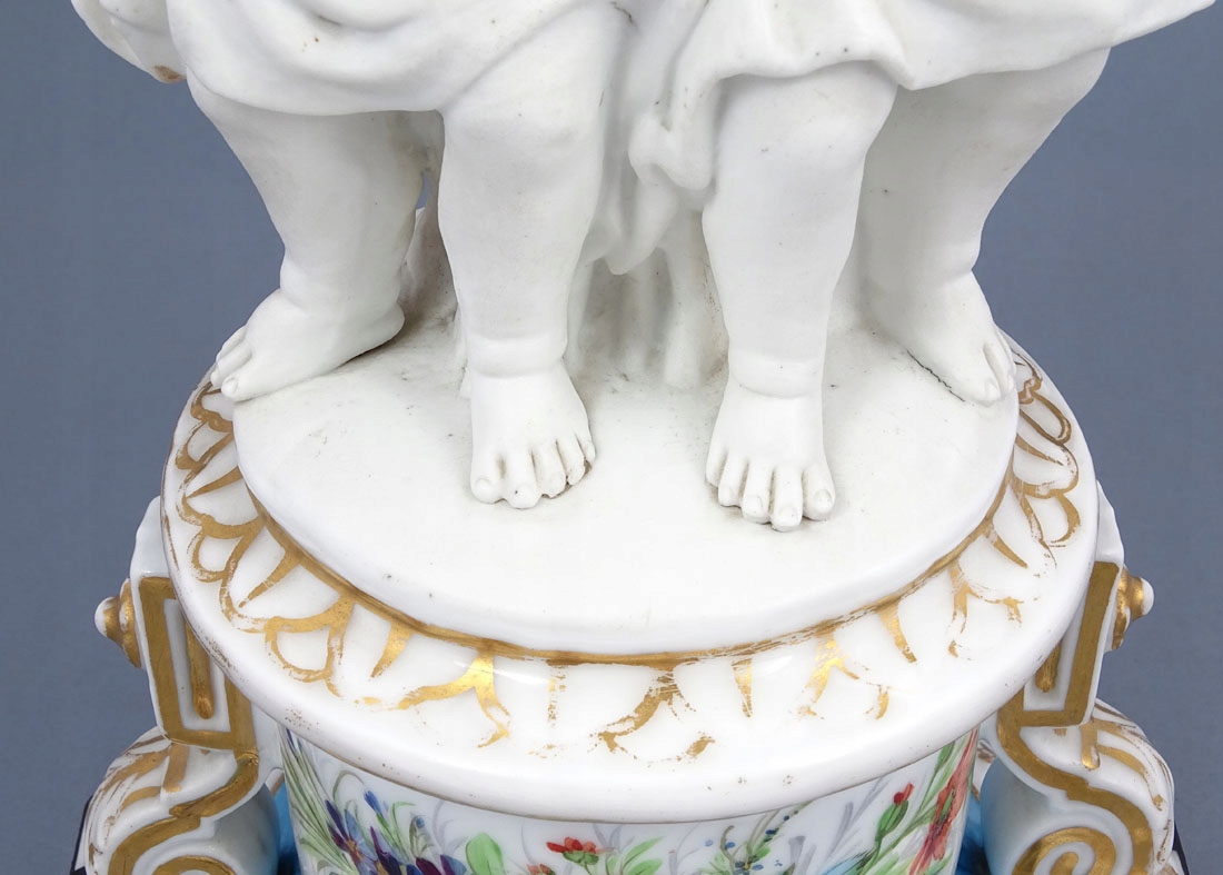 розміщений на круговому порцеляні, прикрашеному барвистими квітами, з двома ручками з боків, з пофарбованим квітковим букетом з спереду і ззаду, на білому циліндричному валу. На круглої основи з позолотою, фігура з двох духів, виготовлених з Бісквіта, і стовпчик між ними з пробілом для свічки. > Розміри: 34 х 19 х 15,5 см. Фіксована Бісквітова Коламітка, незначні потертості позолоти та живопису.
