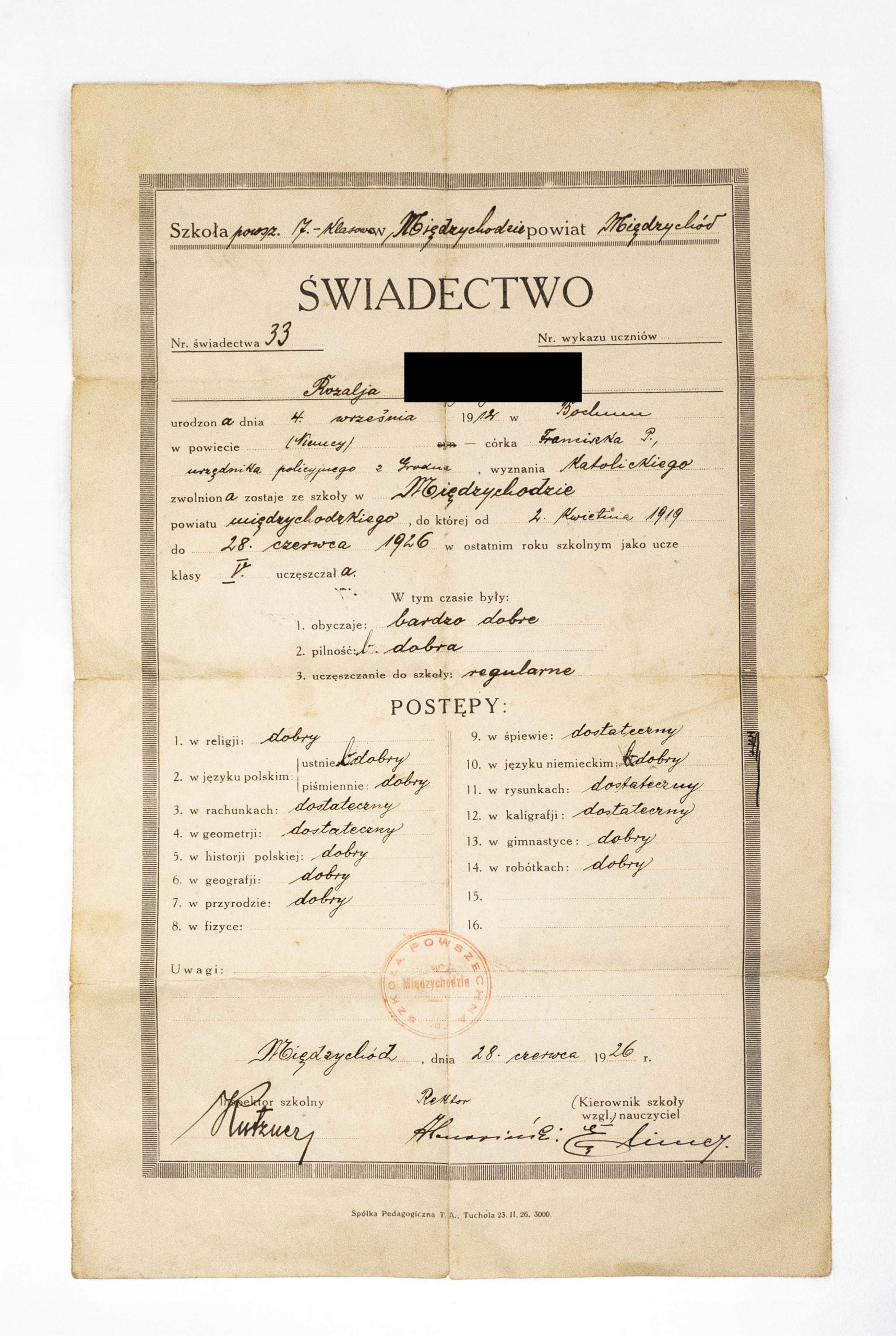 СВІДОЦТВО - ПОЧАТКОВА ШКОЛА, МИДЗИЧОД 1926 р.