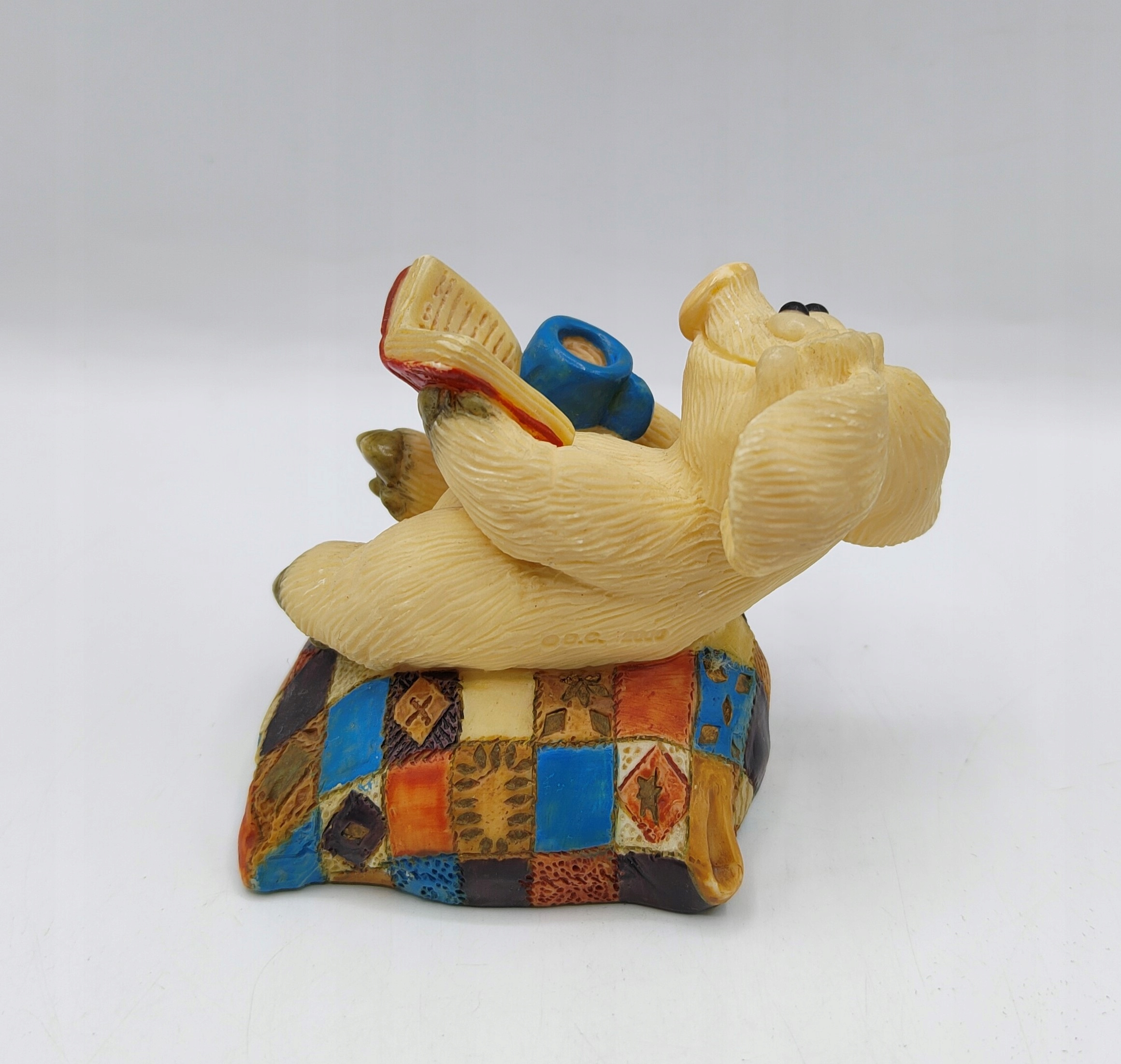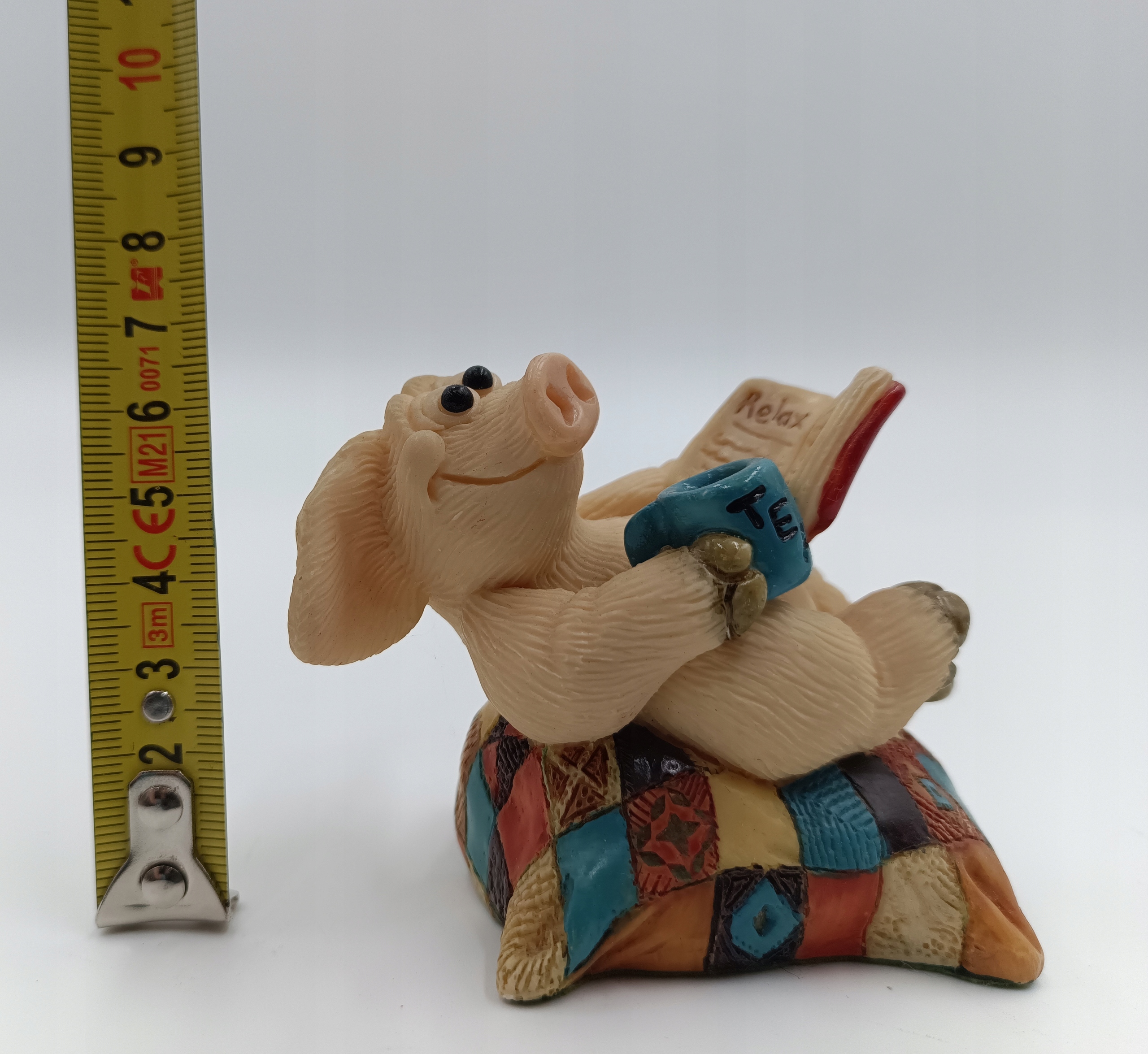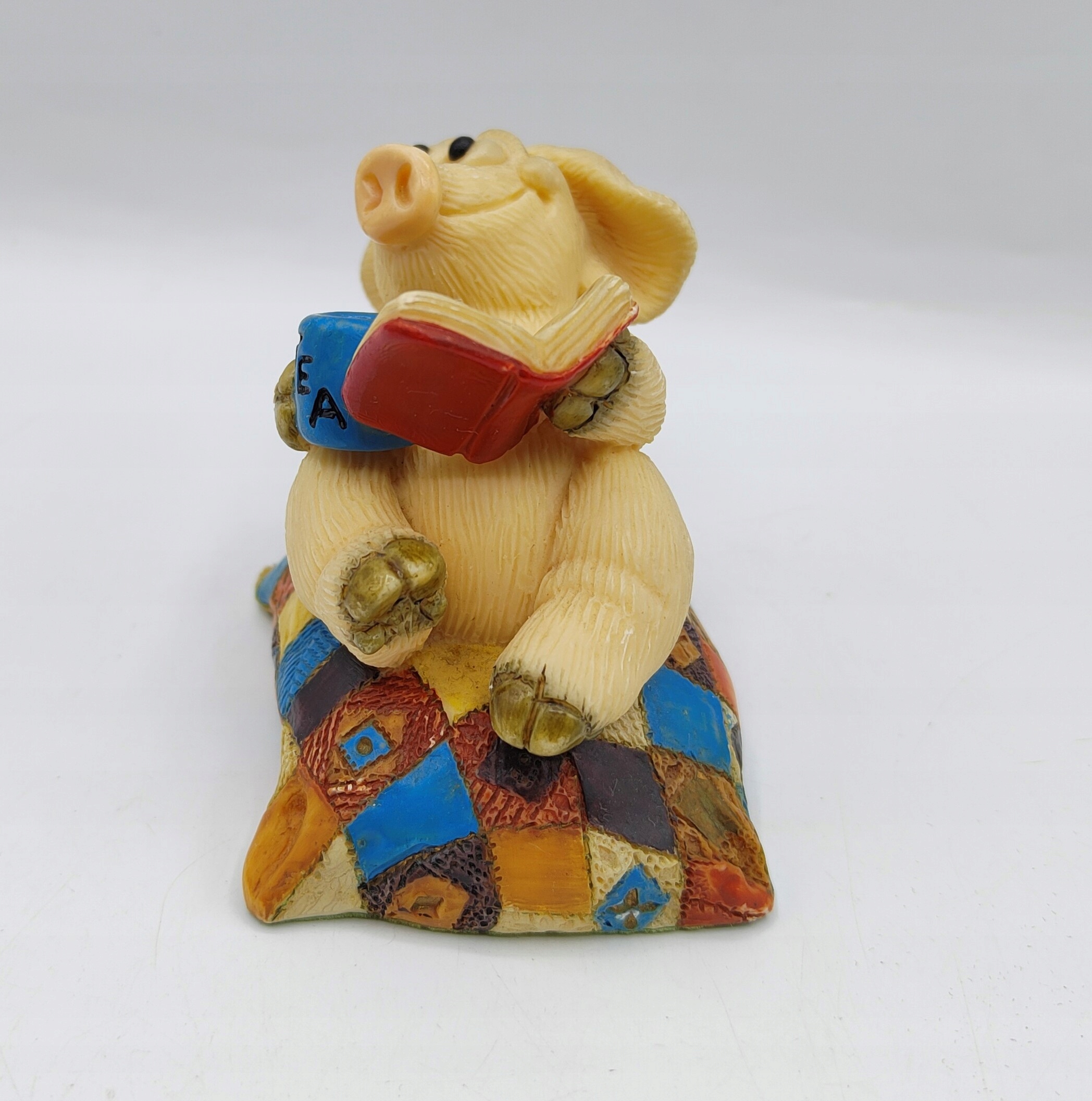Свинка відпочиває, п'є чай і читає. Підписана колекційна статуетка