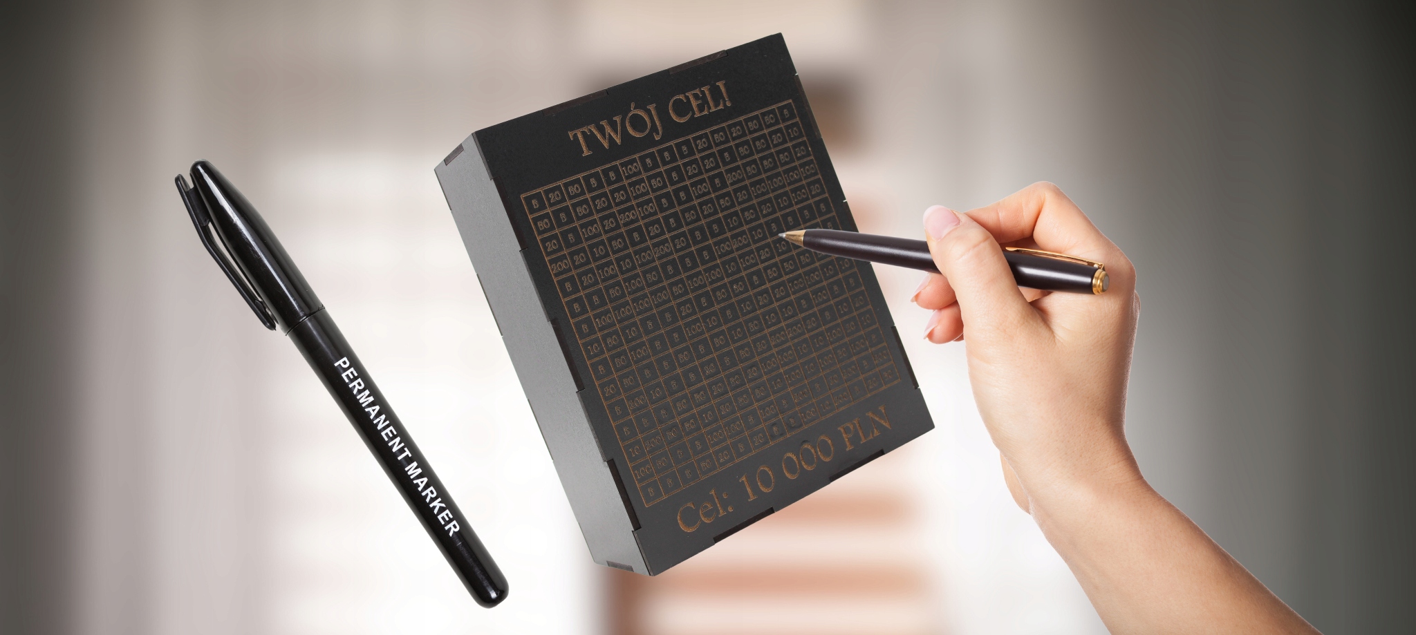 Прикріплена ручка дає вам можливість відзначити прогрес або додати особисті нотатки на скарбничку.