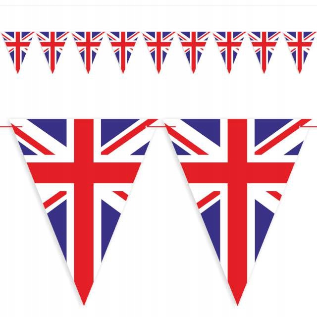 Банер із серії «Країни світу» у вигляді трикутних вимпелів на стрічках із нанесеним на них прапором Великобританії. Його довжина 3,6 метра + зав'язки з боків. Загальна довжина 5 м. Один прапор має розміри 20х25 см, розділені стрічкою. У наборі 9 прапорців. На кожному з них є односторонній принт прапора. Ідеальна прикраса для тематичної вечірки або важливого спортивного заходу.