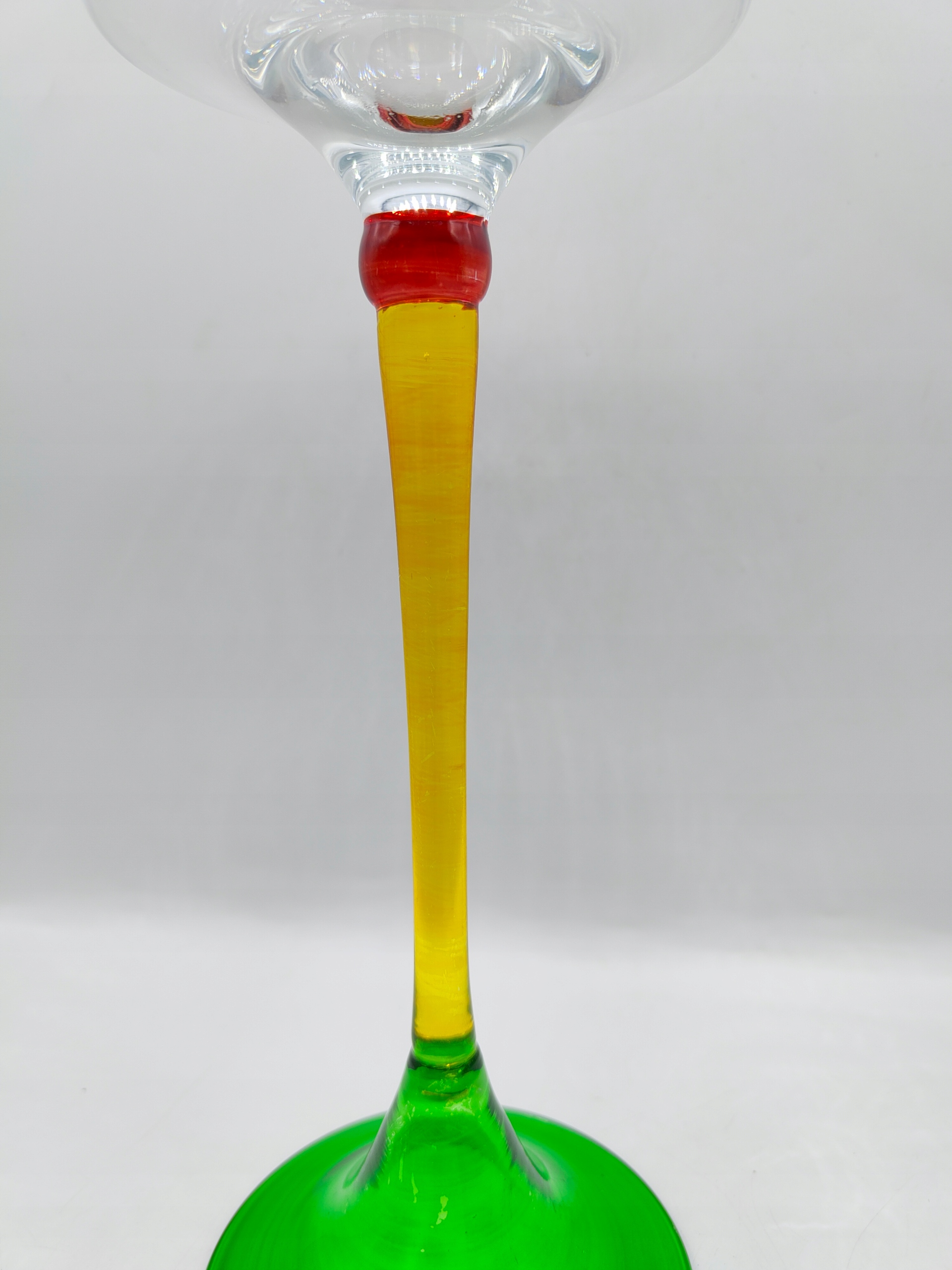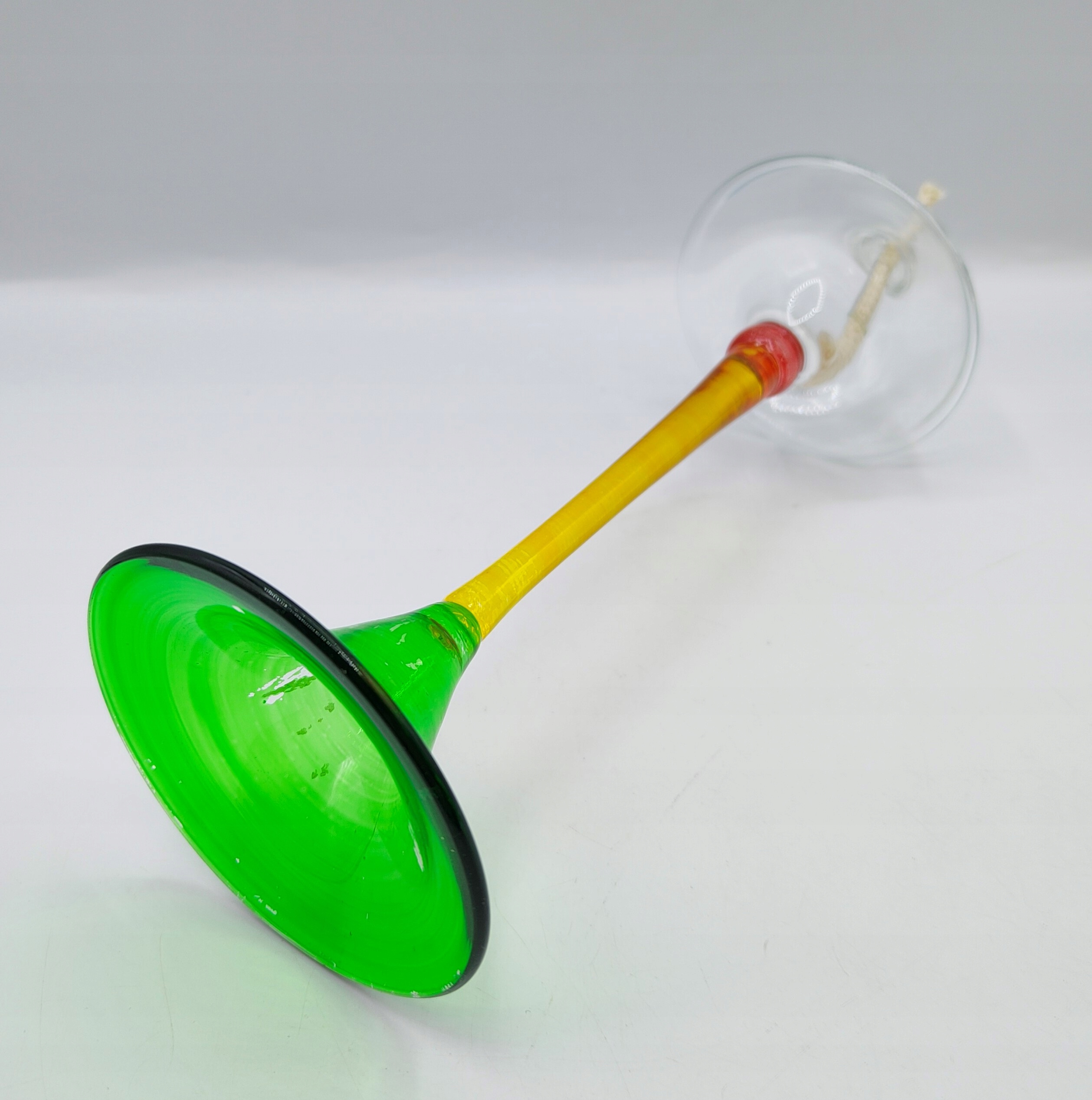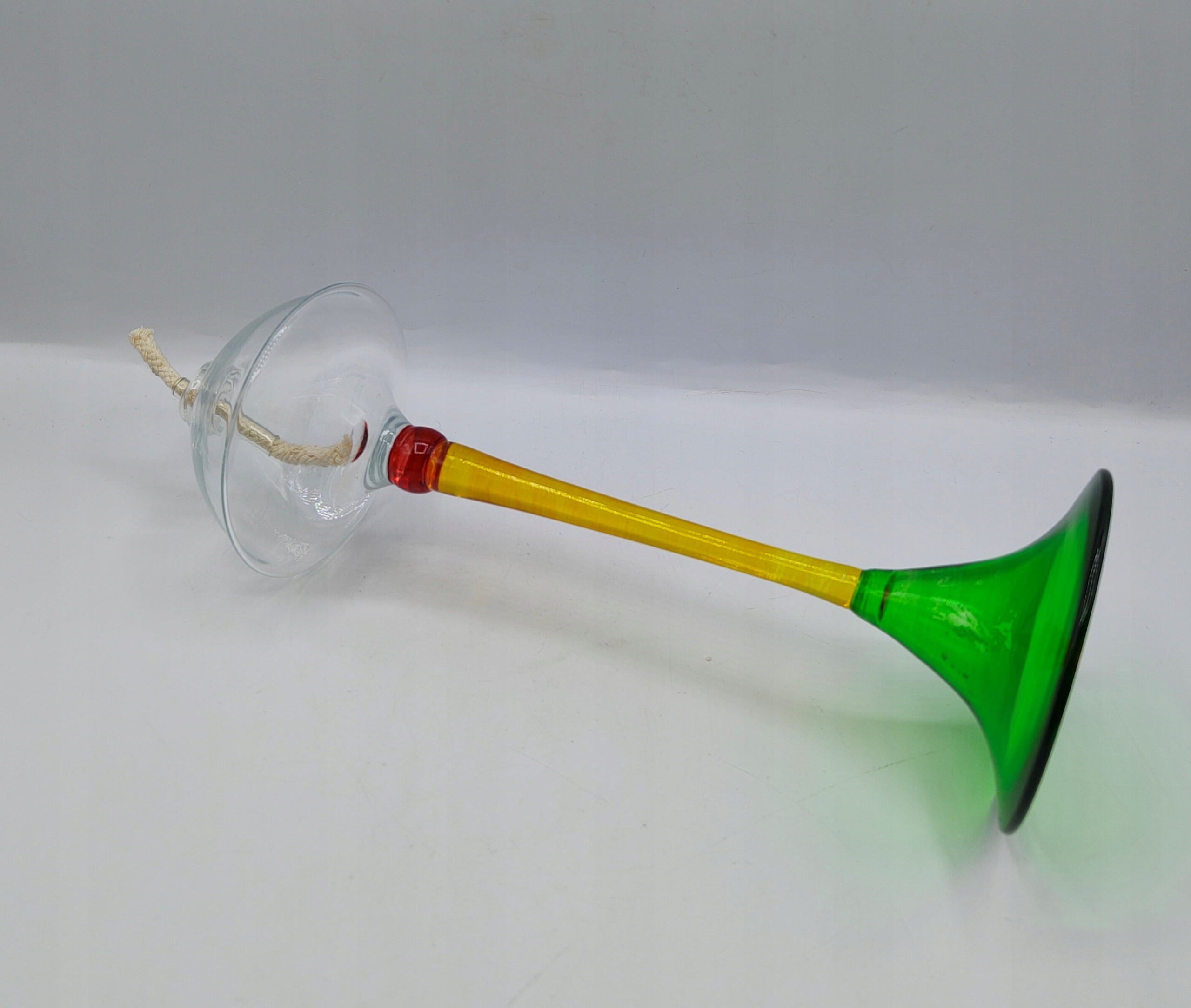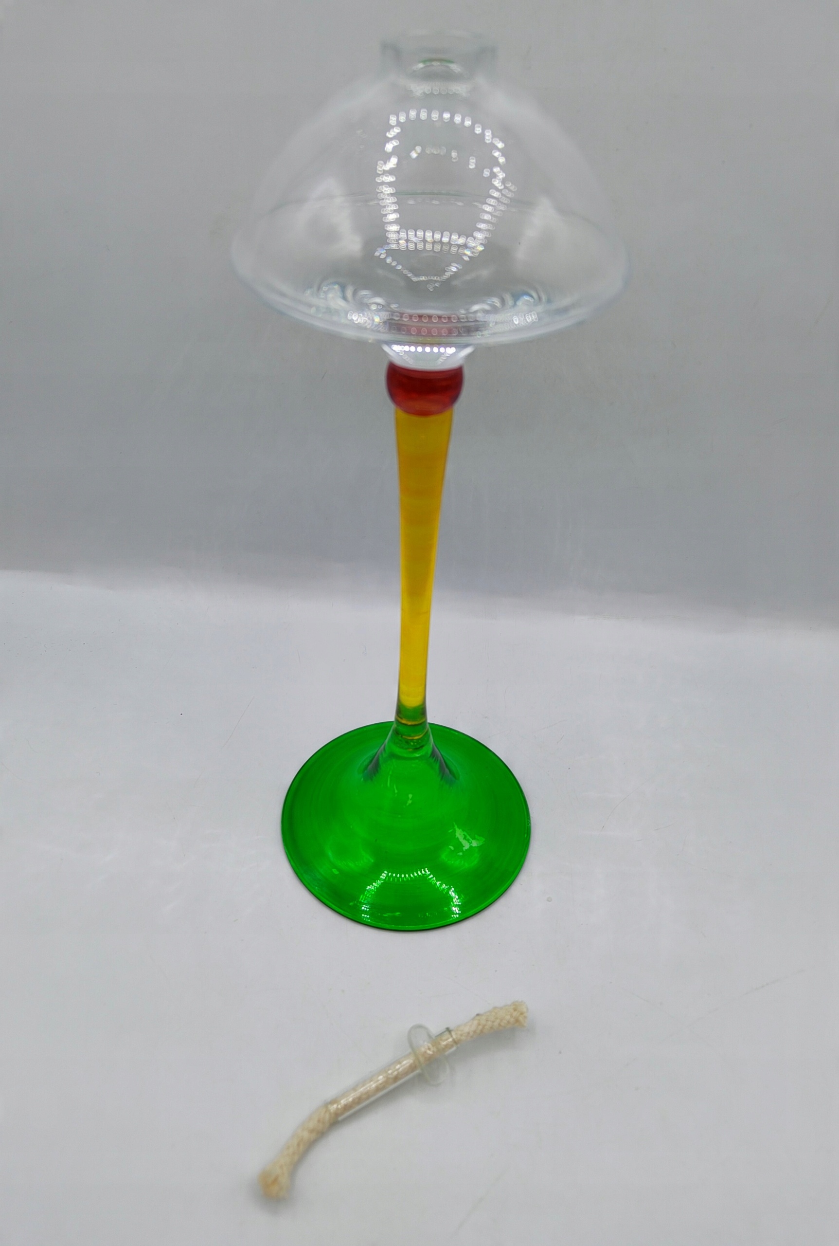 Вінтажний предмет. Світильник зі скла. Висота 24,5 см, діаметр верху 11 см, діаметр основи та верху 8,7 см, вага 200 грам. Носик також скляний. Розмальоване скло, невелика зміна кольору фарби на зеленій основі, мене це абсолютно не бентежить і практично непомітно в стоячому світильнику ;) - на склі ніде немає пошкоджень і відколів. У житті виглядає так само красиво, як і на фотографіях. Колекційний, утилітарний (новий гніт включений). Рекомендую!