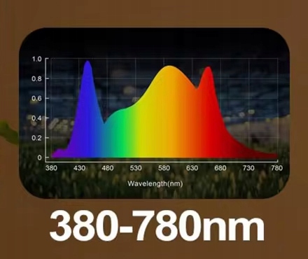 380-780 нм - повний спектр світла від ультрафіолетового до інфрачервоного, який підтримує всі фази росту рослин, від проростання до цвітіння.